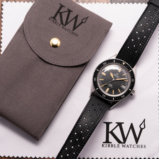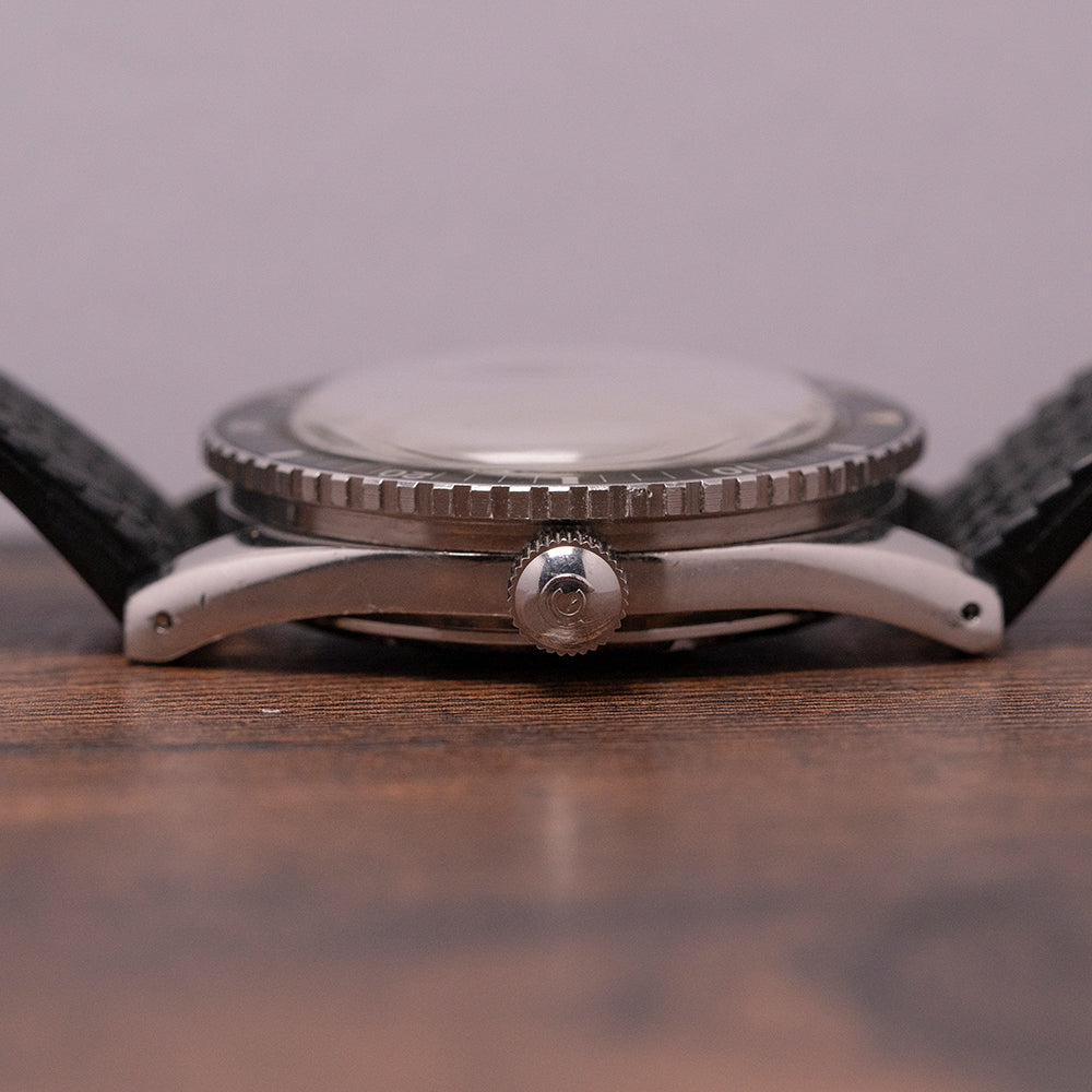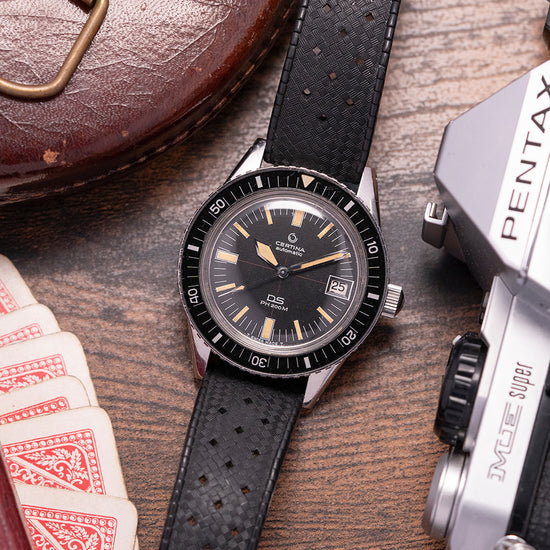Here we have a 1966 Certina DS PH200M 5801 117 Bakelite & Tritium with a 40mm stainless steel case that curves over your wrist with finely tapered drilled lugs. The case was made by the Huguenin brothers in Le Locle, Switzerland, as per the stamp on the inside of the case back, the Huguenin Freres company ran from 1868 until 1999 and also made cases for Universal Geneve, Omega and Zenith. A lug-to-lug length of 47.5mm and a case thickness of 13.5mm ensures a comfortable fit on your wrist. On the right side is a signed crown, and the rotating stainless steel bezel has its fantastic original Bakelite 60-minute scale insert with white numerals and an inverted Tritium-coated triangle at 12 o’clock. The domed crystal sits above a black dial with a red crosshair, an outer minute track has baton indexes coated in Tritium marking the hours, and at 3 o’clock a framed date window perfectly balances this striking dial. Large sword hands infilled with Tritium are complemented by an arrow pointed sweeping second hand. At 12 o’clock we have the Certina motif with “Certina Automatic” printed underneath and at 6 o’clock “DS PH200M” completes this stunning vintage dive tool watch. The DS stands for “Double Security” with reference to the innovative floating movement design and the robust nature of the watch, and the PH stands for “Pression Hydrostatique 200m”. On the reverse, a screw-down case back with a wave pattern and the Certina DS Turtle embossed in the centre, inside an automatic Certina Cal. 25-651, beating at 19,800 beats per hour. The watch comes paired on a period correct 19mm Tropic rubber strap with its original Certina buckle.