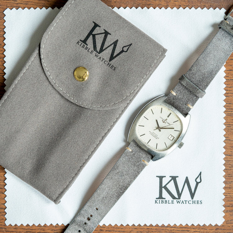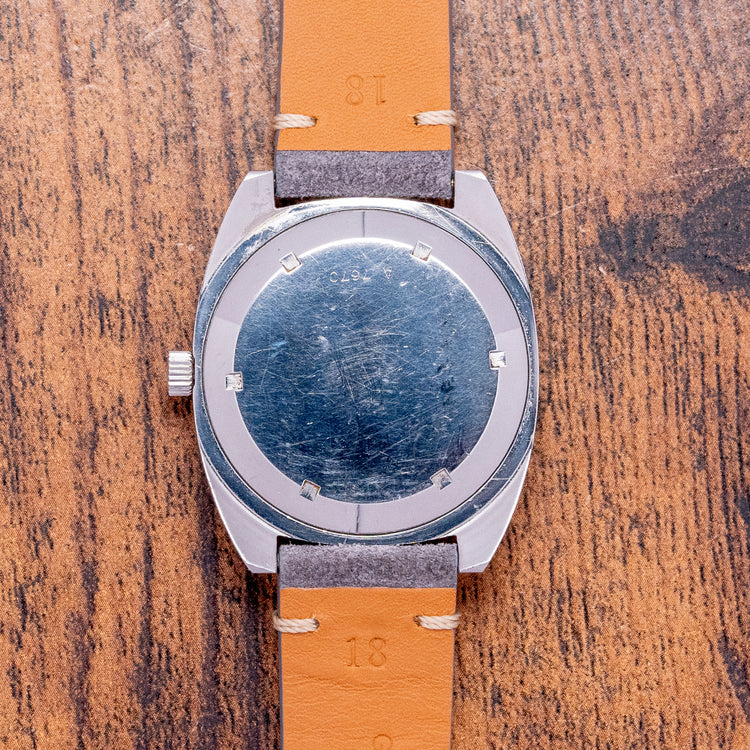 Here, we have a 1970s Ulysse Nardin 36000 Chronometer with a curvaceous brushed 35mm stainless steel Cushion Case. Thanks to its 40.5 mm lug-to-lug length and 10 mm case thickness, it sits comfortably on your wrist, and on the right side, a signed coin-edge crown is sitting slightly recessed. The top of the case has vertical brushing, creating an attractive effect: being bezel-less forms a seamless transition from the case to the flat crystal that sits above a vertically brushed silver dial. An outer minute track has applied polished and brushed facet-edged baton indexes marking the hours. At 3 o’clock, a date window. Slender steel baton hands are complemented by a tapered sweeping second hand. We have the Ulysse Nardin Anchor motif at noon, “Automatic” printed underneath and “36,000 Officially Certified Chronometer” at 6 o’clock. On the reverse, a screw-down case back, inside an automatic Ulysse Nardin Cal. NB 11 QU, 25 jewels, beating at 36,000, based on the ETA Cal. 2826, this quality movement has a screwless Glucydur balance, a flat hairspring and an eccentric screw for fine regulator adjustment. It comes paired with an 18mm vintage-style suede strap and pin buckle.