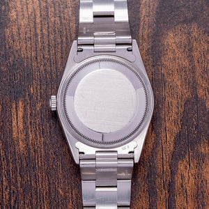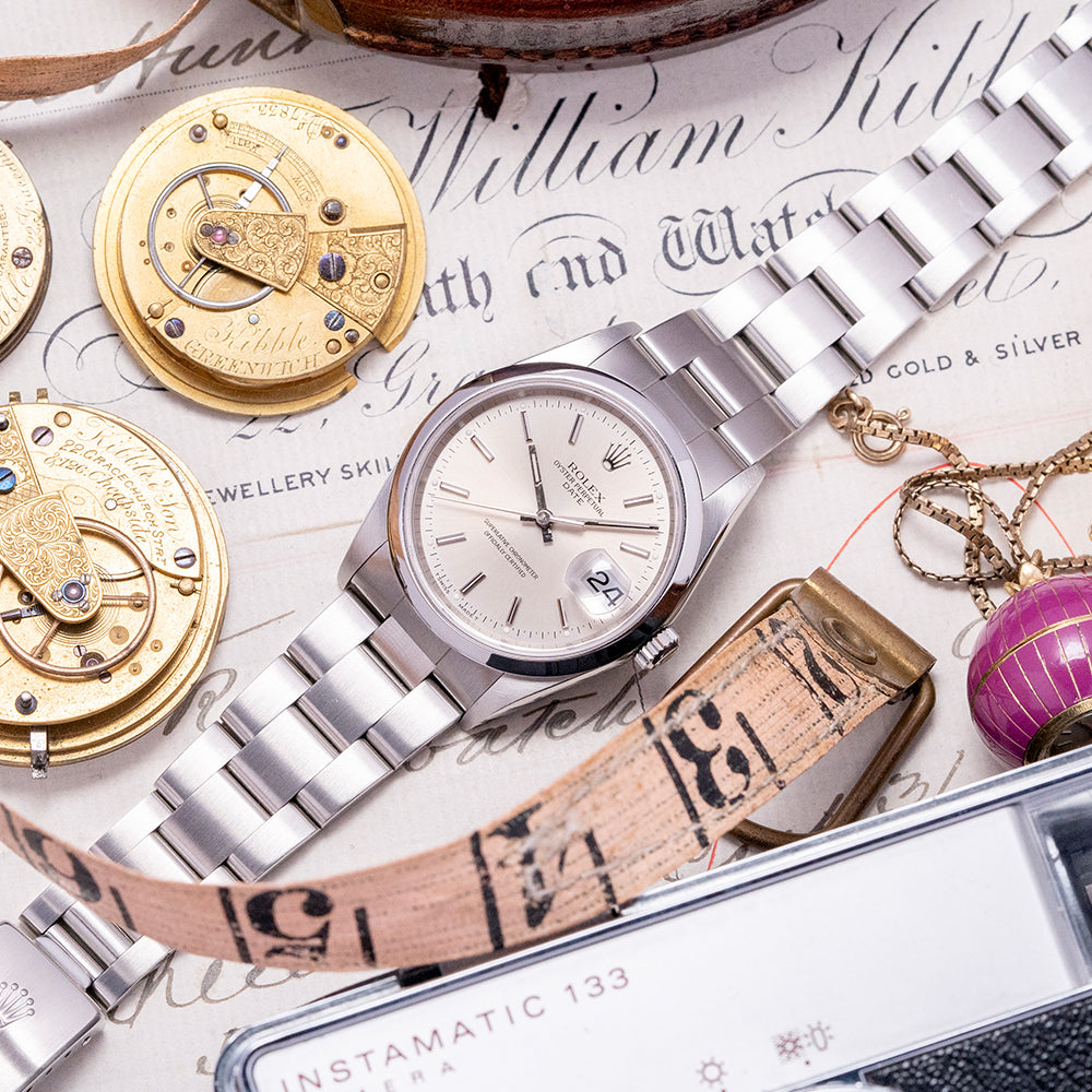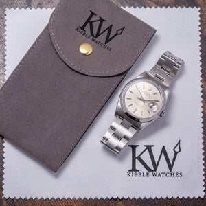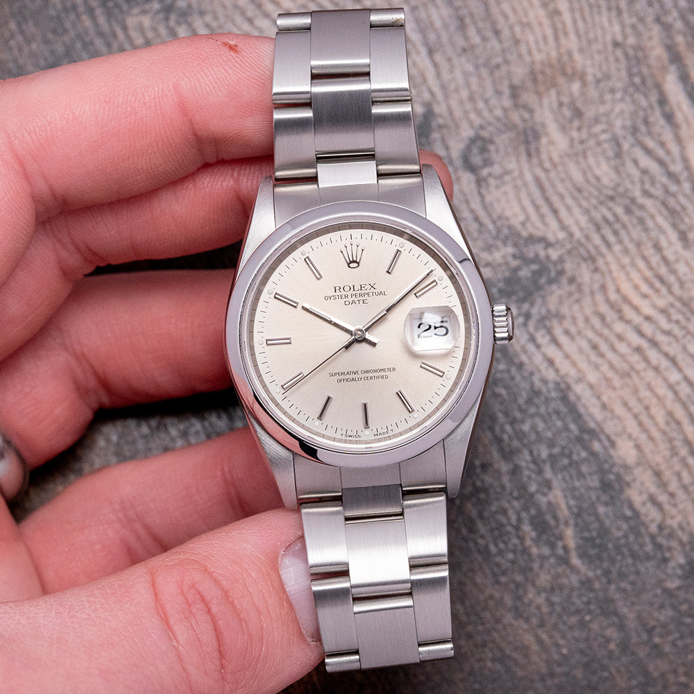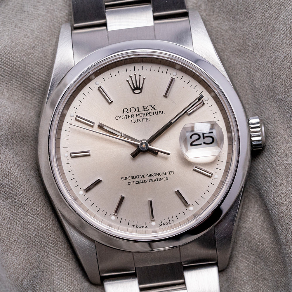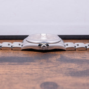 Here we have a 2002 Rolex Oyster Perpetual Date Silver Tritium Dial 15200 with a 34mm 316L stainless steel Oyster case, polished and brushed surfaces transition with crisp edges. Gently sloping lugs elegantly taper to a lug-to-lug length of 42.5mm and a case thickness of 11.5mm, ensuring a comfortable fit on your wrist. On the right side, is a signed screw-down crown. A bevelled polished bezel holds a flat scratch-resistant sapphire crystal above a striking sunburst silver dial, an outer minute track with Tritium pips, and fine applied facet baton indexes mark the hours. At 3 o’clock, a cyclops magnification above the date window. Polished baton hands have Tritium infill complemented with a tapered sweeping seconds hand. At 12 o’clock, we have the Rolex motif “Rolex Oyster Perpetual Date” printed underneath, and at 6 o’clock, we have “Superlative Chronometer Officially Certified”. On the reverse, a coin-edged screw-down case back, inside an automatic Rolex calibre 3135, 31 jewels, 28,800 beats per hour, is fitted with a Parachrom hairspring, making it much more resistant to shocks and temperature variations. The watch comes fitted on its original 19mm Rolex Oyster stainless steel bracelet with its Rolex-signed folding clasp; the bracelet will fit up to a 7.1-inch wrist.