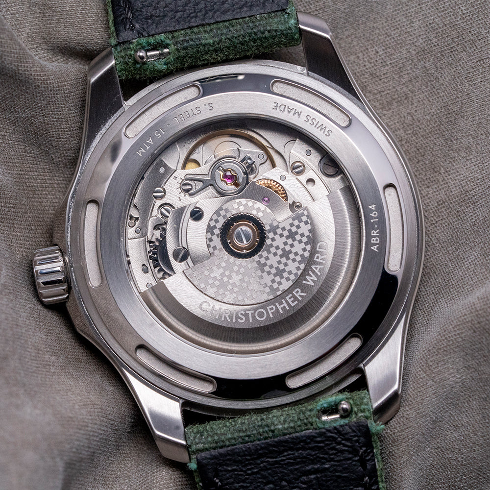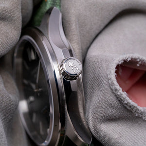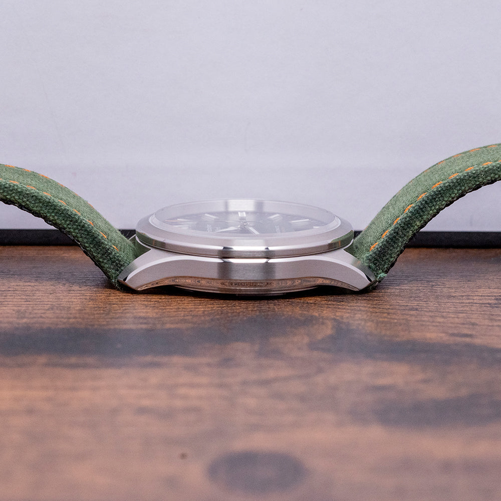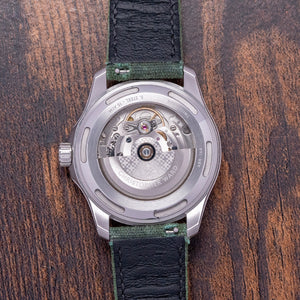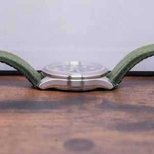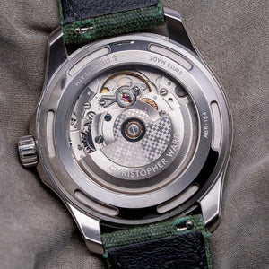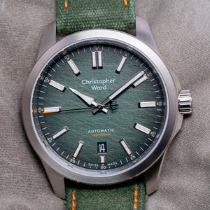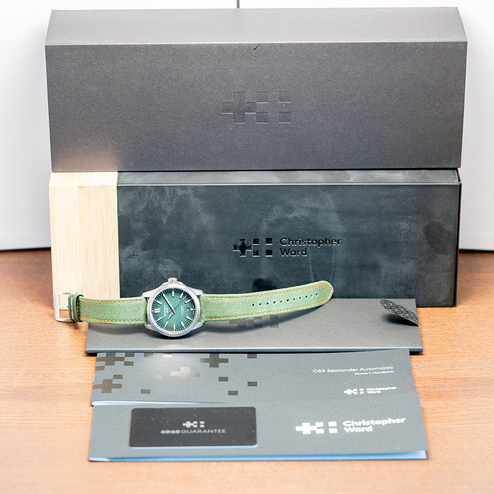 Here we have a 2022 Christopher Ward C63 Sealander Hunter Green that has a 39mm 316L marine-grade stainless steel Light-catcher case that gently curves over your wrist with tapered lugs and a lug-to-lug length of 45.5mm and a case thickness of 11mm, ensuring a comfortable fit. Brushed and polished surfaces transition with crisp edges that play with the light as you rotate your wrist, hence the name. A screw-down signed crown with an embossed Christopher Ward motif is on the right side. A polished and brushed smooth bezel holds an anti-reflective sapphire crystal. The Hunter Green dial features a unique hand-distressed ‘ombré’ finish, an outer minute track with printed Arabic numerals, and an orange pip. Surrounding the dial are applied bevel-edged steel diamond-polished baton indexes, with a strip of Super-LumiNova Grade X1 BL C1 down their centres to mark the hours. The polished edges catch the light in a magical way. At 6 o’clock, a colour-matched date window. Brushed and polished steel hands are filled with the same luminance complemented by an orange-tipped sweeping second hand, complete with the characteristic Trident counterweight. Text is precisely applied with a splash of orange at 6 o’clock, indicating its water resistance. This go-anywhere, do-everything watch is perfectly balanced. On the reverse, a screw-down exhibition case back, inside an Automatic Sellita Cal. SW200-1, 26 jewels, 28,800 beats per hour, with a bespoke “Colimaçoné” finishing (a type of twisting sunray graining). The rotor has a double Twin-flag engraving across it. It is paired with its original Christopher Ward 20mm green canvas strap and a signed pin buckle. The watch also comes with its Christopher Ward presentation box and papers.