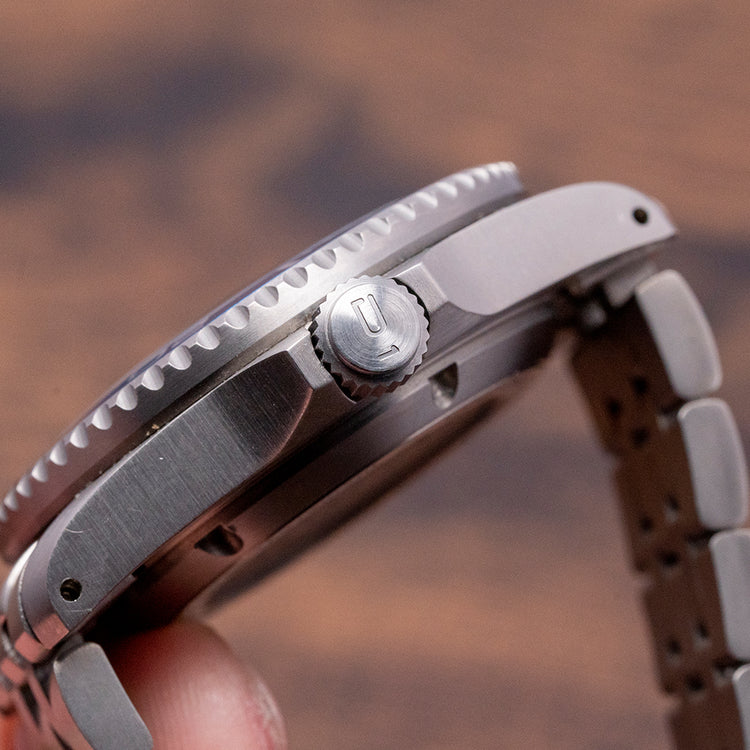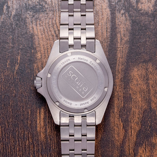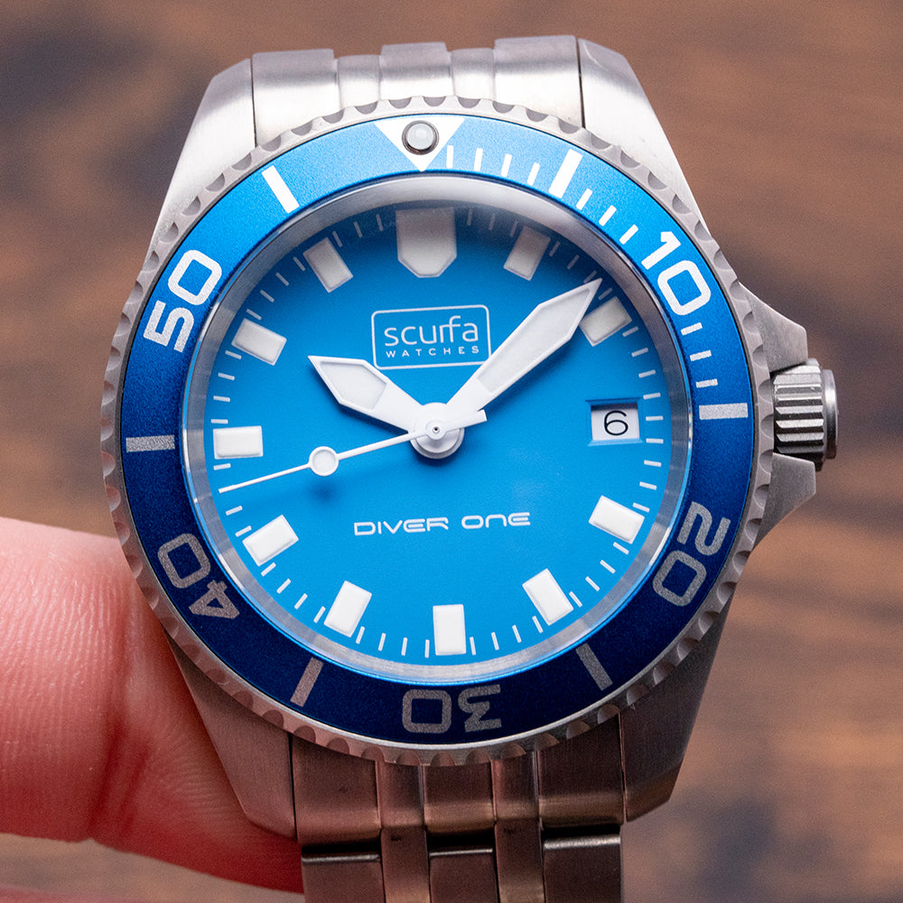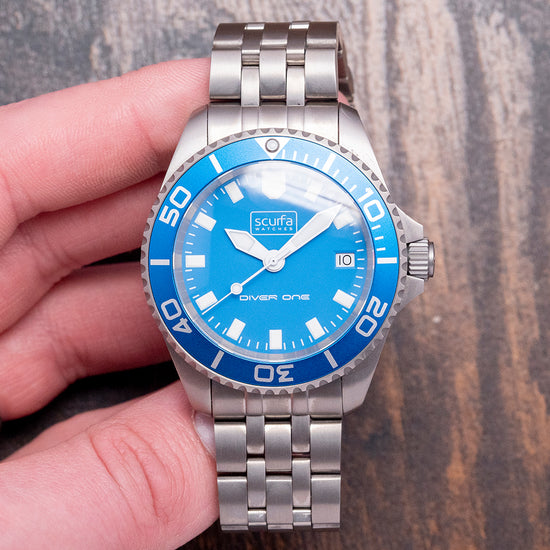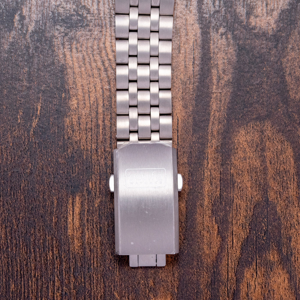 Here we have a 2022 Scurfa Diver One D1-500 Titanium Light Blue with a 40mm T2 Titanium case. Brushed surfaces flow over your wrist towards the thick, tapered drilled lugs, and a lug-to-lug length of 48mm and a case thickness of 13.5mm give the watch an impressive wrist presence. On the right side, we have a screw-down signed crown with four gaskets protected by crown guards. On the left side, you find the Helium escape valve, which Paul Scurfa himself tested at different depths and gas mixtures. The deepest decompression was 154 meters to the surface. The 120-click Titanium dive bezel has deep knurling around its edge that can easily be adjusted even with gloves on and a light blue Aluminium insert with a Titanium pearl. A domed sapphire crystal has a blue AR coating on the underside sitting above the striking Light blue dial. Large baton indexes are coated in Grade A Super Luminova BGW9, which glows blue in the dark, marking the hours. At 3 o’clock, a date window. Thick sword hands are coated in the same Grade A Super Luminova BGW9, complemented by a white lollipop second-hand. The contrast of the white against the light blue makes for an easy-to-read tool dial. The testing and care of attention are clearly seen in this watch. Text at 12 o’clock is the Scurfa logo at 6 o’clock, Diver One in white. On the reverse a screw-down case back with a 1mm gasket and the Scurfa logo in the center. Inside a Quartz ETA Cal. F06.412, this three jewel movement is brass and has a longer battery life and EOL “End Of Life” indicator for peace of mind. It comes paired with its original Titanium bracelet secured by a signed deployant clasp, all links provided and will fit up to a 7.1-inch wrist plus an additional three 20mm rubber straps and comes with its Scurfa presentation box and papers.