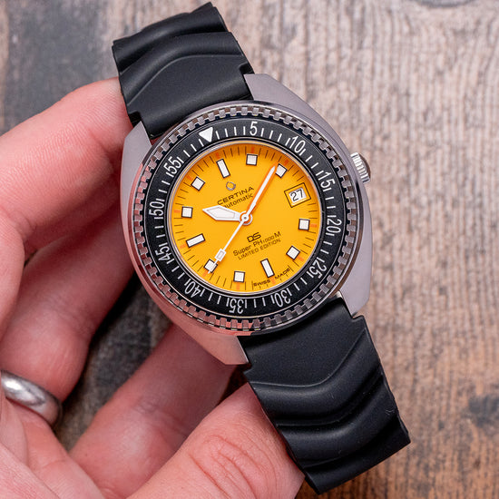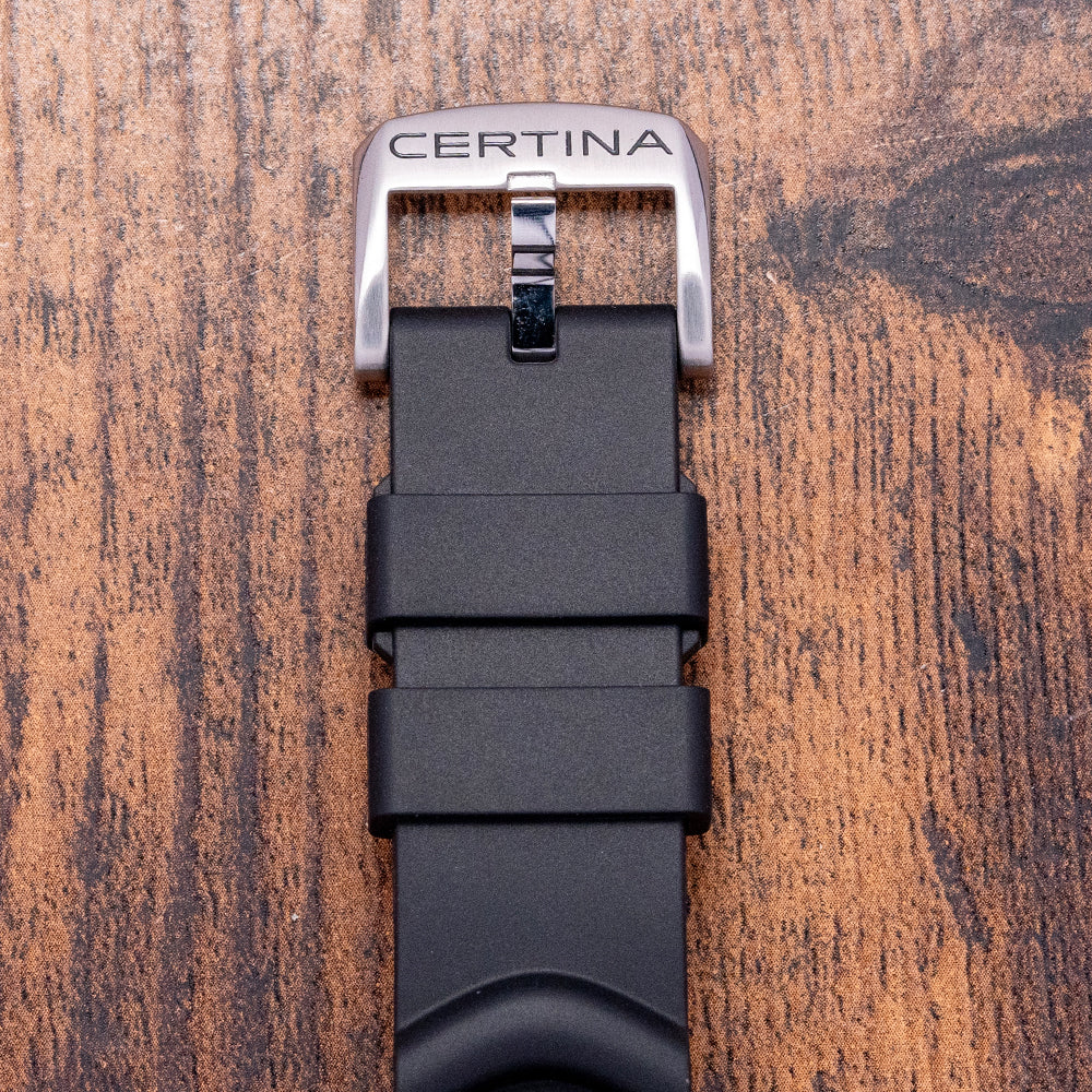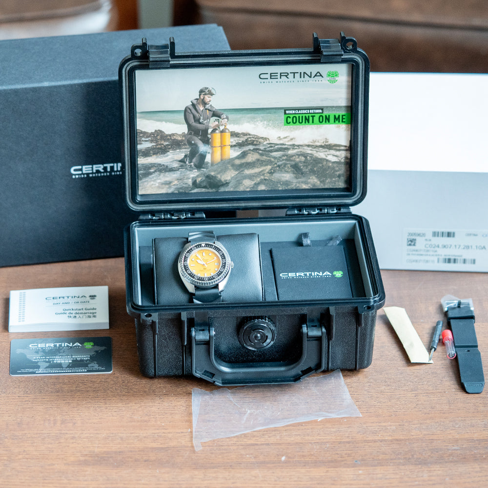 This watch is sold with its Certina tough case, swing tag and paperwork. It also comes paired with two Certina black rubber straps and a Certina signed pin buckle. The watch is from February 2024 and is in Like-New condition, as you can see from the photos. It comes with its Manufacturer warranty.