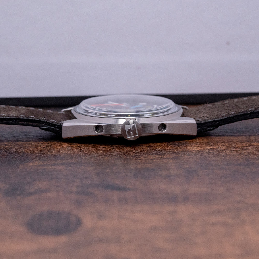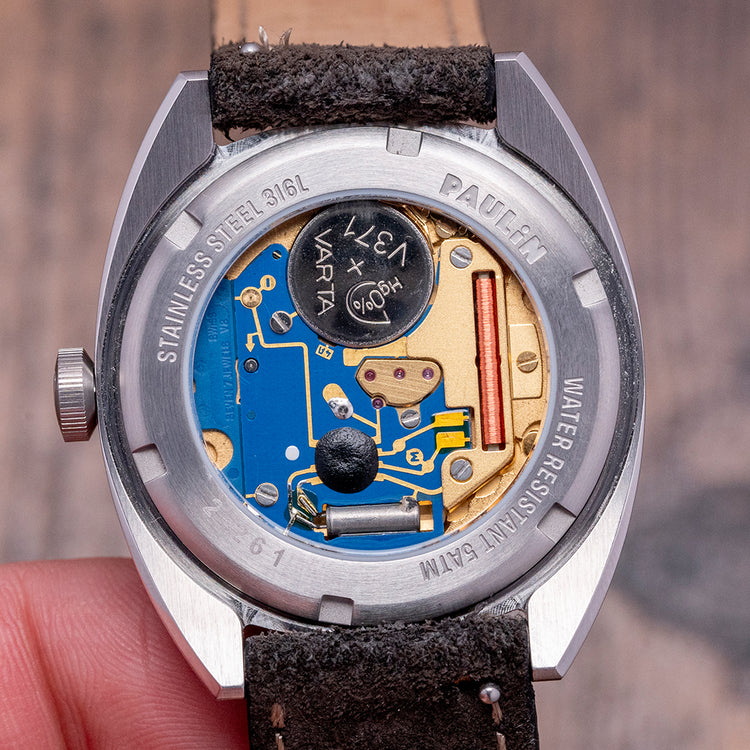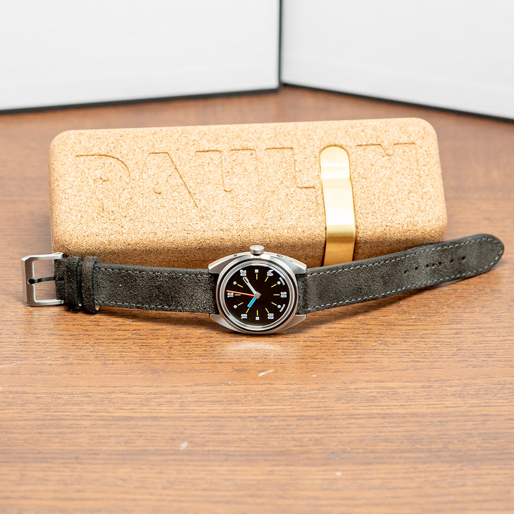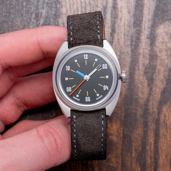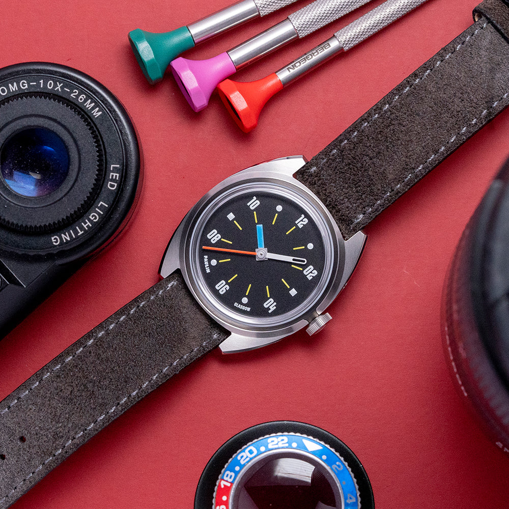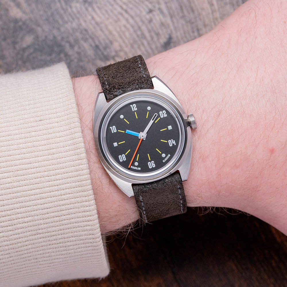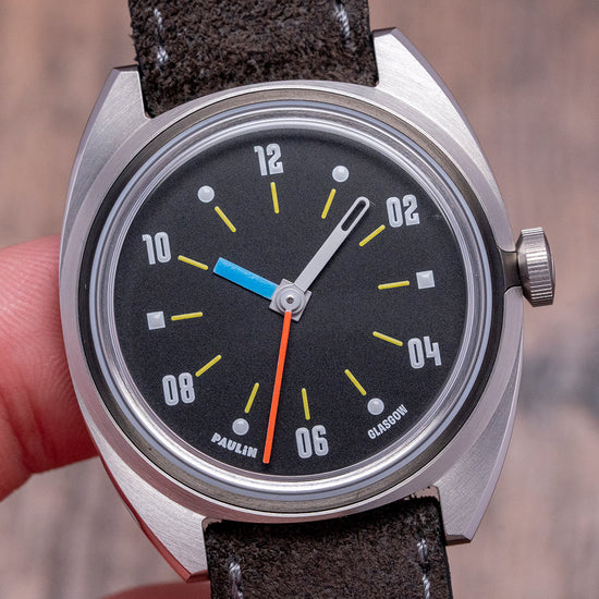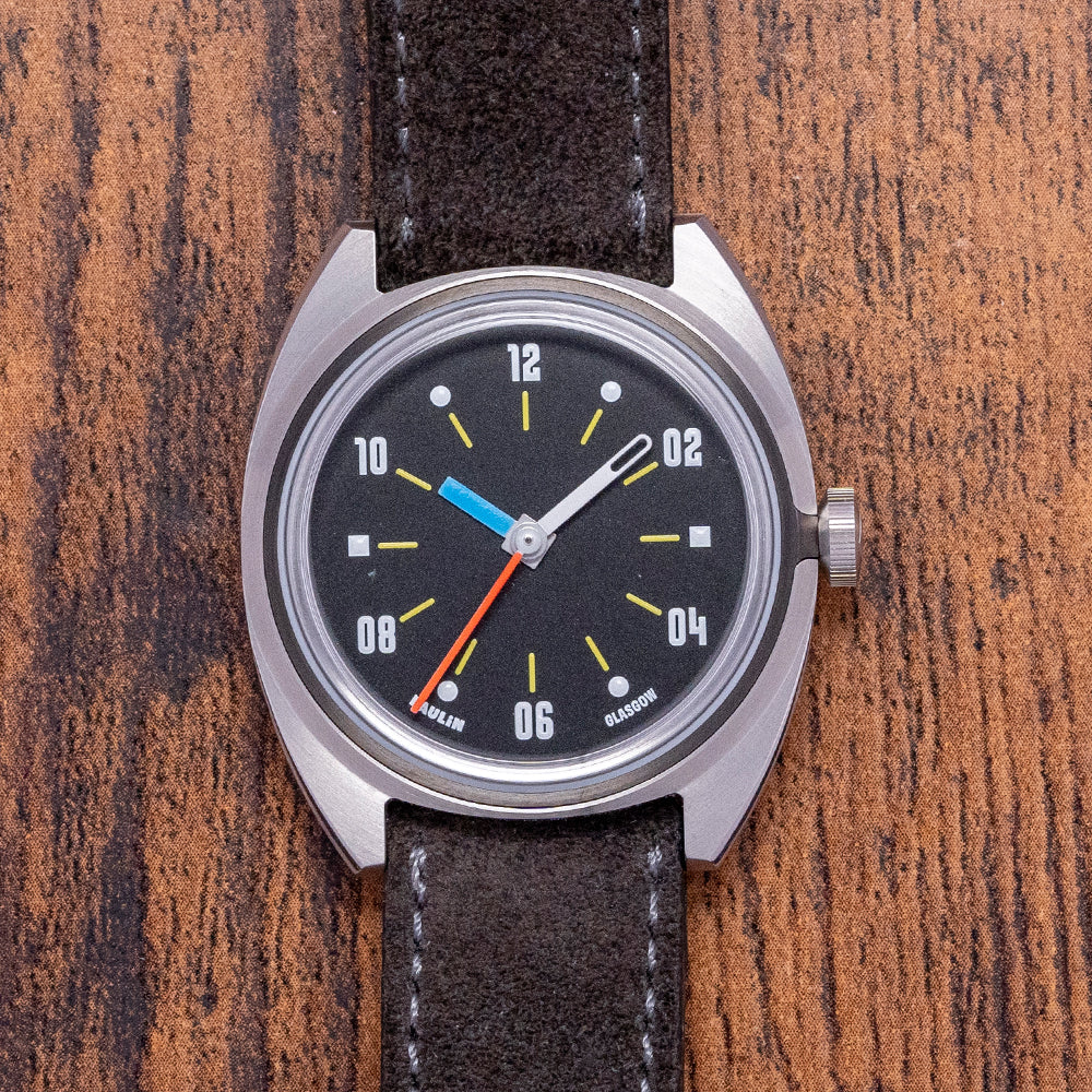 Here we have a 2024 Paulin Modul D Quartz Exhibition Back with its 35mm brushed and polished stainless steel Modul tonneau-shaped case, so named due to its four hex screwed-in black steel “modular construction” made to house a variety of movement sizes. The gentle curve of its flanks leads to flat-ended lugs with a lug-to-lug length of 40mm and a case thickness of 8mm, ensuring a comfortable fit on your wrist. On the right side is a signed coin-edged crown. The stepped bezel holds a domed crystal sitting above a matte black dial. The distinctive hand-painted numerals are a typeface called Wim, named after Wim Crouwel, a Dutch graphic artist inspired by the modernist movement; surrounding yellow baton indexes marking the hours, the unique handset consists of a thick blue hour hand, a skeletonised white minute hand and a red second hand; along the bottom edge, we have Paulin Glasgow completing this colourful, sophisticated contemporary timepiece. On the reverse, the exhibition case back with the details of the watch engraved around its edge, inside a Quartz ETA 955.112 movement. It comes paired with its 18mm strap and signed pin buckle, and it comes with its Paulin presentation box.