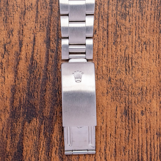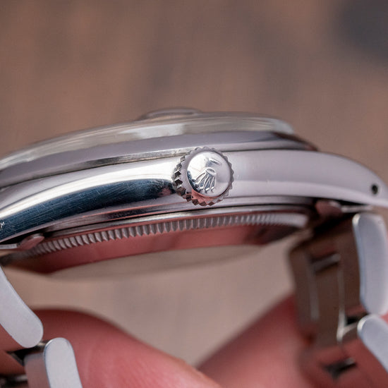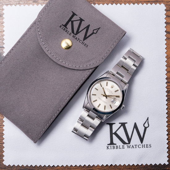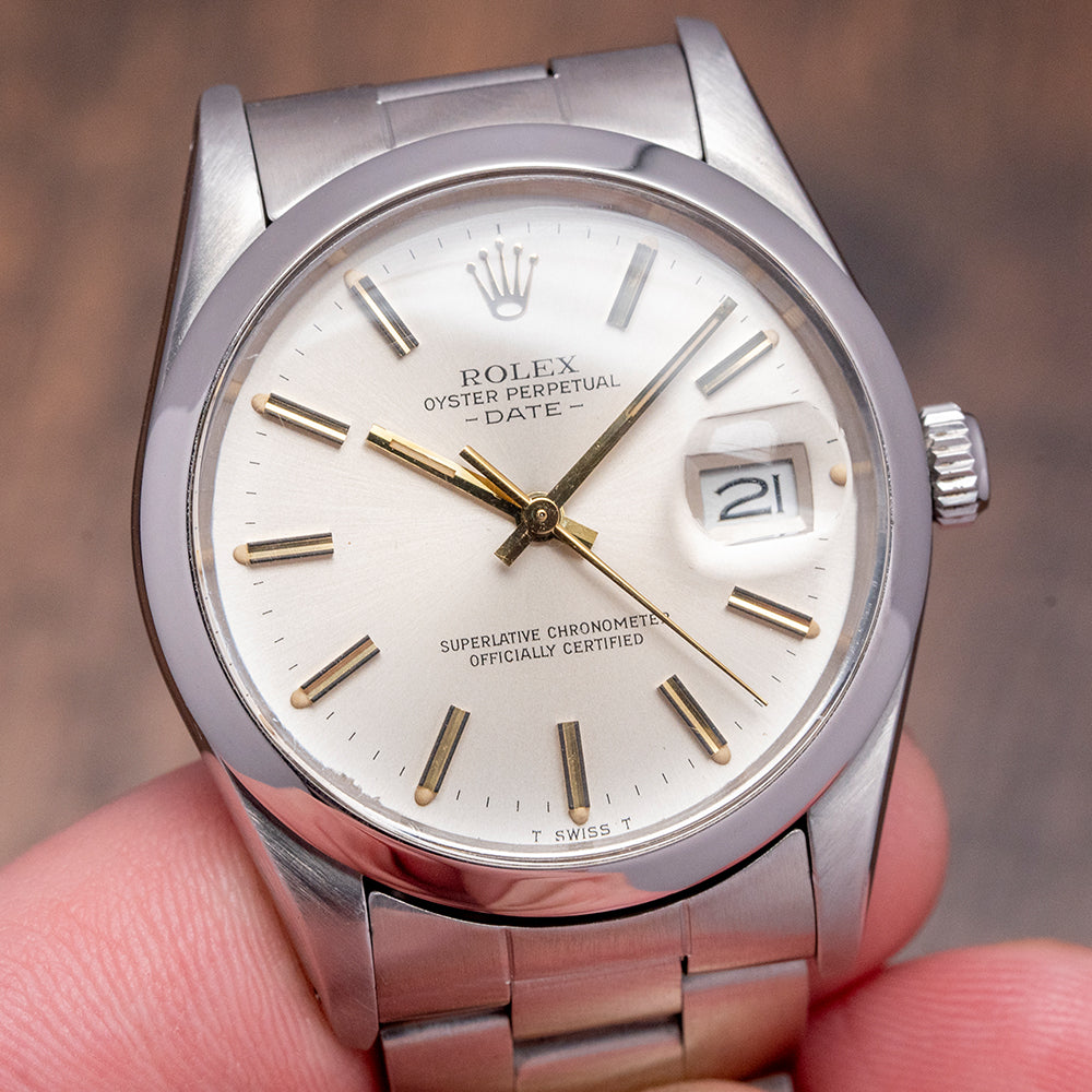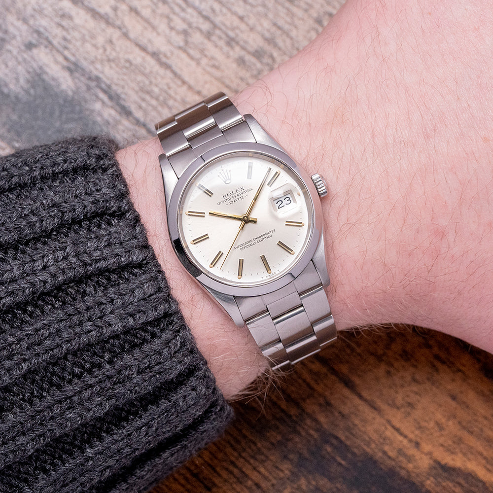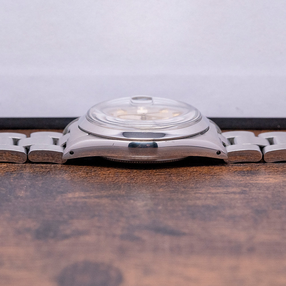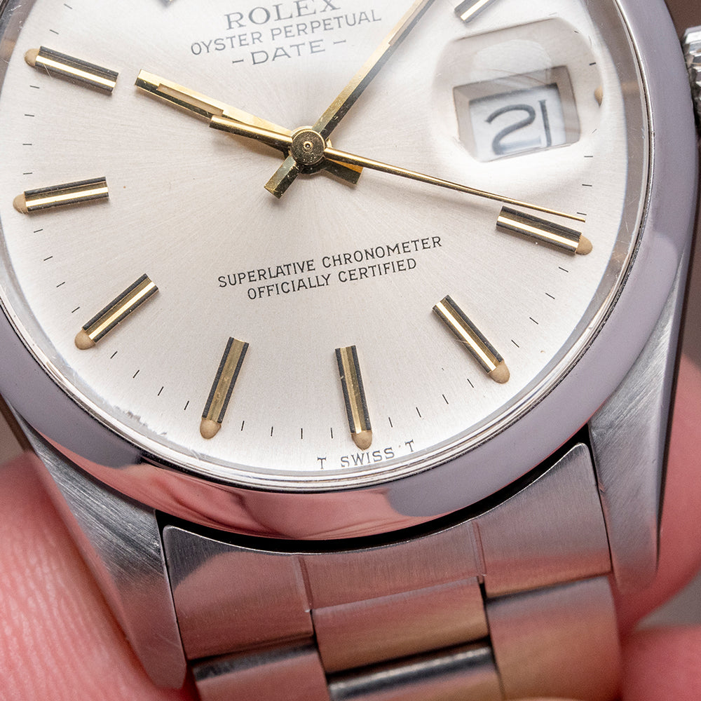 Here we have a 1982 Rolex Oyster Perpetual Date Silver Dial 15000 with a curvaceous 34mm stainless steel Oyster case; the case flows over your wrist with a lug-to-lug length of 42mm and a case thickness of 12mm, ensuring a comfortable fit on your wrist. On the right side is a signed crown. The smooth polished bezel holds a raised plexiglass above a sunburst silver dial, and an outer minute track is precisely printed with Tritium lume pips at the hours, with applied gold baton indexes marking the hours. At 3 o’clock, there is a date window with Cyclops magnification on the crystal. Elegant Gold baton hands are complemented by a sweeping tapered second hand. At 12 o’clock, we have an applied Rolex crown with “Rolex Oyster Perpetual Date” printed underneath and “Superlative Chronometer Officially Certified” at 6 o’clock. On the reverse, a screw-down coin-edged solid case back, inside an automatic Rolex Cal. 3035, which is fitted with a free-sprung Breguet overcoil hairspring and a bi-directional rotor; this movement was manufactured from 1977 until 1988. It comes paired with its original 19mm Rolex Oyster stainless steel bracelet with a signed Rolex clasp.