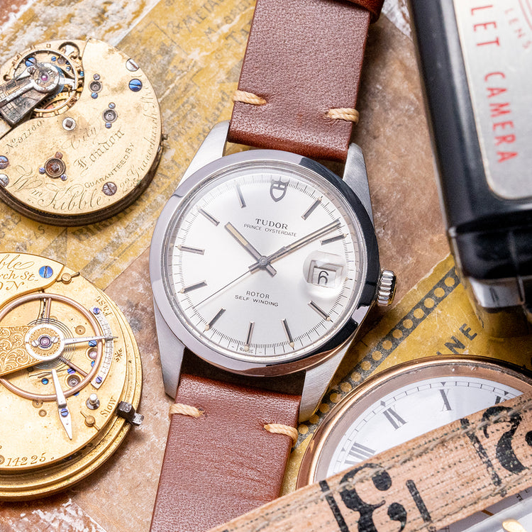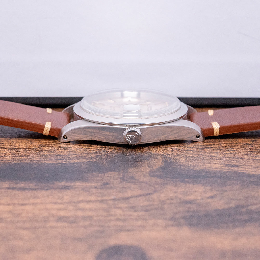 Here we have a 1983 Tudor Prince Oysterdate Jumbo Silver 90800 with a 38mm Jumbo Rolex Oyster stainless steel case that gently curves over your wrist with finely tapered drilled lugs, and its brushed and polished flanks lead to a lug-to-lug length of 47mm and a case thickness of 11mm ensuring a comfortable fit. Polished and brushed surfaces transition with crisp lines, on the right side is a Rolex-signed screw-down crown. A domed crystal sits above a striking silver dial, and an outer minute track precisely executed has chamfer-edged baton indexes with a black stripe and a Tritium pip marking the hours. At 3 o’clock a date window with cyclops magnification. Slender baton hands have Tritium tips complemented by a tapered sweeping second hand. At noon, we have the applied Tudor shield "Tudor Prince OysterDate" and at 6 o’clock ", Rotor Self Winding" completes this vintage sports watch. On the reverse, a Rolex signed coin-edged case back, inside an automatic ETA 2784, 25 jewels, beating at 28,800 beats per hour, the movement has a quick set date and hacking for your convenience. The watch comes paired with its well-suited 20mm vintage-style leather strap and secured by a pin buckle.