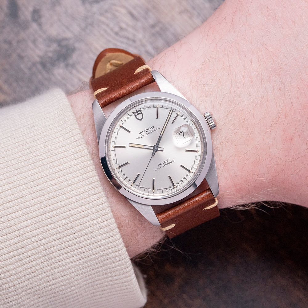 There is something undeniably incredible about a Tudor Prince Oysterdate Jumbo in 38mm on the wrist, whilst only 2mm larger than the traditional 36mm, the wrist presence feels completely different. This specific reference 90800 features a beautiful silver dial with tritium throughout, the warm tones of the tritium contrast perfectly against the dial and, in my opinion, this is only made better with the warm tone of the brown strap! This is one to see in the metal if you get the chance, if not, buy it here online and you will not be disappointed!