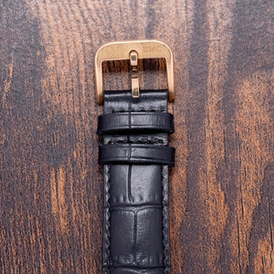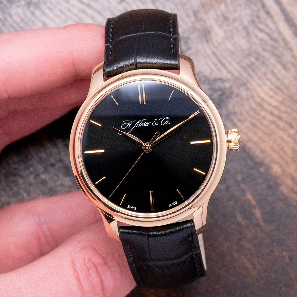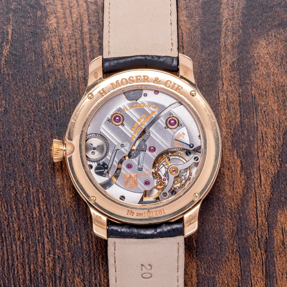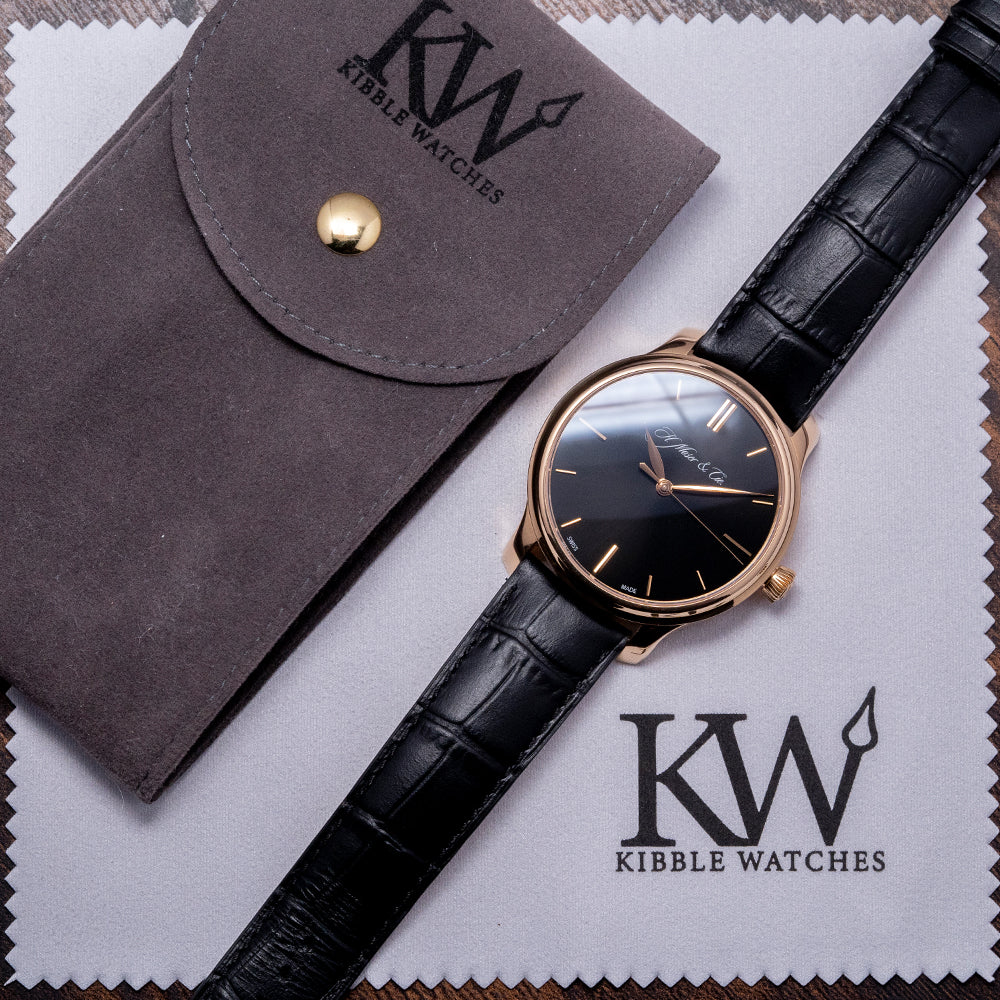 Here we have a stunning 2012 H.Moser & Cie E Rose Gold 7-Days 343.505-017 an early “Monard”, now the Endeavour, with a 41mm 18ct Rose Gold round case that flows over your wrist with elegant tapered concave hallmarked lugs and a lug-to-lug length of 47mm and a case thickness of 11mm ensuring a comfortable fit. Sculpted sides flow effortlessly with a signed crown in the centre on the right side, and a smooth bezel holds a domed sapphire crystal above a deep black dial. Applied single and double 18ct Rose Gold baton indexes mark the hours and play with the light as you rotate your wrist; 18ct Rose Gold leaf hands are complemented by a tapered sweeping second hand; at 12 o’clock, we have the H. Moser & Co motif completing this sophisticated contemporary minimalist dress watch. On the reverse, a screwed-down sapphire exhibition case back, engraved with the details of the watch, showcasing the manually wound HMC Cal. 343.505, 26 jewels, beating at a leisurely 18,000 beats per hour; this beautiful hand-finished movement has an in-house Straumann hairspring, a double hairspring that beats in opposite directions, this reduces any external effects on the escapement, and a 7-day power reserve indicator and the movement is tastefully decorated in Moser double stripes. It comes paired with a well-suited aftermarket 20mm leather strap with its original 18ct Rose Gold pin buckle.