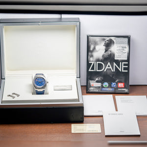 The curved flanks lead to a lug-to-lug length of 53mm and a case thickness of 13mm, giving the watch an impressive wrist presence. Sitting recessed in the case on the right side is a signed, deeply knurled crown. Its stepped brushed and polished bezel has the characteristic five holes evenly spaced and holds a flat sapphire crystal above a striking blue dial. An outer minute track has red numerals, highlighting his shirt number 10, a nice touch and two raised steel plates top and bottom adding interest and dimension to the dial, applied chamfer-edged baton indexes mark the hours, at 3 o’clock, a date window, thick steel hands are complemented by a red arrow tipped sweeping second hand, at 12 o’clock we have the IWC motif and at 6 o’clock “Ingenieur” completes this sophisticated limited edition timepiece. On the reverse a screw-down case back engraved with a signed portrait of Zinedine Zidane in the centre, inside an Automatic IWC Cal. 80111, 28 Jewels beating at 28,800 Beats per hour. It comes paired with an integrated 27.5mm blue leather strap and a signed pin buckle and comes with its IWC presentation box and paperwork.