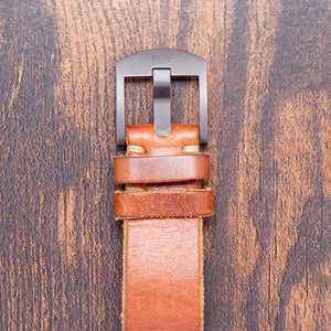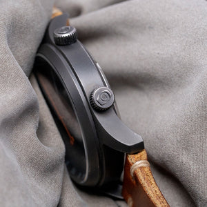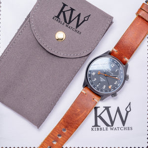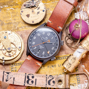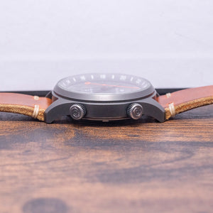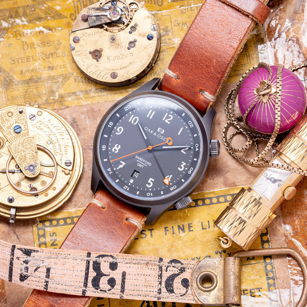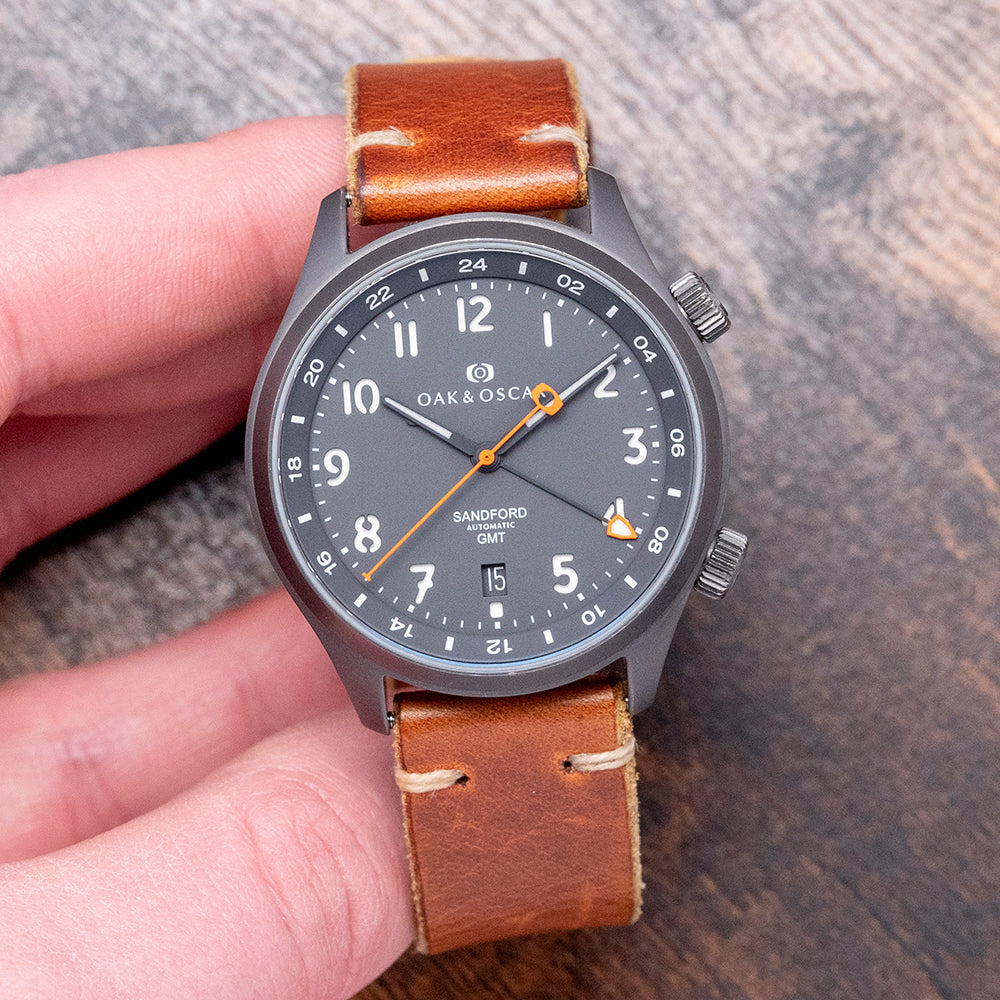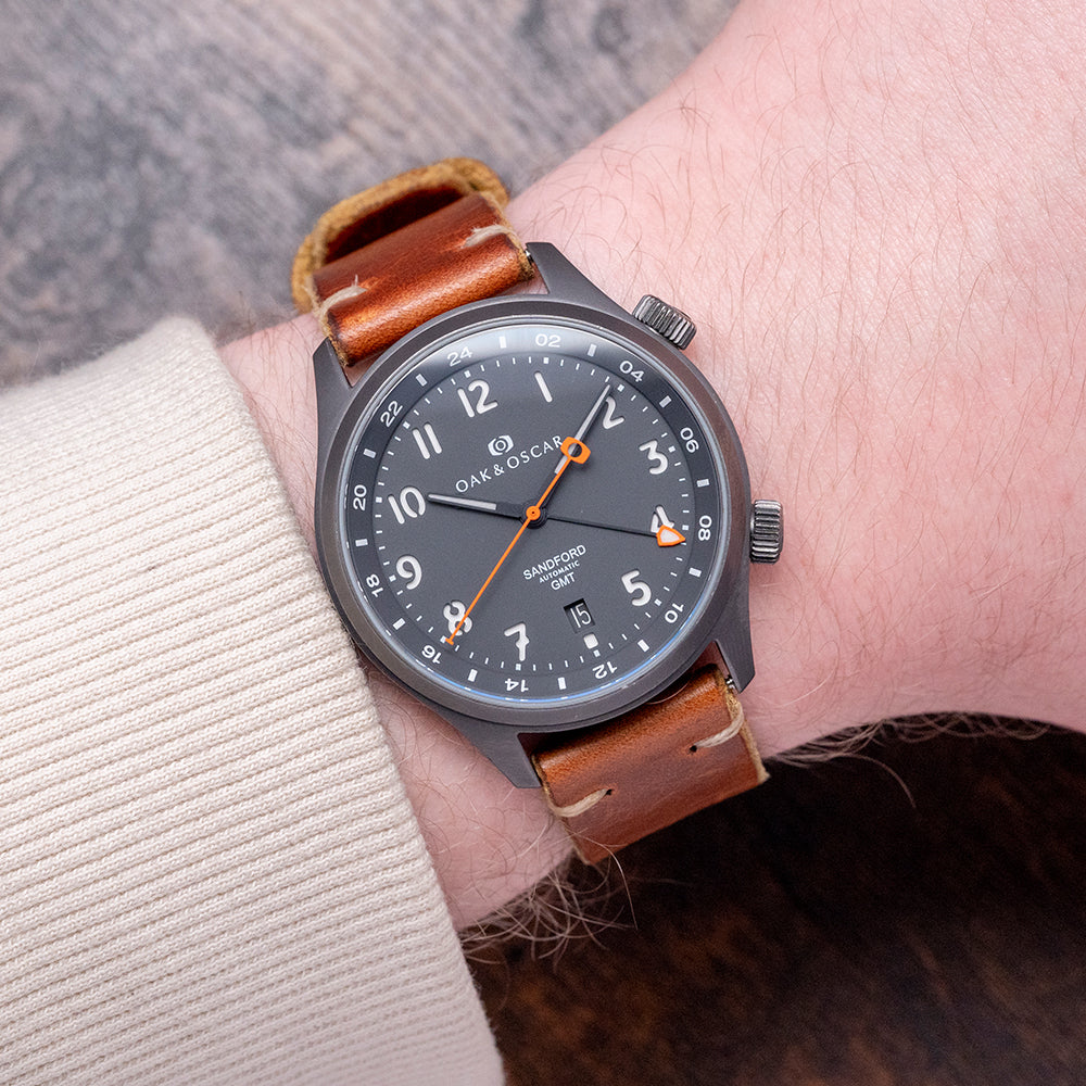 Here we have a 2016 Oak & Oscar Sandford GMT PVD Automatic, limited to 066/100 pieces, named after Sandford Fleming, a Scottish inventor and engineer who migrated to Canada in the mid-1800s; he played a vital role in developing a significant portion of the Canadian railway and was also recognised as one of the earliest and most influential advocates of the implementation of standardised time zones. The 40mm brushed Gunmetal PVD coated stainless steel case curves over your wrist with flat-ended tapered lugs, and a lug-to-lug length of 46mm and a case thickness of 11.5mm ensure a comfortable fit. Down the right side, we have the signed screw-down crown to adjust the internal rotating 24-hour bezel and the signed screw-down crown to adjust the time, GMT hand and date. A double-domed sapphire crystal AR coated sits above a striking charcoal grey sandwich dial with a Super-LumiNova BGW9 lower layer, an outer minute track surrounding cut-out Arabic numerals marking the hours, at 6 o’clock a date window, tapered PVD coated hands filled with Super-LumiNova BGW9 are complemented by an orange-tipped Stone age shaped arrowhead GMT hand and an orange sweeping second hand with a counterbalance that aligns with the Oak & Oscar motif at 12 o’clock that Fancher calls the "Stonehenge effect". At 6 o’clock, “Sandford Automatic GMT” completes this dynamic traveller companion. On the reverse, a screw-down stainless steel exhibition case back with the details engraved around the edge and the number out of 066/100, inside an automatic Soprod Cal. C125, 25 jewels, beating at 28,800 beats per hour; this movement is based on the Soprod A10-2/M100 and has hacking seconds, an independent GMT hand and a modified rotor. The watch comes paired with its 20mm Oak & Oscar vintage-style tan-coloured Horween leather strap with a signed PVD-coated pin buckle.