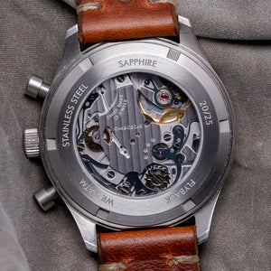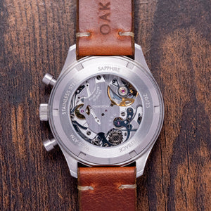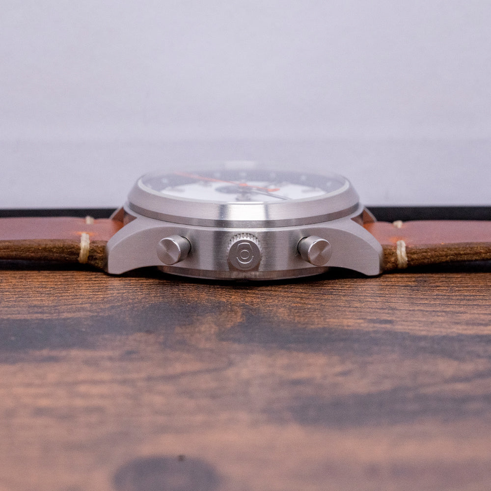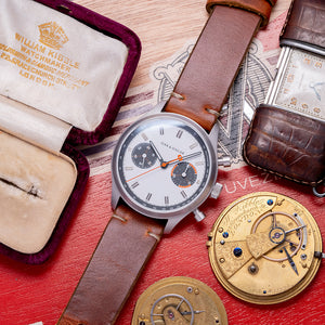 Here we have the 2018 Oak and Oscar 'Batch Nº1' Chronograph Limited Edition of just 20/25 pieces, a special piece inspired by the Bourbon distillery's use of low batch numbers of their flavourful hand picked releases indicating a higher level of detail and quality control, launched in August 2018, it was only available to Oak and Oscar owners who received an email with a link to the purchase page. This link could be shared among owners' friends, but was never publicly released - a clever way of creating interest and FOMO. The 40mm finely brushed stainless steel case curves over your wrist with tapered lugs. The curved flanks lead to a lug-to-lug length of 46mm and a case thickness of 14mm, ensuring a comfortable fit. We have the piston chronograph pushers on the right side and a large, signed, coin-edged crown in the centre. The brushed, smooth bezel holds a double-domed sapphire crystal, AR-coated, above a striking matte white “Panda” dial. A black outer Tachymeter scale chapter ring surrounds polished chamfer-edged baton indexes filled with Super-LumiNova down the centre marking the hours, at 3 o’clock a stacked 12-hour and 30-minute register in black with orange highlights and at 9 o’clock a continuous seconds register in black with white numerals, slender hands are filled with Super-LumiNova and complemented by an orange counterweighted chronograph hand, at 12 o’clock we have the Oak and Oscar motif completing this distinctive bicompax sports watch. On the reverse, a screw-down exhibition case back engraved with the details of the watch and a limited number, inside a manually wound Eterna Cal. 3907M, 25 jewels, beating at 28,800 beats per hour, flyback chronograph with a column wheel and stacked register. It comes paired with a 20mm vintage-style leather strap and pin buckle, plus an additional Oak and Oscar strap and Grey Cheapest NATO strap. The watch comes with its Oak and Oscar travel watch case and paperwork.