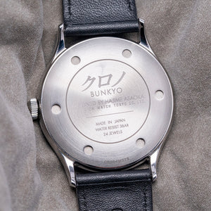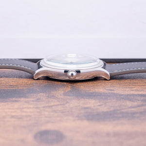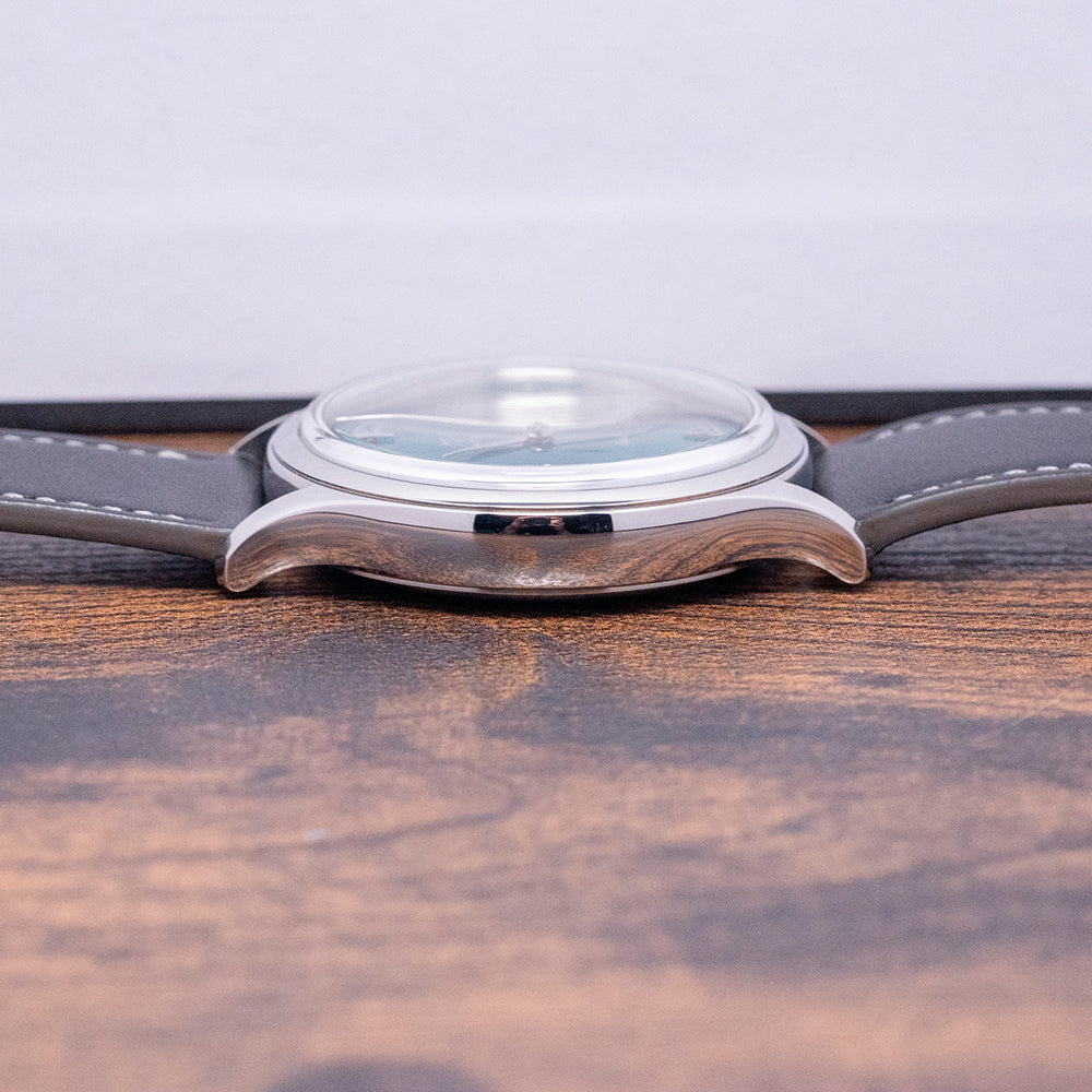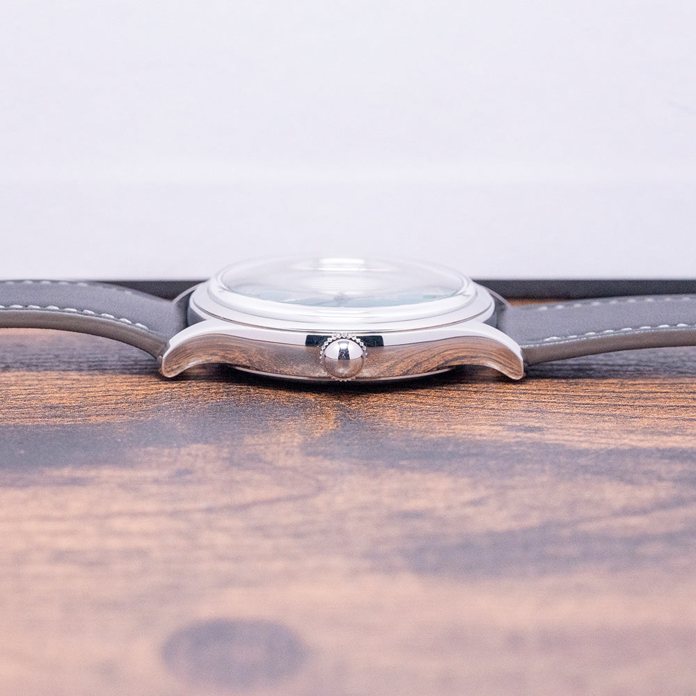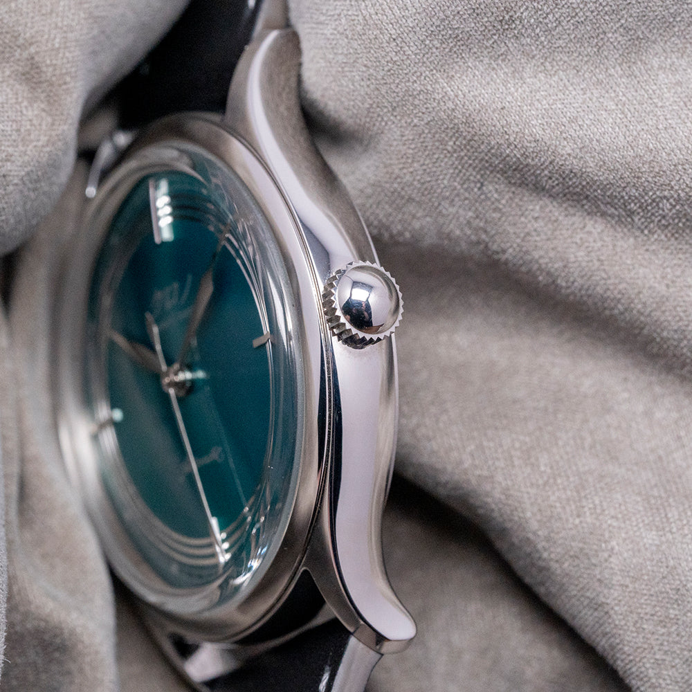 Here we have a 2020 Kurono Tokyo Green Mori, which was created to celebrate its first anniversary on the 1st of June 2020. Limited to 288 pieces, the 37mm high polished stainless steel case is gently tapered towards the lugs with a case thickness of 11mm and lug-to-lug length of 43.5mm, ensuring a comfortable fit on your wrist. The watch takes its design cues from the Art Deco timepieces of the past. On the right side is a domed crown, and a smooth polished bezel holds a domed sapphire crystal above the stunning forest green dial. Under different lighting conditions, the dial shimmers in the light as you rotate your wrist. An outer minute track is precisely printed with three engraved concentric steel rings with four applied baton indexes to catch the light in a mesmerising way. Sculpted brushed hands complemented by a tapered teardrop balanced sweeping second-hand finishing this elegantly understated vision of Japanese creativity and sensibility. The brand motif is found at 12 o’clock with Automatic at 6 o’clock. On the reverse, a screw-down case back with the brand motif and inside an automatic Miyota 90S5, 24 jewels, 28,800 beats per hour. This movement is part of the high-grade Miyota family with hand winding and hacking for your convenience. The watch comes fitted on a 20mm leather strap with a buckle and also comes with its Kurono Tokyo presentation box.