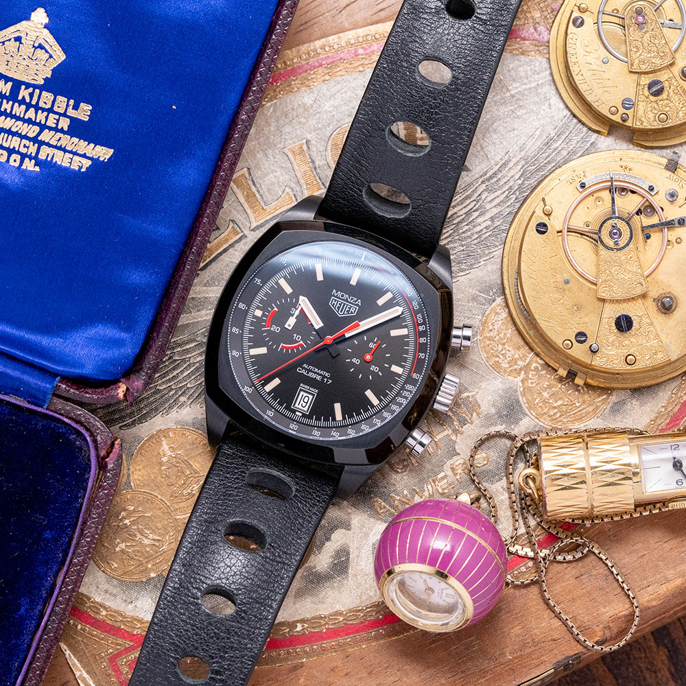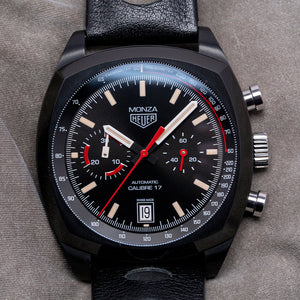 The TAG Heuer Monza Chronograph in black, reference CR2080, is a watch that rarely comes up for sale, and the prices have steadily increased over the years as the appreciation for this model increases. When originally released, I believe people overlooked it, and therefore it wasn't the biggest hit, those can often be the hidden gems in years to come. Inspired by the all black chronographs of Heuer's past, this is a faithful 'homage' to that past. Do not hesitate to add this wonderful example to your collection today!