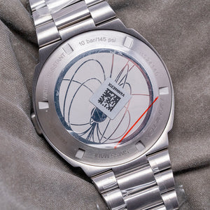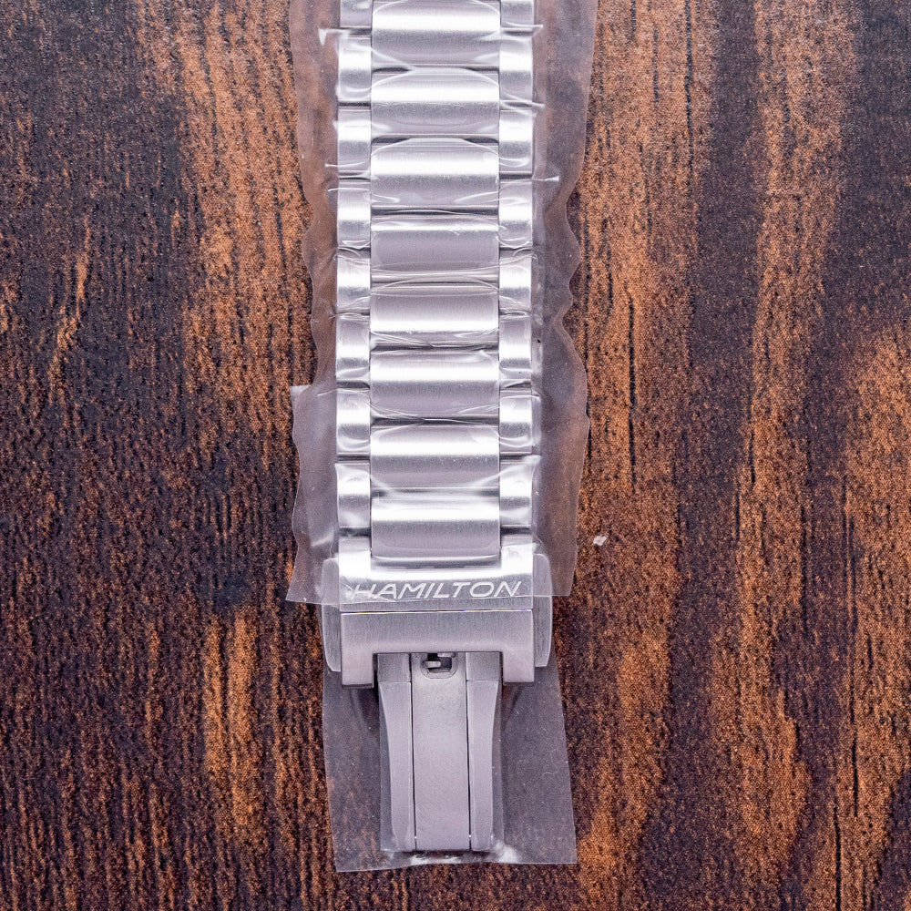 This watch is sold with its original Hamilton Box, swing tag, retailer shipping case and paperwork. It comes paired with its 24-mm integrated brushed stainless steel president-style bracelet secured by a signed butterfly clasp, and all links are included. The watch is from September 2022 and is in like-new stickered condition, as you can see from the photos. The watch comes with our 12-Months NON-Waterproof Warranty.