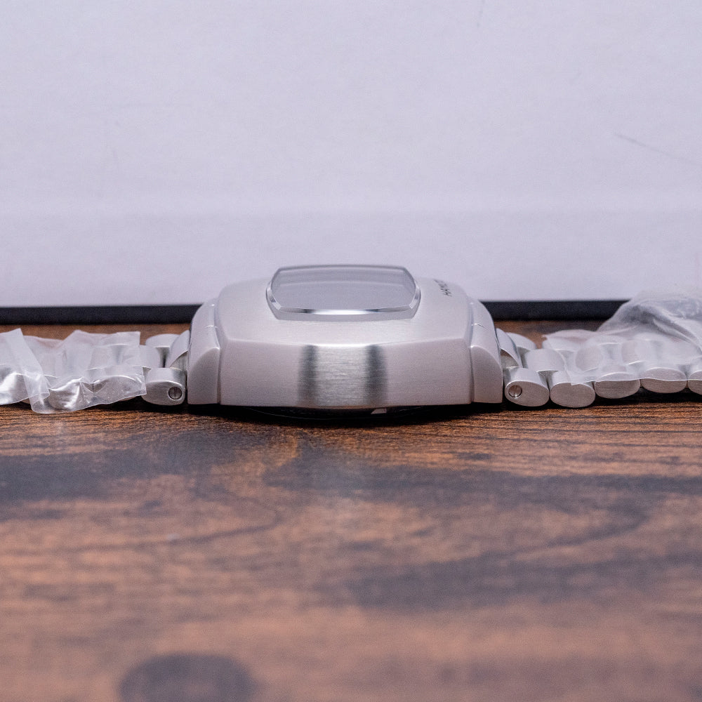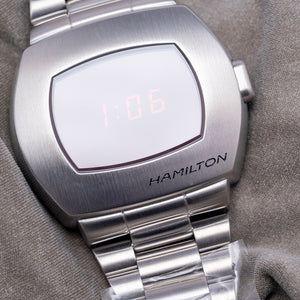 Here we have the charismatic, unworn 2022 Hamilton American Classic PSR Digital Quartz 'Red' H52414130, a modern reinterpretation of the world's first digital quartz watch, the Hamilton Pulsar, with its LED display launched in 1970, at the height of the space race between America and the USSR and was worn by many celebrities including Elvis, Elton John, Jack Nicholson. Its 41mm cushion-shaped brushed stainless steel and chromium case covers the lugs for a flowing, integrated aesthetic. Chromium is a highly resistant alloy to rust, tarnishing and corrosion. The curved brushed flanks lead to a lug-to-lug length of 35mm and a case thickness of 13.5mm, giving the watch an impressive wrist presence. On the right side is a single pusher; the brushed top surface surrounds a sapphire crystal AR coated above a hybrid LCD and OLED digital display with LCD red digital numerals on all the time, and when you push the button in the OLED illuminated dot numerals appear, perfect at night, push the button again for the seconds. We have the Hamilton motif on the bottom right corner of the case. On the reverse, we have a screw-down case back with the details of the watch engraved around its edge and a depiction of a pulsar, short for a pulsating star, which is a spinning neutron star that emits pulses of radiation, inside a Quartz movement. It comes paired with its 24-mm integrated brushed stainless steel president-style bracelet secured by a signed butterfly clasp. All links are included, and it comes with its Hamilton presentation box and paperwork.