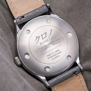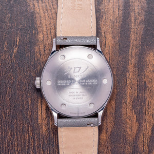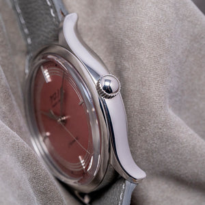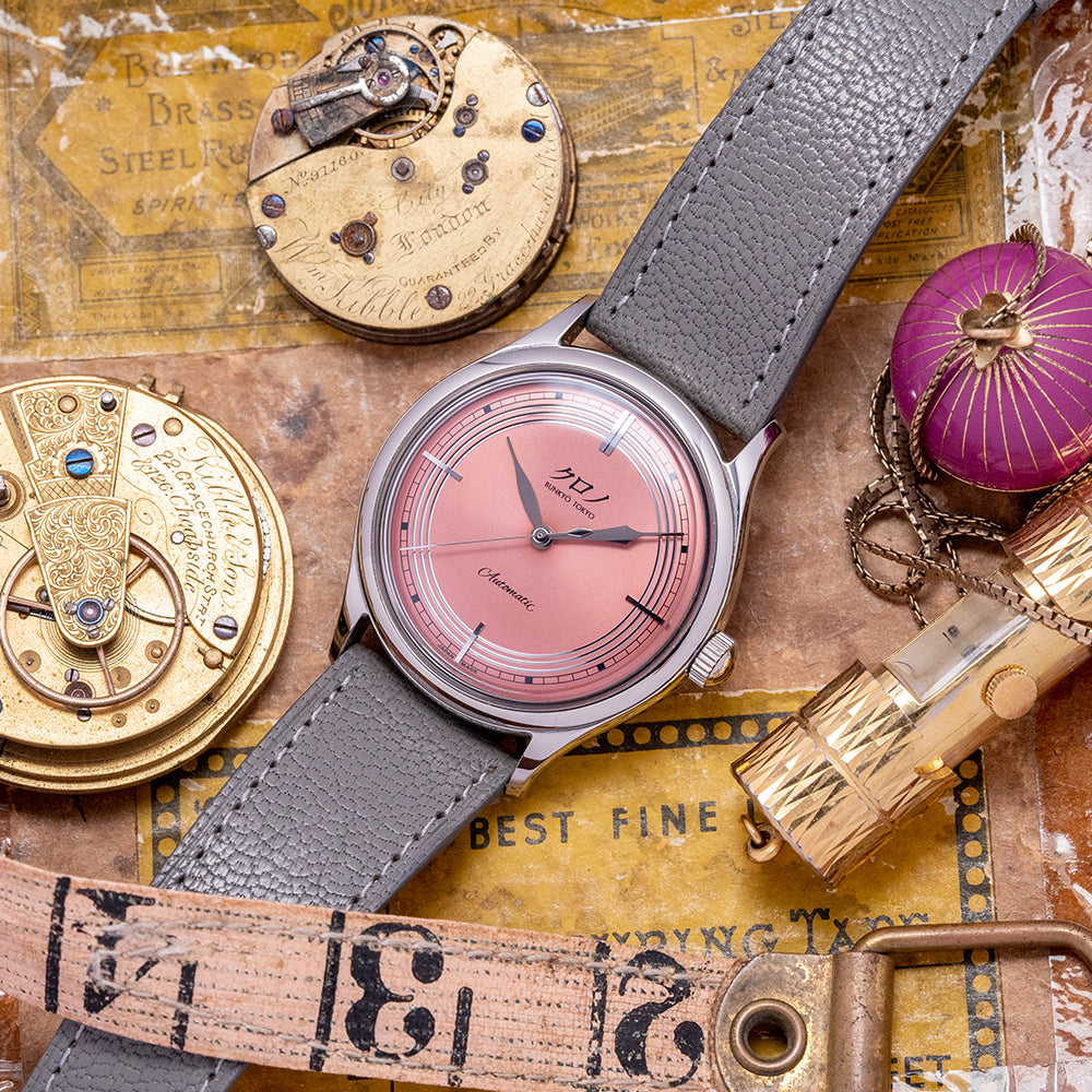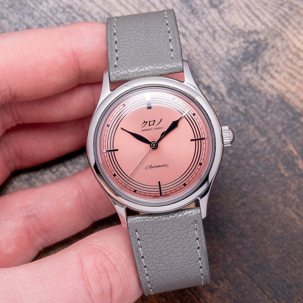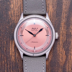 Here, we have a 2022 Kurono Tokyo Toki released in only a 10-minute window for ordering and immediately sold out. Celebrating the 2nd Anniversary of the company's conception. The 37mm high-polished stainless steel case curves over your wrist with a lug-to-lug length of 43.5mm and a case thickness of 11mm, ensuring a comfortable fit. Taking its design cues from the Art Deco timepieces of the past. On the right side is a domed crown. The polished smooth bezel holds a domed sapphire crystal, giving the illusion of the plexiglass crystals of the past. The beautiful shade of metallic Salmon with its radial sunburst is inspired by the near-extinct Japanese Ibis feathers. It took Hajime Asaoka many attempts to find the right thickness of paint applied to the dial to achieve its vibrant hue. Under different lighting conditions, the dial shimmers in the light as you rotate your wrist. An outer minute track is precisely printed. Three engraved concentric steel rings with four applied baton indexes catch the light in a mesmerising way. Sculpted brushed Kurono Tokyo hands complemented by a tapered teardrop balanced sweeping second-hand finish, this elegantly understated vision of Japanese creativity and sensibility. The brand motif is found at 12 o’clock with Automatic at 6 o’clock. On the reverse, a screw-down case back with the brand motif and details of the designer engraved into it. Inside an Automatic Miyota 90S5, 24 jewels, 28,800 beats per hour. This movement is part of the high-grade Miyota family with hand winding and hacking for your convenience. The watch comes fitted on a 20mm Fears strap plus its original Kurono Tokyo 20mm leather strap with a signed buckle. It also comes with its Kurono Tokyo presentation box and papers.