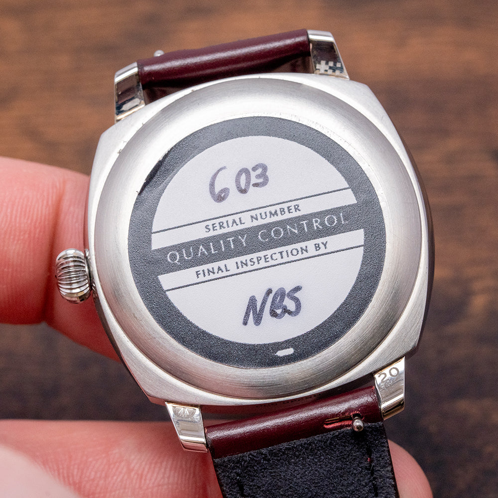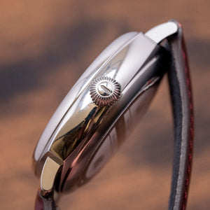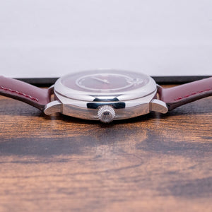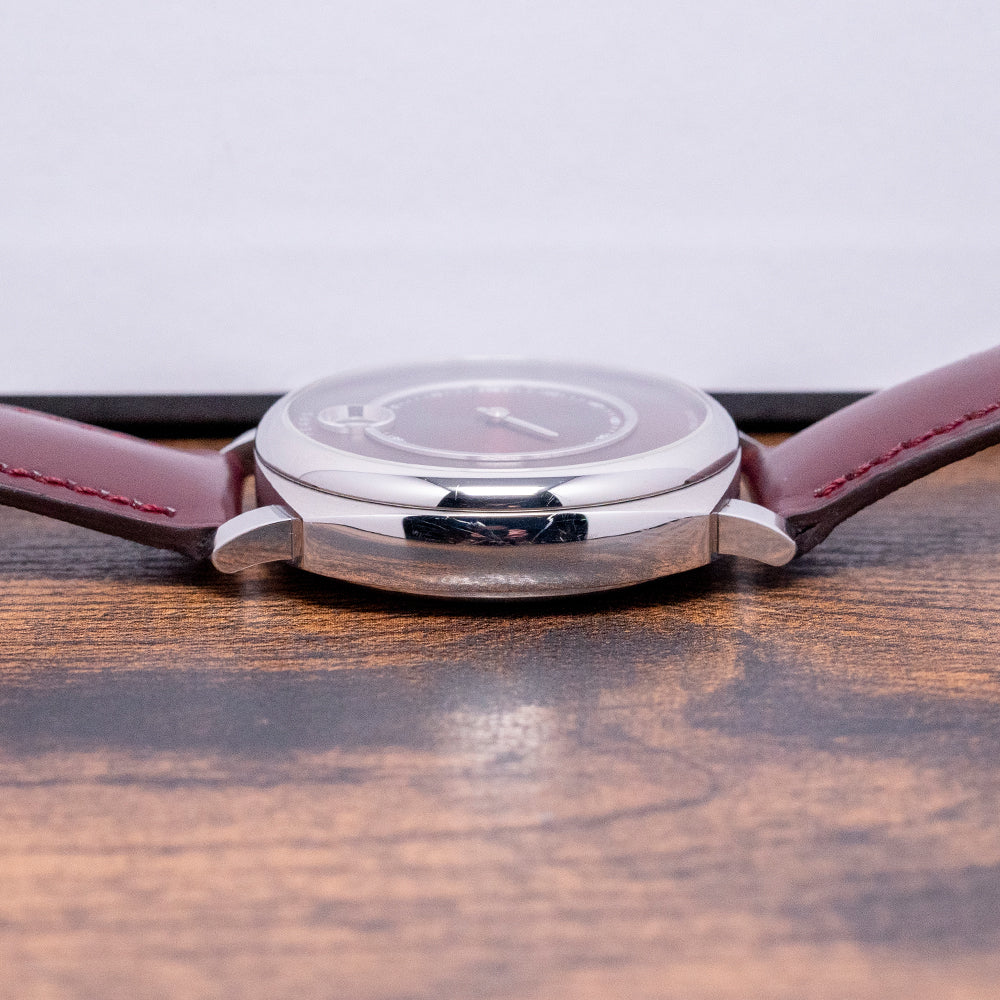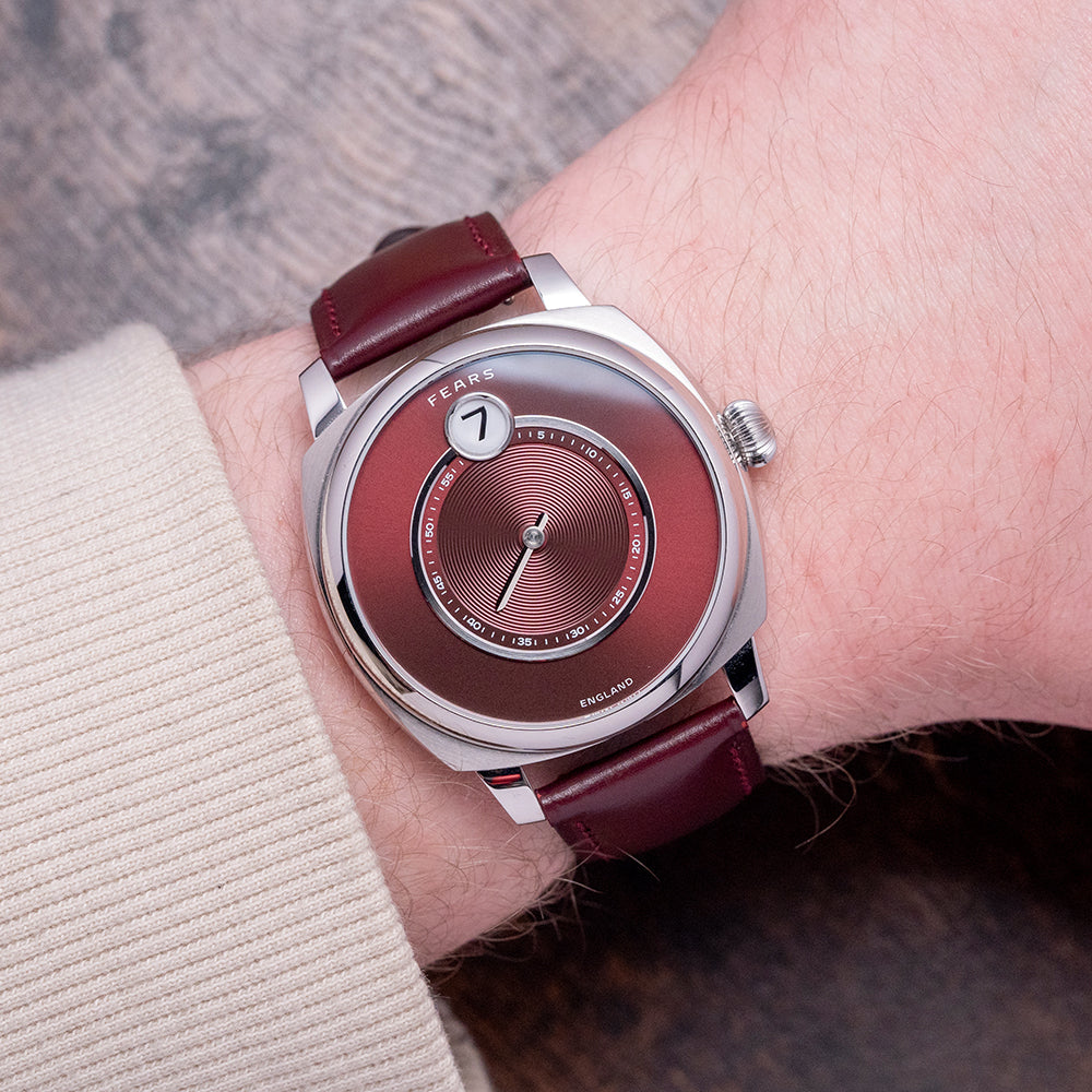 Here we have a 2023 Fears Christopher Ward Alliance 01 Jump Hour, a collaboration between two of the British Watch & Clock Makers Alliance brands. This special watch was only available to Alliance club members in very limited numbers of just 50 watches. Engraved under the four lugs are the logos of Fears, Christopher Ward, and the Alliance and on the fourth we have the number of the watch ranging from 01-50. The polished 40.5mm 316L stainless steel Brunswick case takes its inspiration for the case from a Fears watch originally made in 1924. The watch features a traditional “onion” shaped crown, signed with the Fears Pipette. The smooth polished bezel holds a domed sapphire crystal AR coated inside and out, above a stunning Burgundy Red matte lacquered dial. This distinctive dial is made up of an outer sunburst ring; at 12 o’clock, we have the hour window in white lacquer with black ink Fears “Edwin” typeface, intersecting a frosted minute chapter ring in silver ink numerals and a polished ring surrounds the deeply engraved concentric guilloche centre with the Fears shaped” minute hand that is Rhodium plated, half mirror diamond polished and half frosted. At 12 o’clock, we have the Fears motif, and at 6 o’clock, “England” in silver ink, completing this mesmerising dial. The light magically plays with the different surfaces as you rotate your wrist. Inside an automatic Modified Sellita SW200, this JJ01 movement has a module developed in-house by Johannes Jahnke, a former master watchmaker of Christopher Ward and is decorated with the Christopher Ward Twin Flags logo and Rhodium plated. The watch comes paired with its 20mm Fears Belgium handmade Burgundy Red, British calf leather, tanned in the UK, lined in Alcantara and a signed pin buckle; plus, a Fears quick-release five-link bracelet in milled 316L stainless steel; its flush-fitting gives it an integrated aesthetic; the alternating polished and brushed finishing complements the case finishing, secured to the wrist with a push-button release butterfly clasp, all links are included. The watch comes with its original Fears bespoke English Ash wooden presentation box, swing tag and Fears paperwork.