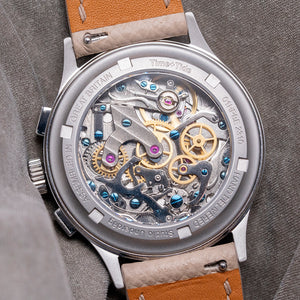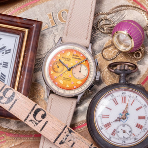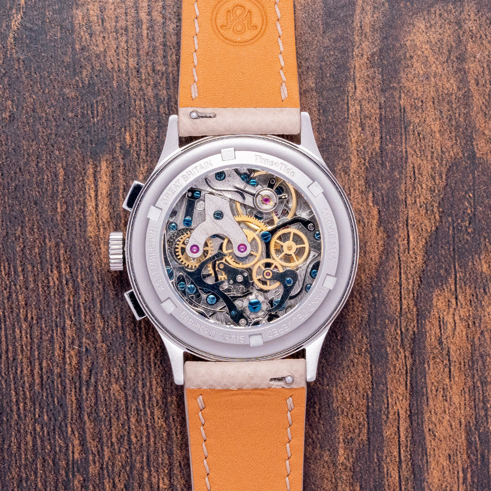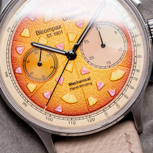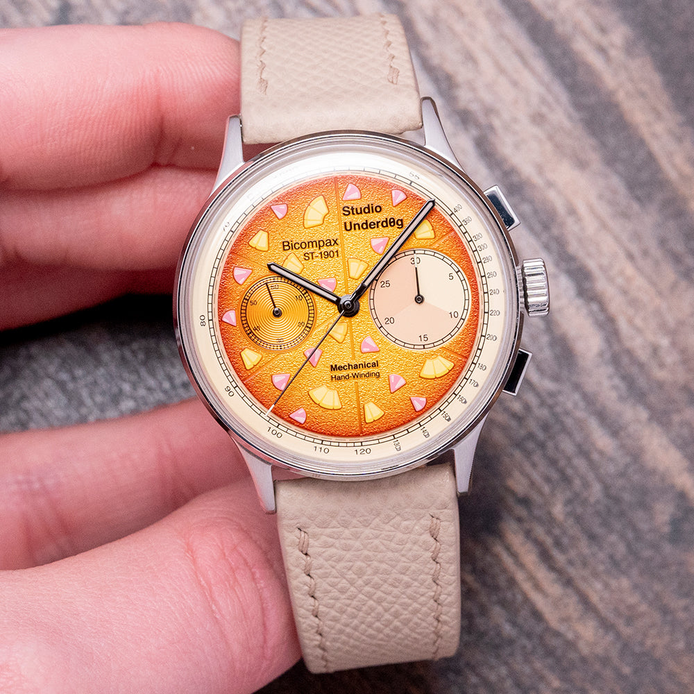 The 38.5mm brushed stainless steel case has elegant tapered curved lugs with a lug-to-lug length of 44.5mm and a case thickness of 13.5mm, giving the watch an impressive wrist presence. We have the signed crown and the polished chronograph pushers on the right side. The bevel-edged stepped polished smooth bezel holds a double-domed sapphire crystal above the striking characteristic colourful dial. Made up of 2 layers: a satin sandblasted base layer and a coarse-textured crusty cheese centre layer that graduates from an orange in the centre to a darker orange crunchy outer edge. An outer Tachymetre is precisely printed against the pale beige-coloured layer. The dial is randomly sprinkled with delicious ham and pineapple pieces; at 3 o’clock, a large 30-minute register made up of varied hues of brown and cream-coloured segments and a beige-tipped hand; at 9 o’clock, the small second register in orange with a concentric circular pattern. The slender black-outlined sword hands are filled with Super-LumiNova, complemented by a beige-tipped chronograph hand. Text is precisely applied with the bold Studio Underd0g motif sitting proudly off-centre. The combination of colour and textures makes this Bi-Compax a pleasure to wear. On the reverse is a screw-down exhibition sapphire crystal case back, inside a manually wound Seagull ST-1901 is a true workhorse of a movement that uses the technical drawings of the Swiss Venus calibre 175 but is made in China. Its simplicity in decoration adds interest both front and back to this watch. The watch comes fitted on its original 20mm Strap Tailor quick-release leather strap and signed pin buckle and comes with its Studio Underd0g pizza presentation box, travel pouch and papers.