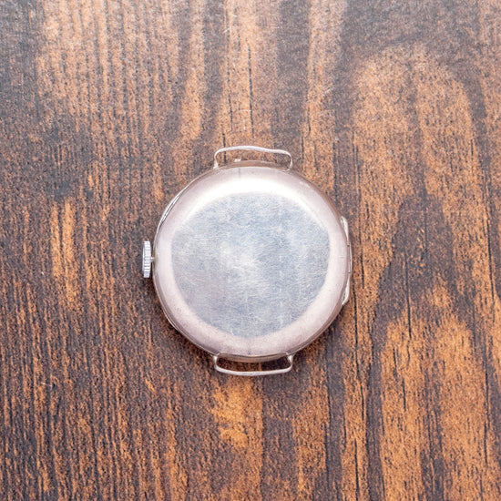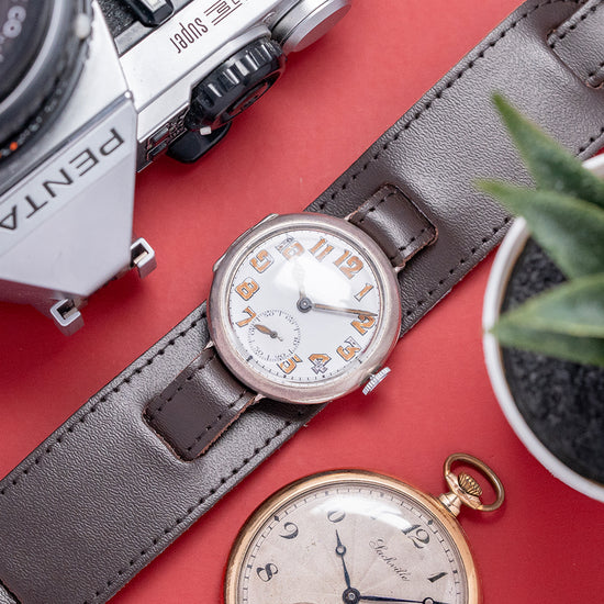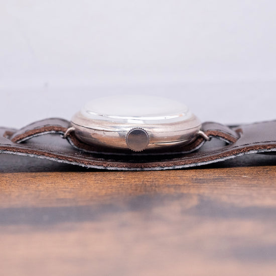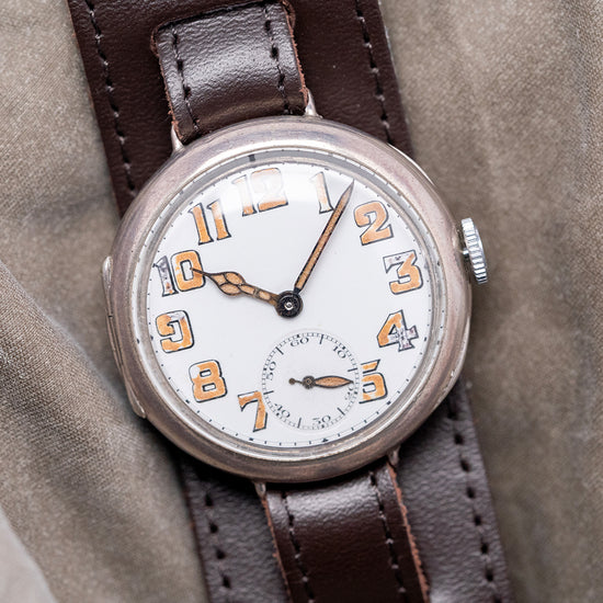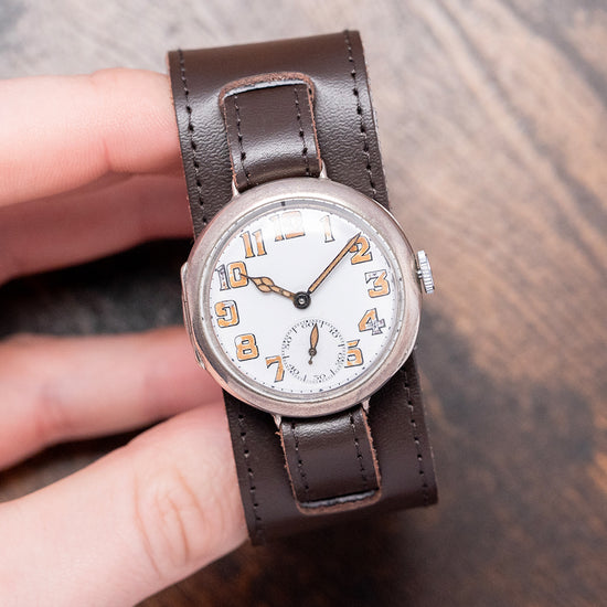 Here we have an early World War I-era 1917 Tavannes Cal. 330 .925 Sterling Silver Trench Watch featuring a 34mm Sterling Silver round case that comfortably sits on your wrist, with delicate wired lugs. Its curved flanks lead to a lug-to-lug length of 39mm and a case thickness of 11.5mm. On the right side, a coin-edged crown. A thin, smooth bezel holds a domed crystal above a striking white enamel dial. An outer minute track surrounds large Arabic numerals painted in Radium, marking the hours. Elegant Cathedral hands filled with Radium sit majestically above a sub-second, complete with a leaf hand, which completes this distinctive early Trench watch. On the reverse, a hinged solid .925 Sterling Silver case back, inside a manually wound Tavannes Cal. 330, 15 jewel movement. It is paired with a 12mm leather bund strap; the bund strap's back can be removed.