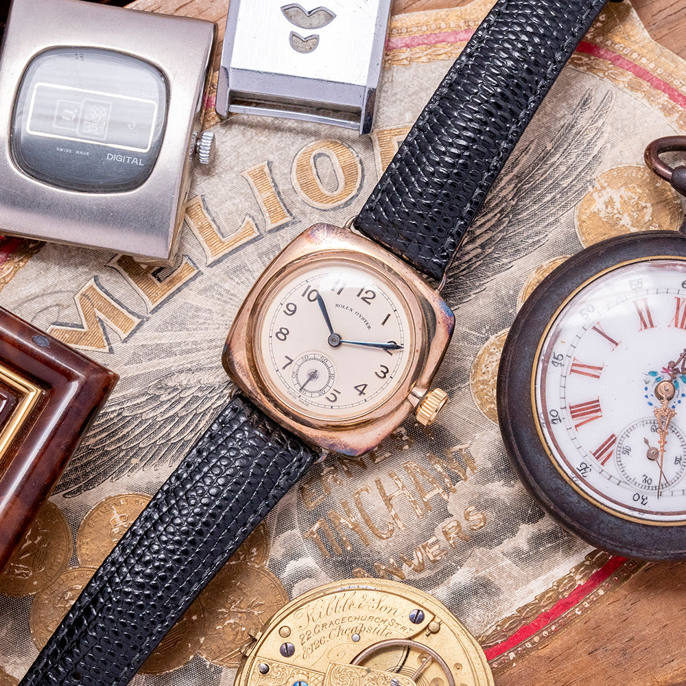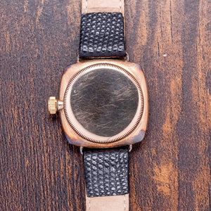 Here we have an early 1934 Rolex Oyster 678 with a characteristic 31.5mm 9ct Gold Cushion case with fixed wire lugs. Its slim profile leads to a lug-to-lug length of 36mm and a case thickness of 9.5mm, ensuring a comfortable fit on your wrist. On the right side is a large coin-edged signed screw-down crown. The soft, rounded edges add an understated elegance, and its smooth bezel holds a domed crystal that protects the crisp white dial. An outer minute track surrounds gold-painted Arabic numerals marking the hours, which play with the light as you rotate your wrist. Delicate thermally blued hands are complemented by running seconds at six o’clock; at 12 o’clock, we have the simple Rolex Oyster motif completing this very early vintage timepiece. On the reverse, a screw-down coin-edged solid case back, inside a Manually Wound 15 Jewel Rolex movement. It comes paired with a 16mm well-suited leather strap.