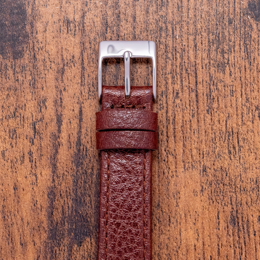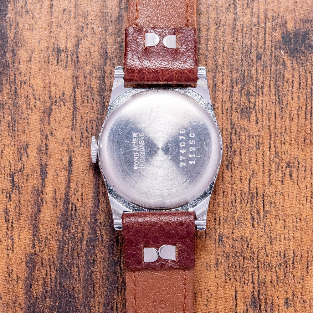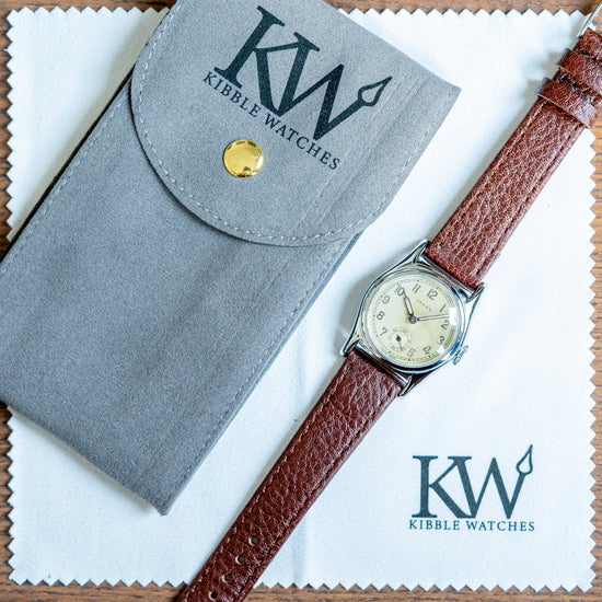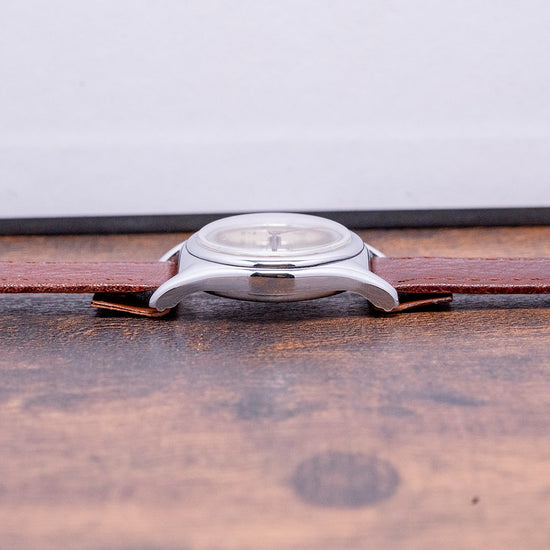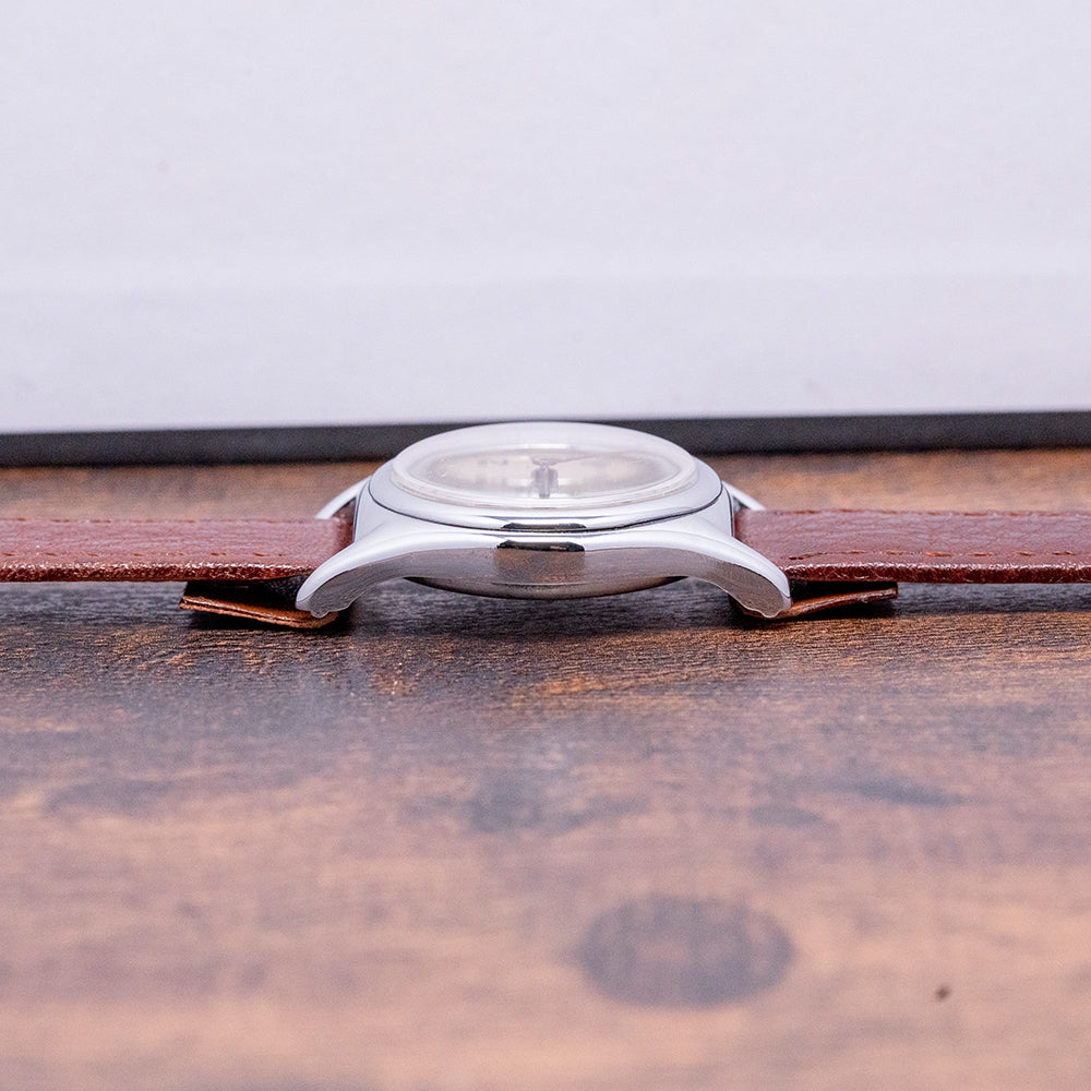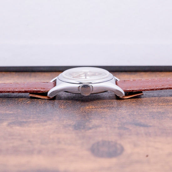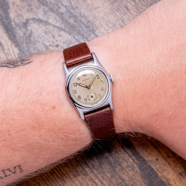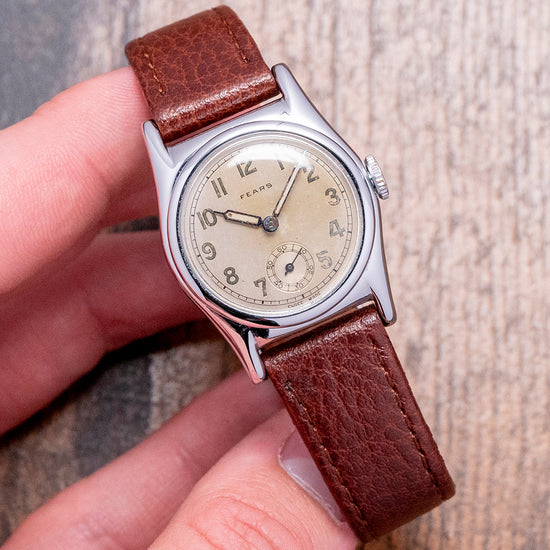 Here we have a classic 1939 Fears Bristol Manually Wound 11250 with a 28mm Chrome round case. The curved flanks lead to slender curved lugs that hold the fixed spring bars perfect for open-ended straps, and a lug-to-lug length of 36.5mm and a case thickness of 9mm ensures a comfortable fit on your wrist. On the right side is a coin-edged push/pull crown. The smooth chrome-plated bezel holds a domed crystal above an attractive, even patina dial. An outer minute rail track surrounds Arabic numeral indices coated in Radium, marking the hours; at 6 o’clock, a slightly recessed sub-seconds dial with a thermally blued hand, in the centre original thermally blued “Fears Pipette” hands infilled with lume. At noon we have the Fears motif completing this delightful vintage timepiece. On the reverse, an engine-turned stainless steel “Fond Acier Inoxydable” snap-off case back is engraved with the Serial and reference number, inside a manually wound FHF Cal. 31, 15 jewels, beating at a leisurely 18,000 beats per hour. The watch comes paired with its 16mm open-ended leather strap secured with a pin buckle.