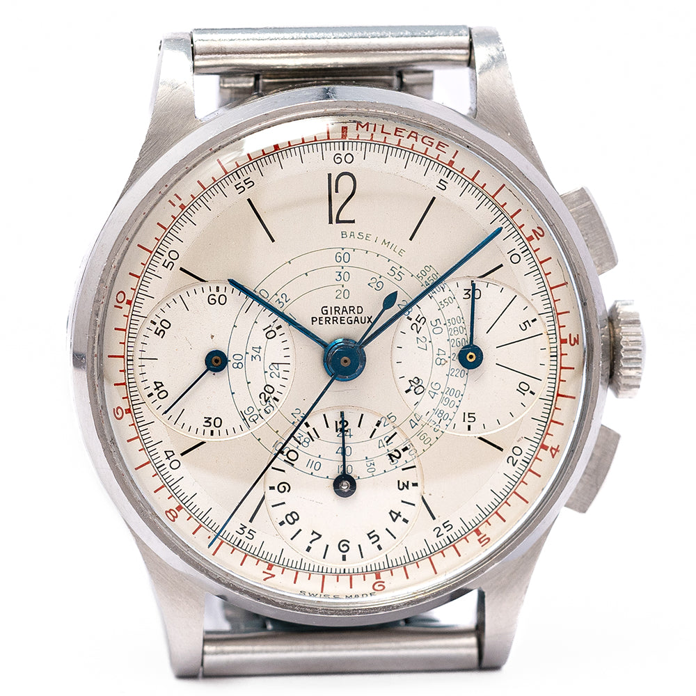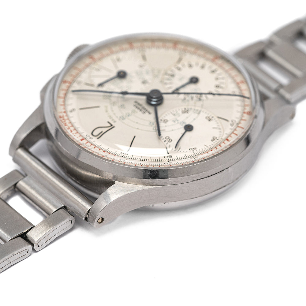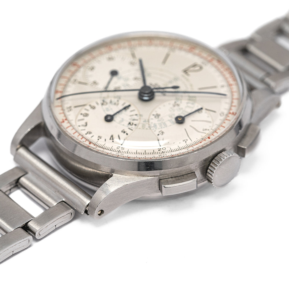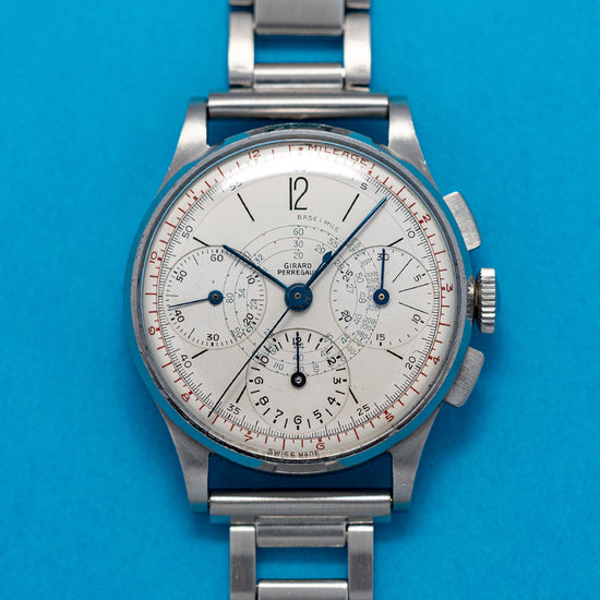 Here we have an outstanding 1940s Girard Perregaux Chronograph UG Cal. 285 with a 34mm stainless steel case, the curve of the case leads to drill tapered lugs and a lug-to-lug length of 41.5mm and a case thickness of 12.5mm ensuring a comfortable fit on your wrist. Down the right side, we have the chronograph pushers and a large crown in the centre. A thin smooth bezel holds a domed crystal above a stunning white dial, an outer mileage scale in red ink and a 60-second scale in black underneath are precisely executed. A large Arabic 12 with thin baton indexes marks the hours, at 3 o’clock a 30-minute register, at 6 o’clock a 12-hour register and finally a continuous seconds register each slightly recessed with thermally blued hands. In the centre intersecting the registers, we have three further scales including a Tachymetre. These scales were an important tool used in the military and other applications. Thin thermally blued hands complemented by a teardrop counterweighted chronograph hand complete this dynamic dial, in the centre, we have the Girard Perregaux motif. On the reverse, a snap on case back with an applied ships wheel with a flag on top and the letter "R" "1940 - 41", a possible yacht club connection presented to the Commodore for those years. Inside a quality manually wound Universal Geneve Cal. 285, 17 jewels, 18,000 beats per hour, column wheel chronograph movement. The watch comes fitted on an 18mm bracelet and also comes with an 18mm leather strap.