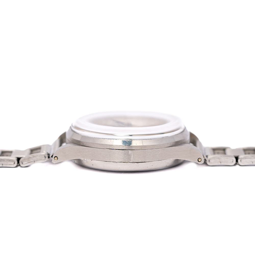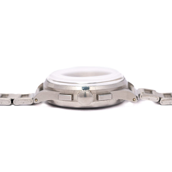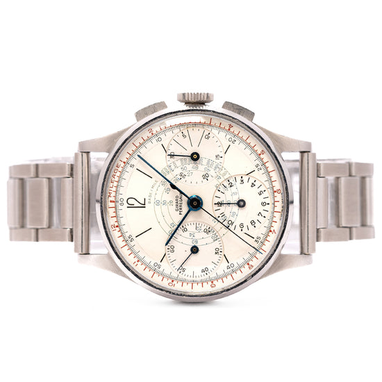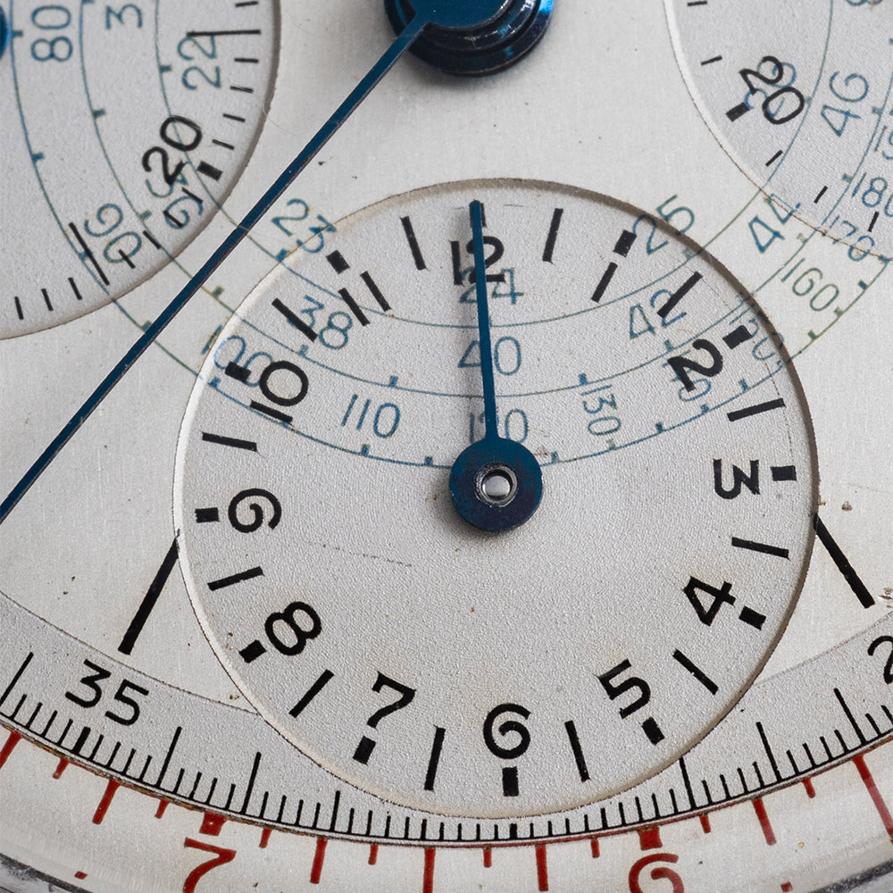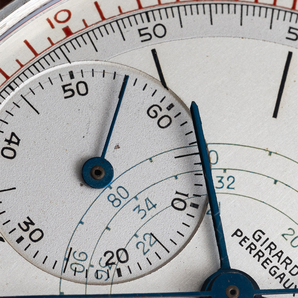 Here we have an outstanding 1940s Girard Perregaux Chronograph UG Cal. 285 with a 34mm stainless steel case, the curve of the case leads to drill tapered lugs and a lug-to-lug length of 41.5mm and a case thickness of 12.5mm ensuring a comfortable fit on your wrist. Down the right side, we have the chronograph pushers and a large crown in the centre. A thin smooth bezel holds a domed crystal above a stunning white dial, an outer mileage scale in red ink and a 60-second scale in black underneath are precisely executed. A large Arabic 12 with thin baton indexes marks the hours, at 3 o’clock a 30-minute register, at 6 o’clock a 12-hour register and finally a continuous seconds register each slightly recessed with thermally blued hands. In the centre intersecting the registers, we have three further scales including a Tachymetre. These scales were an important tool used in the military and other applications. Thin thermally blued hands complemented by a teardrop counterweighted chronograph hand complete this dynamic dial, in the centre, we have the Girard Perregaux motif. On the reverse, a snap on case back with an applied ships wheel with a flag on top and the letter "R" "1940 - 41", a possible yacht club connection presented to the Commodore for those years. Inside a quality manually wound Universal Geneve Cal. 285, 17 jewels, 18,000 beats per hour, column wheel chronograph movement. The watch comes fitted on an 18mm bracelet and also comes with an 18mm leather strap.