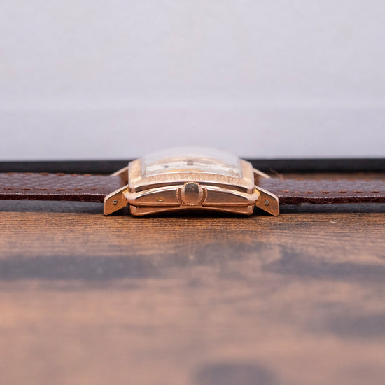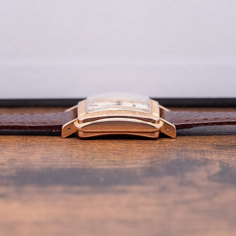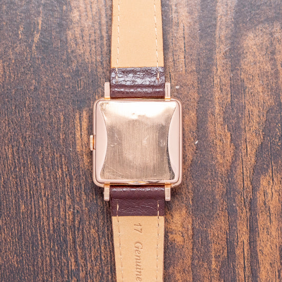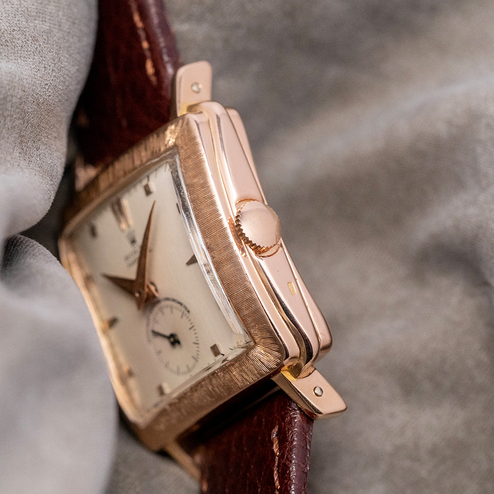 Here we have an exquisite 1940s Rolex Perpetual Square 'Bark' Finish 4643 featuring a square 28mm hallmarked 18ct Pink Gold case that comfortably sits on your wrist with straight drilled lugs. The straight-stepped flanks delicately curve towards a lug-to-lug length of 37mm and a case thickness of 12mm. On the right side, a thin coin-edged crown. The square bezel features a beautiful ‘Bark’ finish and holds a box-shaped crystal above a stunning dial. An outer minute chapter ring surrounds delicate gold faceted indices marking the hours. Perfectly formed gold Dauphine hands sit majestically above a subdial. At noon, we have the Rolex crown, ‘Rolex Perpetual’, ‘ Officially Certified Chronometer’, which completes this incredible vintage dress watch. On the reverse, a bubble caseback, inside a very early automatic Rolex Cal. 9 ¾. It comes paired with a well-suited 17mm leather strap and pin buckle.