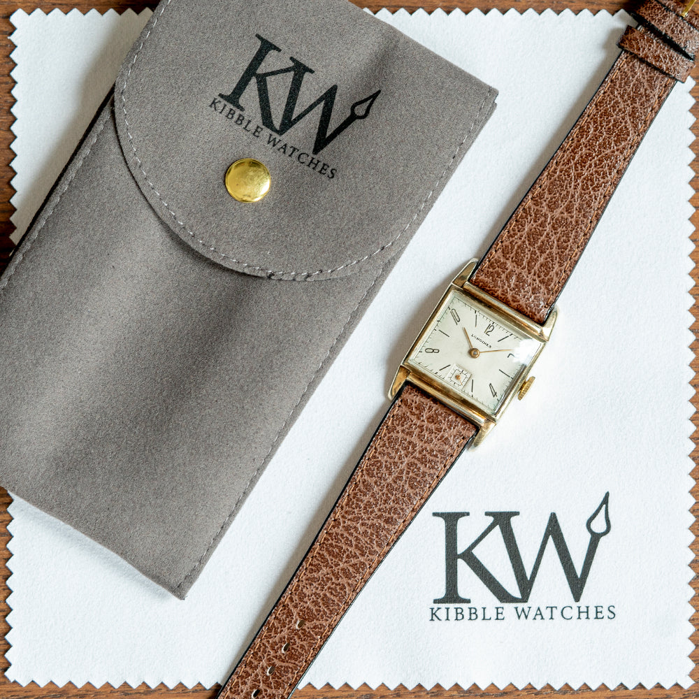 Here, we have a 1943 Longines Art-Deco Gold Filled Manually Wound with a 25mm 10K Gold-filled sculpted square case. Elegant tapered lugs subtly curve over your wrist, the geometric-shaped flanks lead to a lug-to-lug length of 37mm and a case thickness of 10mm, which ensures a comfortable fit and reminds us of the Art Deco form and architecture of that time. On the right side is a slim coin-edge push/pull crown. The prominent box-shaped crystal sits above an even patina white dial, an outer minute track surrounds attractive radiating Art Deco numerals and slim baton indices marking the hours. Gold stick hands sit majestically in the centre above a square sub-dial, and at 12 o’clock, the Longines motif completes this cosmopolitan vintage timepiece. On the reverse, a 10k Gold-filled snap-off case back, inside a manually wound Longines Cal. 10L, 17 jewel movement. The watch comes paired with a well-suited 19mm aftermarket leather strap and a gold-plated pin buckle.