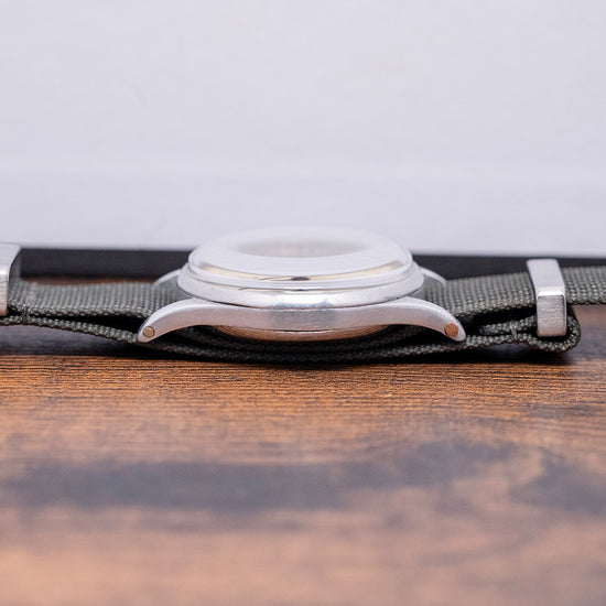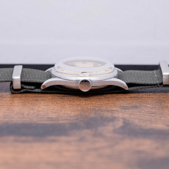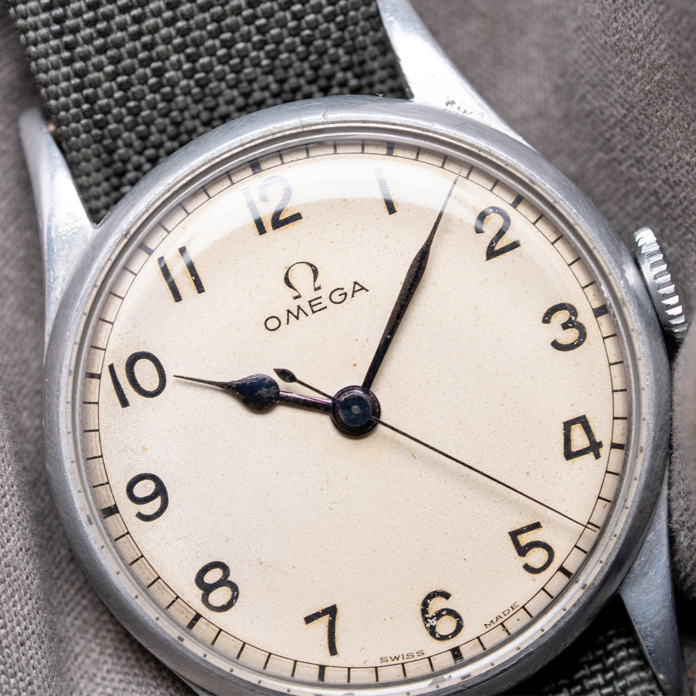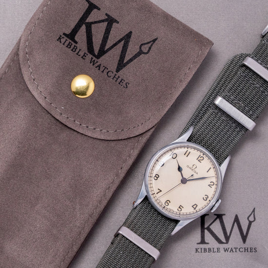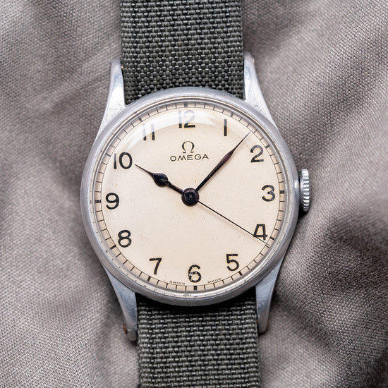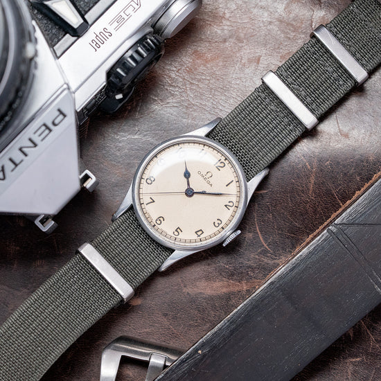 Here we have a rare 1944 Omega 6B/159 RAF Pilots Wristwatch 2292 issued to RAF pilots and navigators during World War II, used for dead reckoning calculations, allowing pilots and navigators to determine their position based on speed, heading, and elapsed time. Featuring a 33mm duraluminum case that curves over your wrist with fine tapered lugs and fixed spring bars, perfect for NATO straps. Its curved flanks lead to a lug-to-lug length of 42.5mm and a case thickness of 12mm, ensuring a comfortable fit on your wrist. On the right side, there is a large coin-edged crown. The smooth steel bezel holds a domed crystal above a cream dial. An outer railroad minute track surrounds black Arabic numerals marking the hours, thermally blued spade and syringe hands are complemented by a sweeping second hand. At noon, we have the Omega motif. On the reverse, a snap-off case back, engraved with 6B/159, A11865 and the Broad Arrow (also known as a pheon or crow's foot), a stylised arrowhead used for centuries by the British military and government to mark property and ordnance. Inside a manually wound Omega Cal. The 30T2 SC, featuring 16 jewels that beat at a leisurely 18,000 beats per hour, is highly regarded by collectors and the industry for its reliability and accuracy. The Cal. 30 series of movements was produced from 1939 until 1963. It comes paired with a well-suited aftermarket NATO strap.