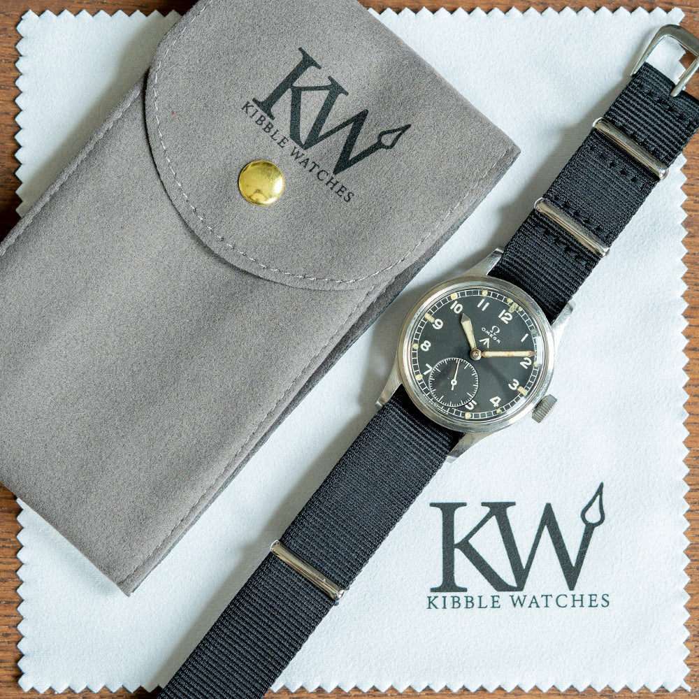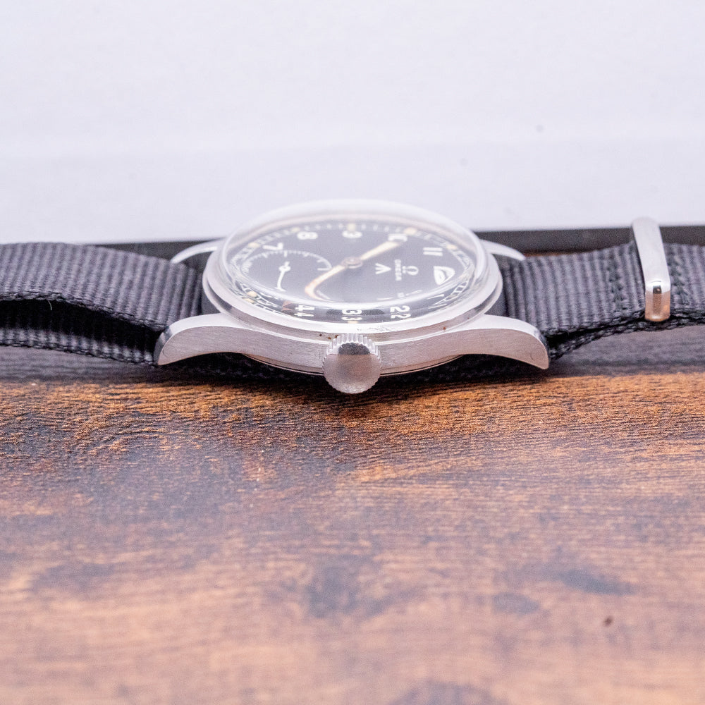 Here we have a 1944 Omega WWW Dirty Dozen 35mm Cal. 30T2 Military Watch. As a military-issue watch, it was part of the 12 brands: Buren, Cyma, Eterna, Grana, Jaeger-LeCoultre, Lemania, Longines, IWC, Omega, Record, Timor, and Vertex commissioned by the military during WWII. The 35mm stainless steel round case comfortably fits on your wrist thanks to tapered lugs, fixed spring bars, a 45mm lug-to-lug length, and an 11.5mm case thickness. A smooth bezel holds a domed crystal above a black dial. An outer minute rail track surrounds Arabic numerals coated in radium luminance, marking the hours, and elegant hands filled with radium luminance sit above a sub-second at 6 o’clock. At 12 o’clock, we have the Omega motif and the Broad Arrow (pheon), the mark indicating British Government Issue property. On the reverse, a screw-down case back with W.W.W. Y22446 10259515 / 10686645 engraved. WWW stands for Watch, Wrist, Waterproof, and the Broad Arrow (pheon), the mark indicating British Government Issue property. Inside a manually wound Omega Cal. 30T2, a Swiss 15 jewel movement beating at a leisurely 18,000 beats per hour and is highly regarded by collectors and industry for its reliability and accuracy, the Cal. 30 series of movements was first produced in 1939 until 1963. The watch comes paired with an 18mm NATO strap and pin buckle.