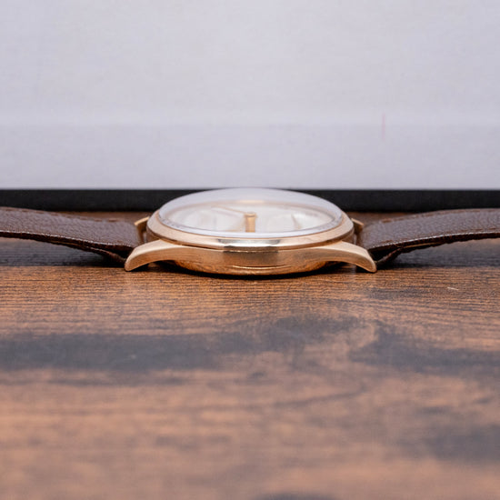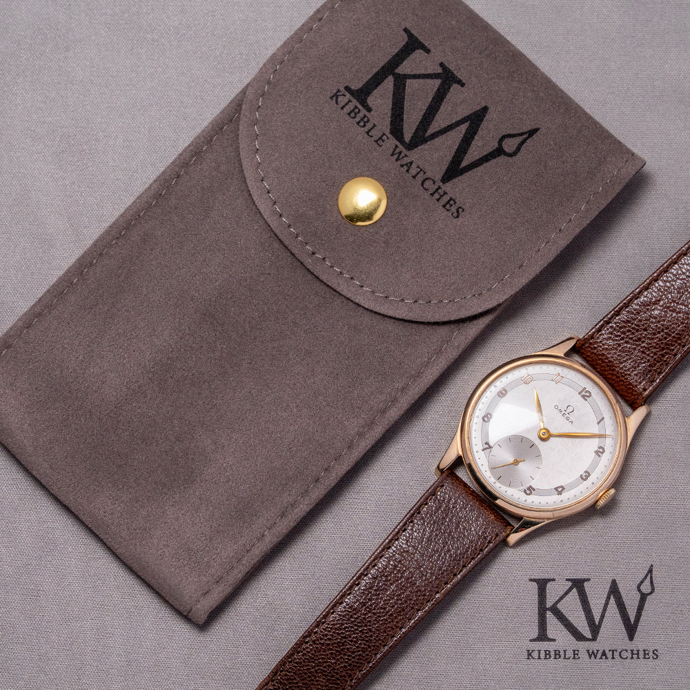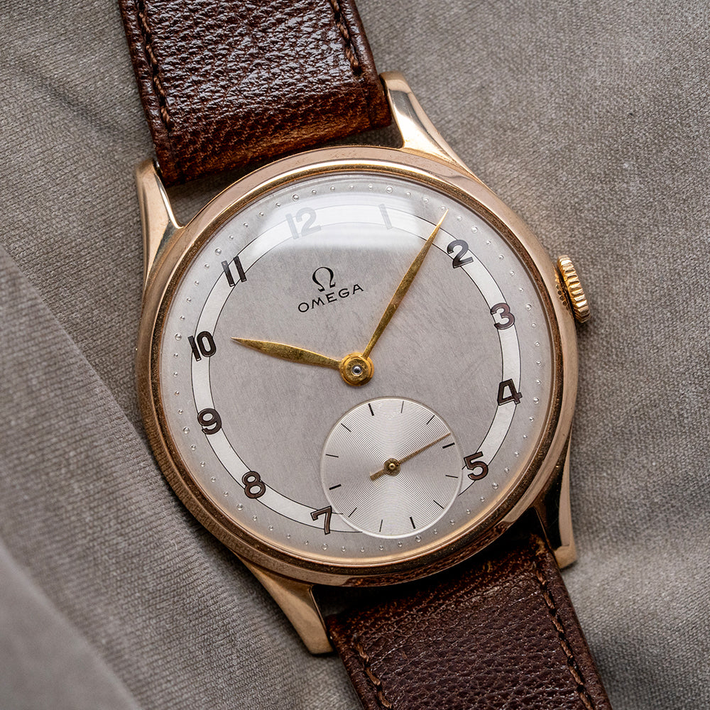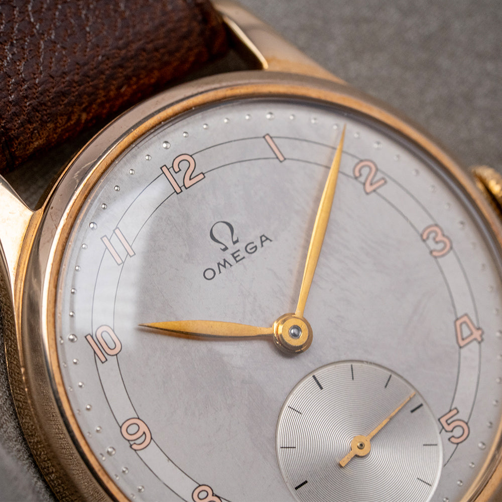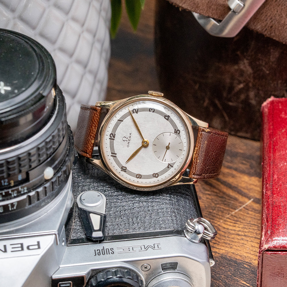 Here, we have a rare 1947 Omega Cal. 30T2 219370. Featuring a 33mm 9ct Yellow Gold round case made by Dennison. A.L.Dennison moved to Birmingham around 1871, where he produced high-quality watch cases. In no time, Omega took notice and decided to commission ALD. Some of Omega’s finest cases are made by Dennison. Comfortably sits on your wrist thanks to tapered hallmarked drilled lugs, a 40mm lug-to-lug length, and a 9.5mm case thickness. The smooth bezel holds a domed crystal above an attractive silver and gilt sector dial. Outer minute pips surround Arabic numerals marking the hours, and elegant yellow gold leaf hands sit above a large recessed sub-second at 6 o’clock. At 12 o’clock, we have the Omega motif. On the reverse, a snap-off case back, Swiss hallmarked on the inside, a manually wound Omega Cal. 30T2, a Swiss 15 jewel movement beating at a leisurely 18,000 beats per hour, is highly regarded by collectors and industry for its reliability and accuracy. The Cal. 30 series of movements was first produced from 1939 until 1963. It is paired with an 18mm vintage Omega strap and vintage gold-plated pin buckle.