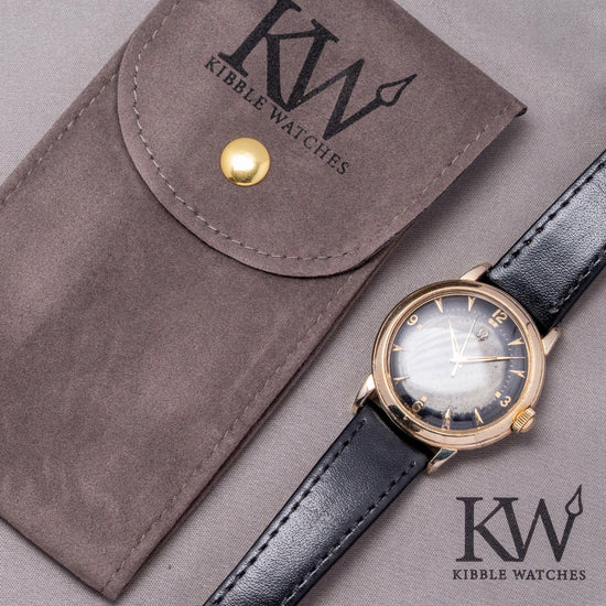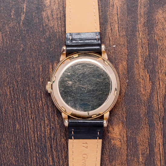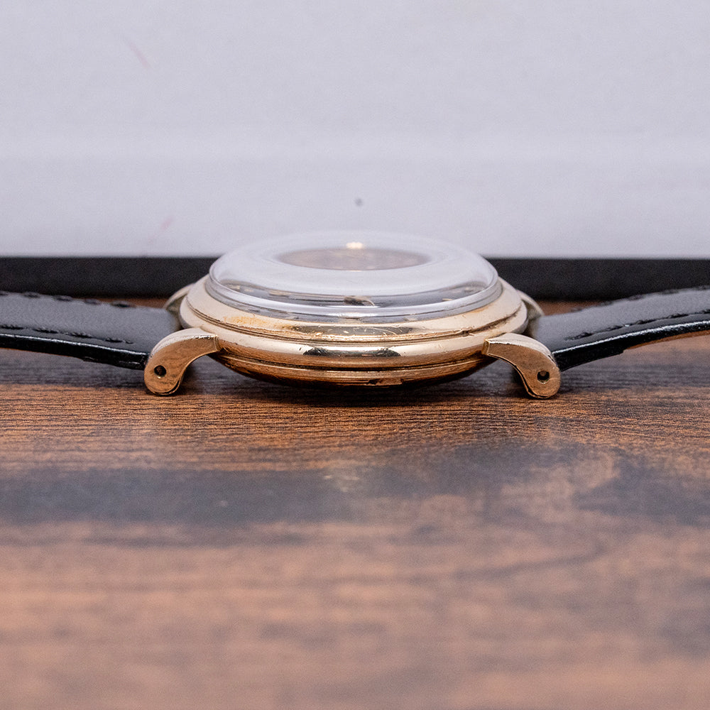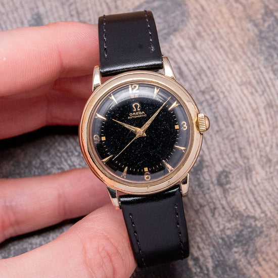 Here we have a 1950 Omega 'Wadsworth' Gilt Bumper Automatic G6232, featuring a Wadsworth-made 34mm 14K Gold-filled case that sits comfortably on your wrist with teardrop drilled lugs. Harry A. Wadsworth, J.H. Stegeman, and H. Remke established H.A. Wadsworth & Co. in 1889 in Dayton, Kentucky, USA. In January 1892, the company was renamed the Wadsworth Watch Case Company. The factory specialised in the production of gold-filled watch cases and ceased operations in 1958. The sculpted curved flanks lead to a lug-to-lug length of 40.5mm and a case thickness of 11mm, ensuring a comfortable fit on your wrist. On the right side, a domed coin edged crown. The smooth bezel holds a domed crystal above a stunning black gloss dial. Facet-edged gilt dagger and Arabic numerals mark the hours surrounding an inner minute track, with square lume markers at the cardinal points. Elegant gilt Dauphine hands, filled with lume, are complemented by a tapered sweeping second hand. At noon, we have the Gilt Omega motif with Automatic underneath, completing this distinctive dress watch. On the reverse, a screw-down 14K gold-filled solid case back, inside a Bumper Automatic Omega Cal. 351, 17 jewels, beating at 19,800 beats per hour. This movement, produced from 1949 to 1952, features an oscillating rotor that oscillates between springs in a limited arc to wind the mainspring. It comes paired with a well-suited 17mm leather strap and pin buckle.