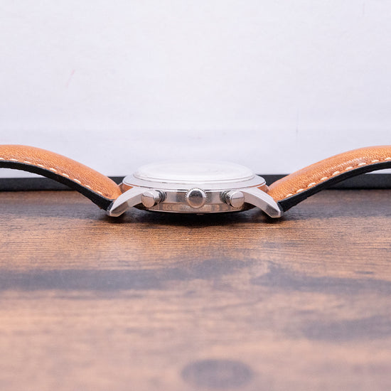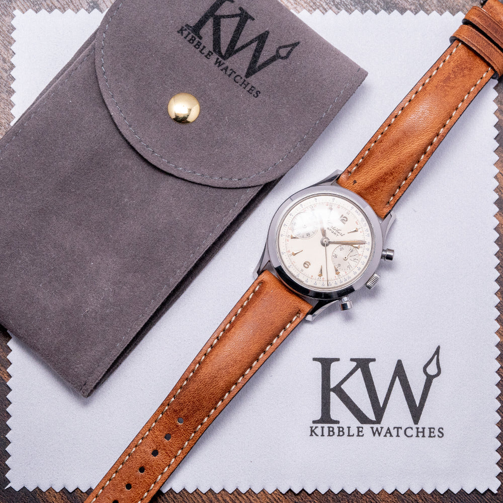 Here we have a 1950s Cortébert 'Sport' Chronograph Valjoux 23 with a 35mm stainless steel round case that curves over your wrist, thanks to the chamfered-edged tapered lugs, the lug-to-lug of 42.5mm and a case thickness of 11mm ensures a comfortable fit. The piston pushers and a large crown are on the right side in the centre. The smooth bezel holds a domed crystal above an off-white dial. An outer blue Tachymeter scale surrounds a red Telemeter scale and minute track, precisely executed, facet dagger indexes with lume pip, Arabic 12 and 6 mark the hours; at 3 o’clock a recessed 30-minute register; at 9 o’clock the running seconds, elegant leaf hands filled with lume are complemented by a tapered chronograph hand, at 12 o’clock we have the Cortébert 'Sport' motif completing this striking vintage sports chronograph. On the reverse, a screw-down case back engraved with the details of the watch, inside a manually wound Valjoux Cal. 23, 17 jewels, beating at a leisurely 18,000 beats per hour. This early column wheel movement was in production from 1916 until 1974. It comes paired with a 19mm well-suited leather strap.