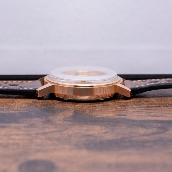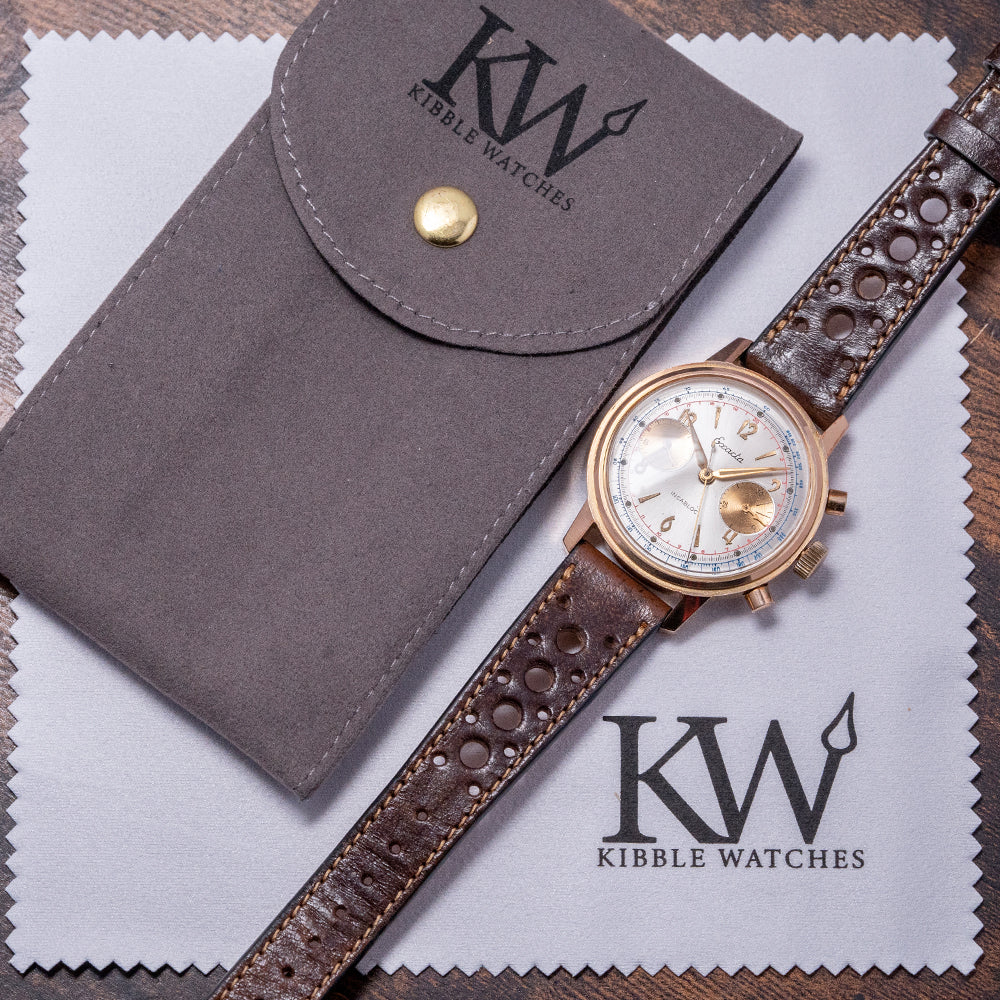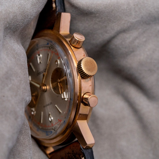 Here we have a charismatic 1950s Exacta Chronograph Landeron 51, featuring a round 37 mm gold-plated case that gently curves over your wrist, complemented by tapered lugs. Its curvaceous flanks lead to a lug-to-lug length of 44mm and a case thickness of 12.5mm, ensuring a comfortable fit. Down the right side, we have the rectangular pushers and a coin-edged crown in the centre, its stepped smooth bezel holding a domed crystal above a stunning sunburst silver bicompax dial. An outer blue Tachymeter scale surrounds a minute track, and a red Telemetric scale is precisely executed. Gold-toned Arabic numerals and spearhead indexes have a sheen to them that plays with the light, marking the hours; at 3 o’clock, a recessed 30-minute register and at 9 o’clock, the running seconds register are each gold-toned with concentric circular patterns. Elegant gold-plated hands are complemented by a teardrop counterweighted chronograph hand. At noon, the Exacta motif is displayed, and “Incabloc” is shown at 6 o’clock, completing this amazing vintage bicompax. On the reverse, a snap-off case back houses a Manually Wound Landeron Cal. 51, featuring 17 jewels and beating at a leisurely 18,000 beats per hour. It comes paired with a 19mm well-suited leather strap.