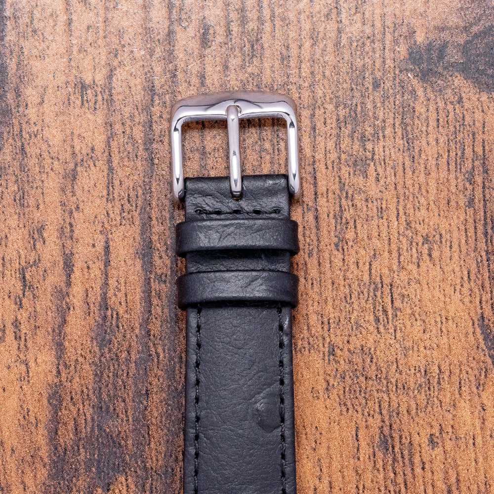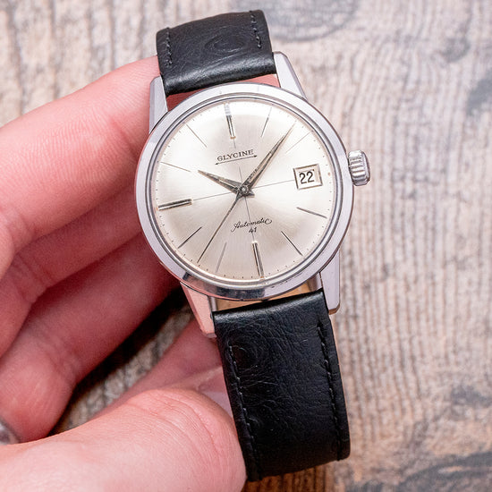 Here we have a 1950s Glycine Automatic 41 ETA 2452 Date Crosshair Dial with a 34mm round stainless steel case that sits comfortably on the wrist thanks to its tapered angled drilled lugs, 42 mm lug-to-lug length, and 10 mm case thickness. On the right side is a coin-edged crosshatch crown. The smooth bezel holds a domed crystal above a cross-hair silver dial, and an outer minute track surrounds applied slim baton indexes marking the hours; at 3 o’clock, a framed date window, elegant steel Dauphine hands are complemented by a tapered second hand, at 12 o’clock we have the Glycine motif and at 6 o’clock “Automatic 41” completes this vintage dress watch. On the reverse, a solid case back, inside an automatic ETA Cal. 2452, 25 jewels, beating at a leisurely 18,000 beats per hour, this workhorse movement was in production from 1956 until 1974. The watch is paired with a well-suited 18mm aftermarket strap and pin buckle.