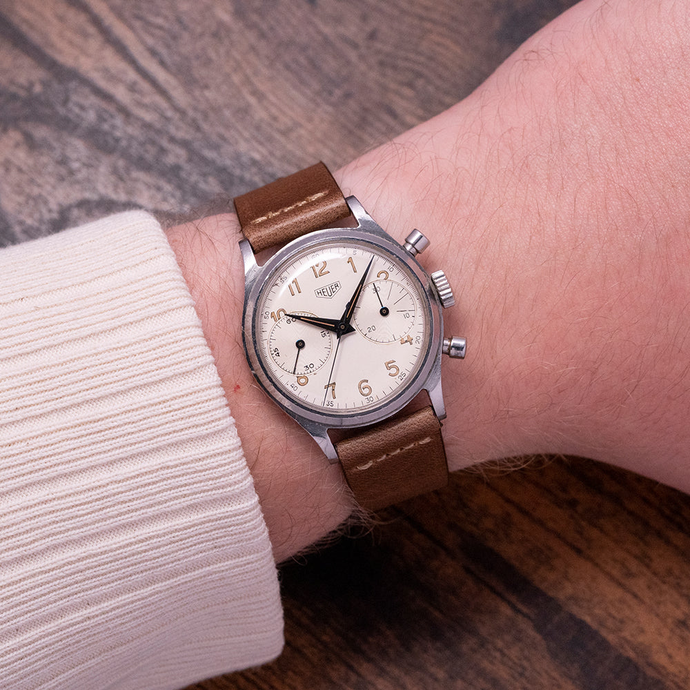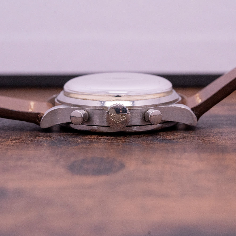 Here we have a 1950s Heuer Chronograph 68952 with a 35mm Stainless Steel case that curves over your wrist with refined tapered lugs, a lug-to-lug length of 42mm and a case thickness of 13mm ensuring a comfortable fit. Down the right side, we have piston-style chronograph pushers and a signed push/pull crown in the centre. A smooth bevelled-edged bezel holds a domed crystal above a white dial, an outer minute track is precisely executed with tritium-coated Arabic numerals marking the hours, the bicompax chronograph consists at 3 o'clock a 30-minute register and at 9 o'clock continuous second's register. Each register is finely printed with a stick hand, and elegant thermally-blued Dauphine hands infilled with Tritium are complemented by a tapered chronograph hand. At 12 o'clock we have the Heuer motif completing this vintage bicompax chronograph. On the reverse a screw-down case back, inside a manually wound Valjoux 23, 17 jewels, beating at a leisurely 18,000 beats per hour, fitted with a later Valjoux 230 balance. A true workhorse of a column wheel chronograph that was in production from 1916 until 1974. The watch comes paired with a well-suited 19mm leather strap.