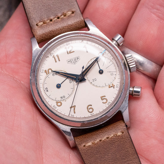This watch is sold as "Watch Only" and therefore comes with no original Heuer box or paperwork. The watch comes paired with a well-suited 22mm leather strap. The watch is from Circa. 1950s and is sold in worn, vintage condition with signs of wear, but overall fair condition, as can be seen from the photographs. The watch comes with our 12-Months NON-Waterproof Warranty.