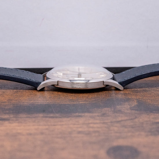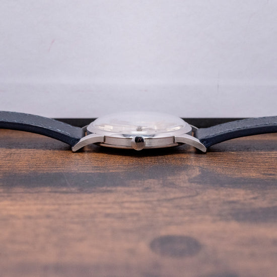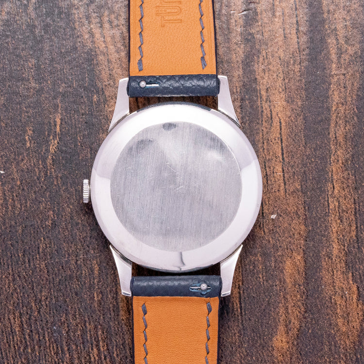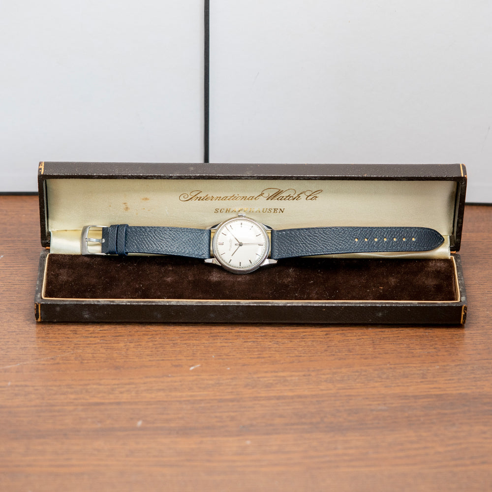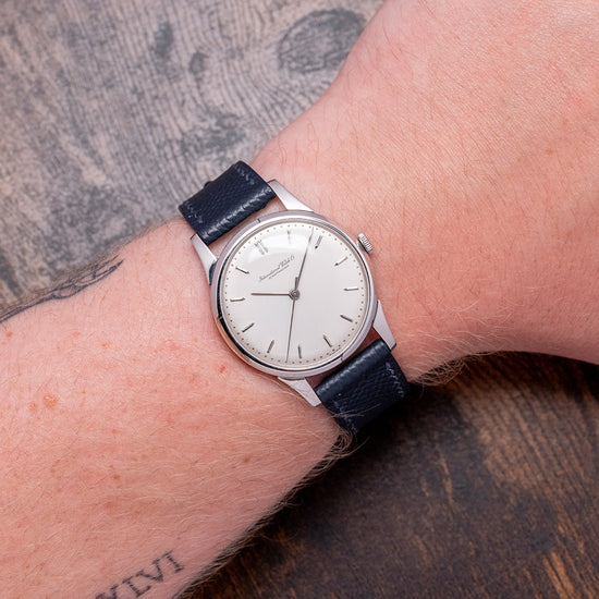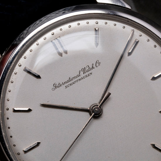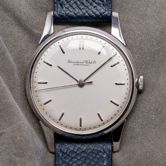 Here, we have a rare classic 1950s IWC Cal89 Platinum Japanese Market 'Calatrava'. The 34.5mm brushed and polished Platinum case gently curves over your wrist with finely tapered lugs. In the 1950s, ISOMURA Co. secured permission from IWC Schaffhausen to produce platinum cases for IWC watches, as a way to bypass high import costs, including a 30% duty and a 13% tax on precious metals. Other luxury brands like Rolex and Gruen soon followed suit. The Japanese market cases were notably inscribed with “PT900, Japanese flag PM900,” marking their quality and origin. Its curvaceous flanks lead to a lug-to-lug length of 44mm and a case thickness of just 8.5mm, ensuring a comfortable fit on your wrist. On the right side is a coin-edge crown. A smooth bezel holds a domed crystal above a crisp white dial in a configuration very much like the "Patek Calatrava" dials of the same time period. An outer minute track surrounds applied bullet-shaped indexes marking the hours; elegant stick hands are complemented by a tapered second hand. At 12 o’clock, we have the original IWC motif in an attractive swirling font. On the reverse, a solid brushed and polished case back, inside is a manually wound IWC Cal. 89, 16 jewels, beating at a leisurely 18,000 beats per hour. This Albert Pellaton-designed movement was introduced in 1946 and remained in production until 1979. The watch comes paired with a well-suited quick-release 18mm leather strap and pin buckle. It comes with its original IWC presentation box.