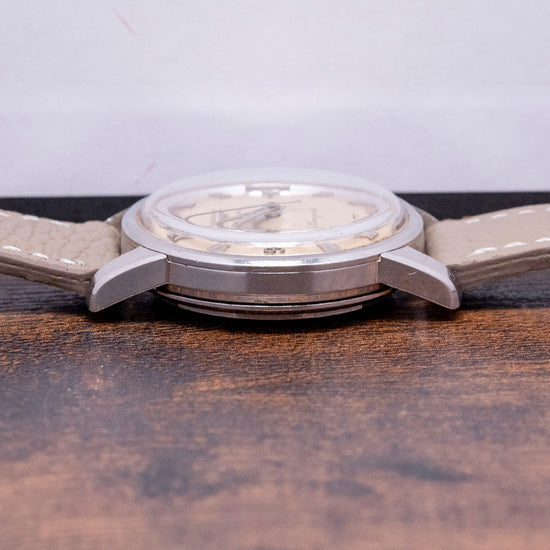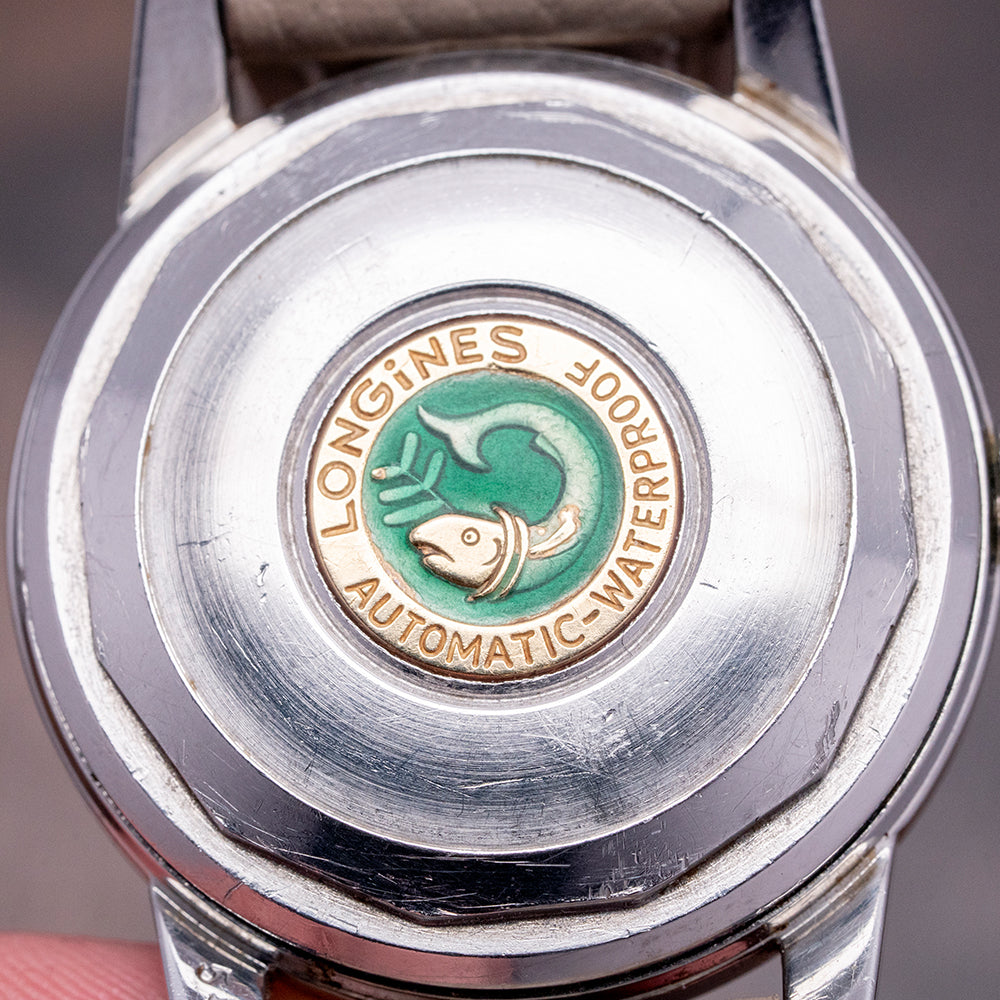 Here we have a 1950s Longines Conquest Automatic 9000-1 with a 35mm unpolished stainless Steel case that curves over your wrist with thick tapered lugs and a lug-to-lug length of 42.5mm and a thickness of 12mm, ensuring the watch is a comfortable fit. On the right, a push/pull signed coin-edged crown. The thin bezel holds a domed crystal above a stunning dial with an even patina, attractive applied double-faceted indexes, and 12, 3, 6 and 9 numerals mark the hours, and an inner minute track has an applied triangle at the cardinal points. Elegant dauphine hands are complemented by a delicate tapered second hand; at 12 o’clock, we have the applied Longine motif with Automatic in an attractive font; at 6 o’clock, “Conquest.” On the reverse, a screw-down case back with the golden medallion embossed Conquest fish and green enamel in the centre, inside an automatic Longines Cal. 19AS, 19 jewels, beating at a leisurely 18,000 beats per hour. It is paired with a well-suited 18mm strap.