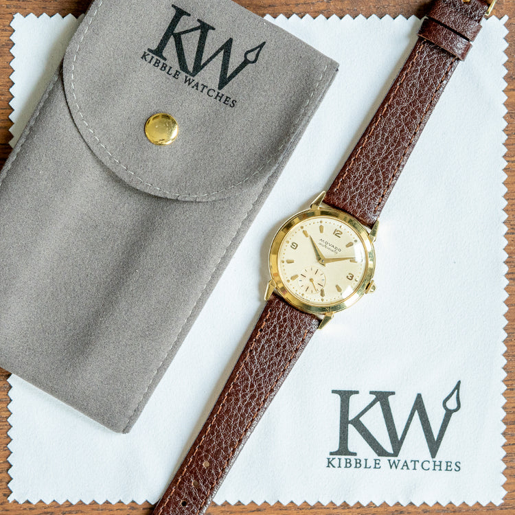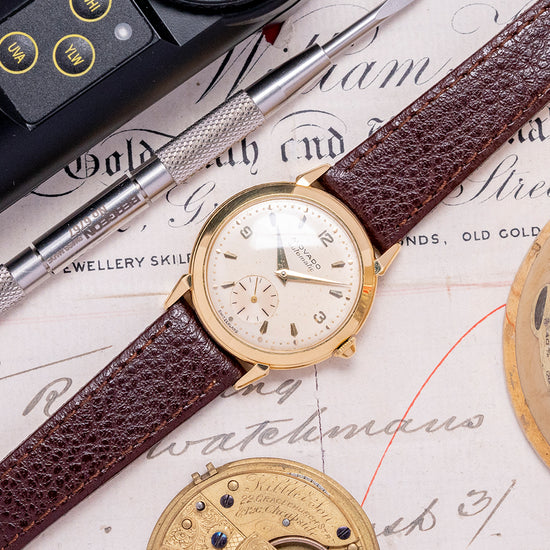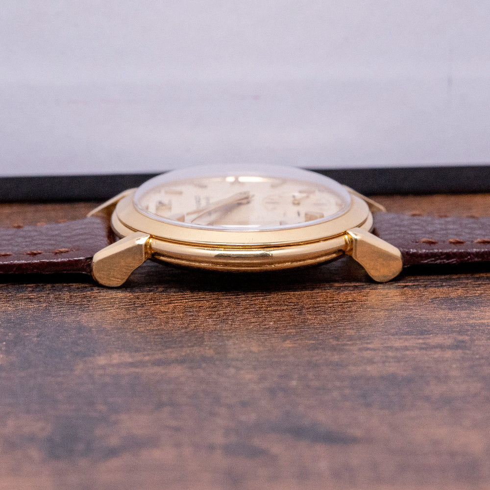 Here we have a classic 1950s Movado 18ct Gold "Calatrava" Bumper Automatic with a curvaceous 18ct Yellow gold 32mm round case. The case gently curves toward the elegant horned lugs. Its smooth flanks lead to a lug-to-lug length of 38mm and a case thickness of 9mm, ensuring a comfortable fit on the wrist. On the right side is a domed coin-edged crown. A polished chamfered bezel holds a domed crystal above the off-white/cream dial and has an outer minute track of pips surrounding attractive applied gilded Arabic numerals and faceted indexes marking the hours. The hour and minute hands are tapered alpha-shaped. At 6 o’clock, a sub-seconds with decorative engine turning; at 12 o’clock, we have the Movado motif and “Automatic” completes this sophisticated timepiece. On the reverse, an 18ct yellow gold snap-on case back, inside an early in-house bumper Automatic Movado Cal. 115, 17 jewels movement. It comes paired with an 18mm leather strap secured by an 18ct yellow gold pin buckle.