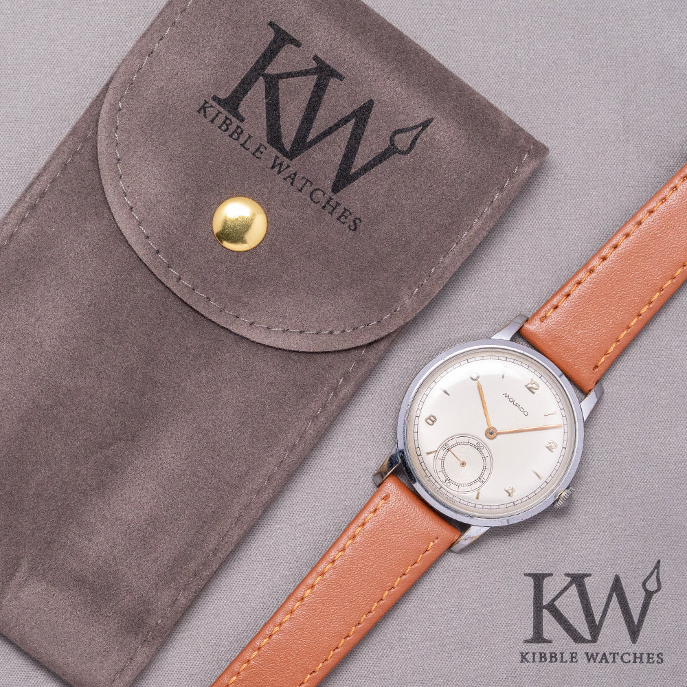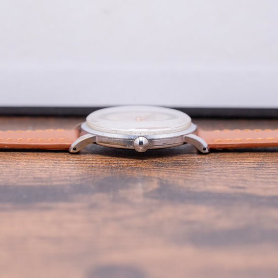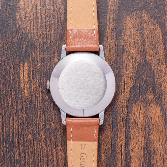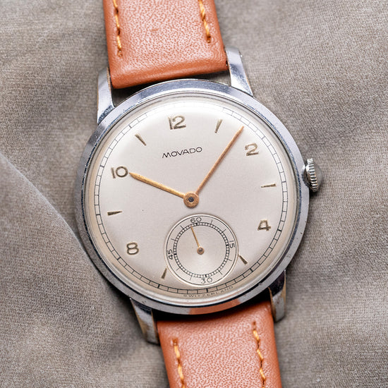 Here we have a classic 1950s Movado 'Calatrava' Manual Cal. 125, featuring a curvaceous 33.5mm chrome case that gently curves over your wrist, complemented by finely tapered drilled lugs. Its slim profile leads to a lug-to-lug length of 40.5mm and a case thickness of just 8.5mm, ensuring a comfortable fit. On the right side, a coin-edged domed crown. A smooth bezel holds a domed crystal above a striking “Calatrava” silver dial. Outer minutes railroad surrounds gold-toned applied Arabic numerals and dagger indexes marking the hours; elegant gold-toned stick hands sit majestically in the centre; at 6 o’clock, a recessed running seconds, at 12 o’clock, we have the Movado motif completes this sophisticated vintage dress watch. On the reverse, a solid case back, inside a manually wound Movado Cal. 125, 17 jewels, beating at a leisurely 18,000 beats per hour. It comes paired with a 17mm well-suited leather strap.