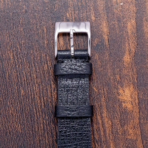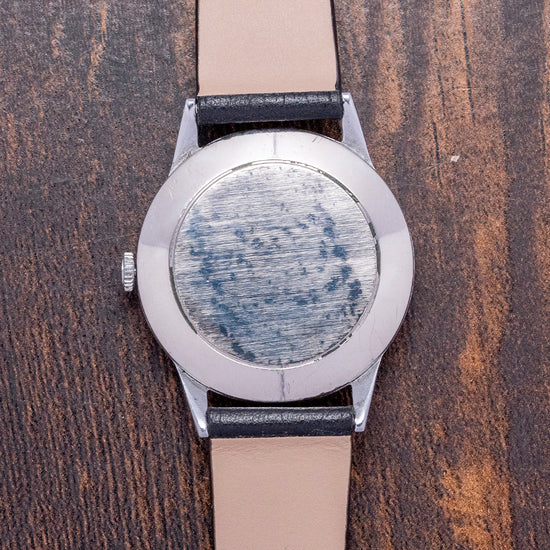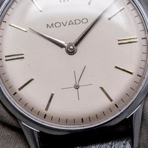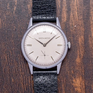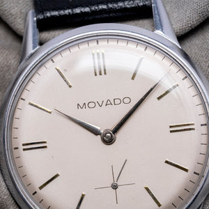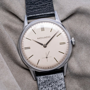 Here we have a classic 1950s Movado 'Calatrava' Manual Cal. 125 58103 with a curvaceous 34.5mm stainless steel case that gently curves over your wrist with finely tapered lugs. Its slim profile leads to a lug-to-lug length of 42mm and a case thickness of 9mm, ensuring a comfortable fit. On the right side, a coin-edged crown. A smooth bezel holds a domed crystal above a striking “Calatrava” off-white dial. Outer minutes surround delicate single and double applied batons marking the hours; elegant Alpha steel hands sit majestically in the centre; at 6 o’clock, a crosshair running seconds, at 12 o’clock, we have the Movado motif completing this sophisticated vintage dress watch. On the reverse, a solid case back, inside a Manually Wound Movado Cal. 125, 17 Jewels beating at a leisurely 18,000 Beats per hour. It comes paired with an 18mm well-suited leather strap.