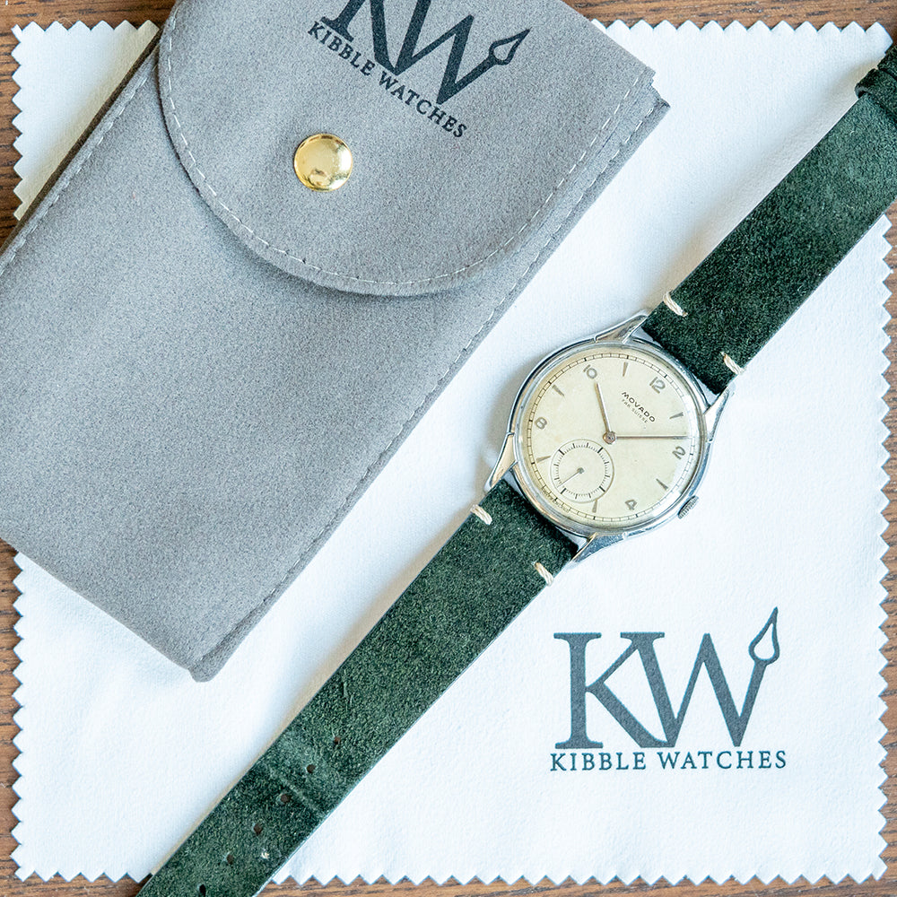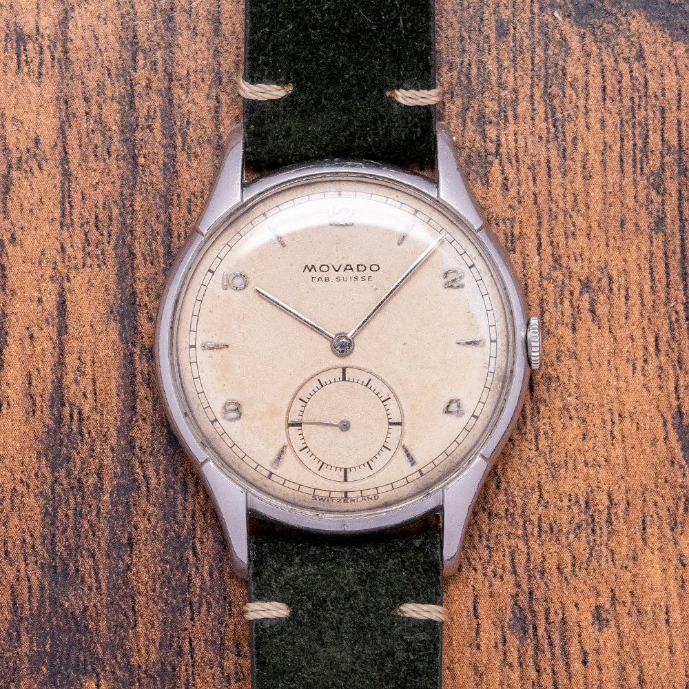 Here, we have a lovely example of the 1950s Movado Fab Suisse Oversized "Calatrava" with a 35mm stainless steel case that gently curves over your wrist thanks to the finely tapered lugs, which form part of the slim bezel for a sculpted profile. A lug-to-lug length of 43mm and a case thickness of just 8mm ensure a comfortable fit. On the right side is a signed coin-edged push/pull crown. A smooth, thin bezel holds a domed crystal, showcasing the attractive cream “Calatrava” dial. An outer minute rail track surrounds applied steel 12, 2, 4, 8 and 10, and dagger-shaped indices mark the hours; slim stick hands sit above a large, slightly recessed sub seconds at 6 o’clock. “Movado Fab Suisse” sits at noon, completing this sophisticated dress watch. On the reverse, a solid case back, inside is a manually wound Movado Cal. 125, 15 jewels, beating at a leisurely 18,000 beats per hour. The watch comes paired with a well-suited 18mm after-market suede vintage style strap and pin buckle.