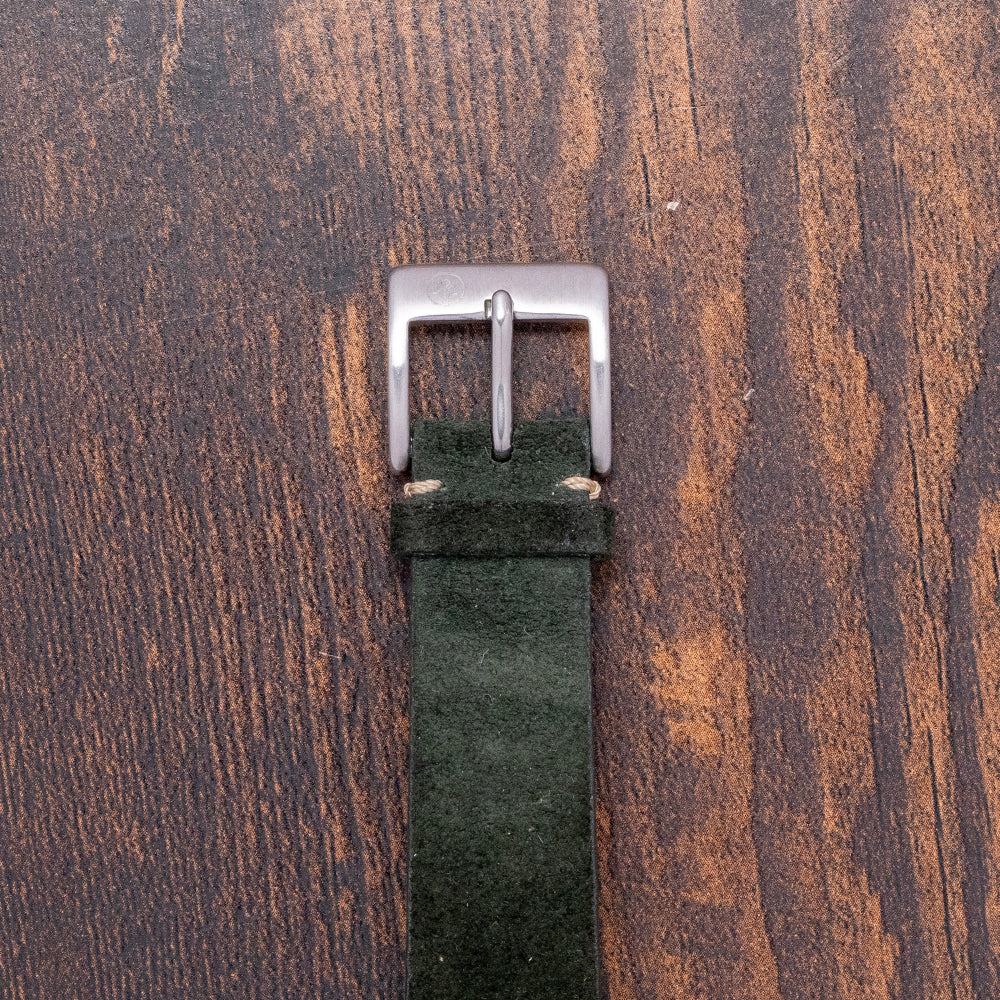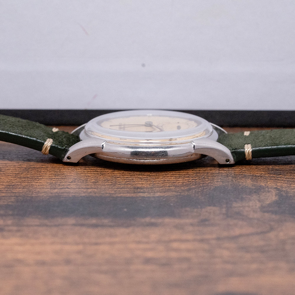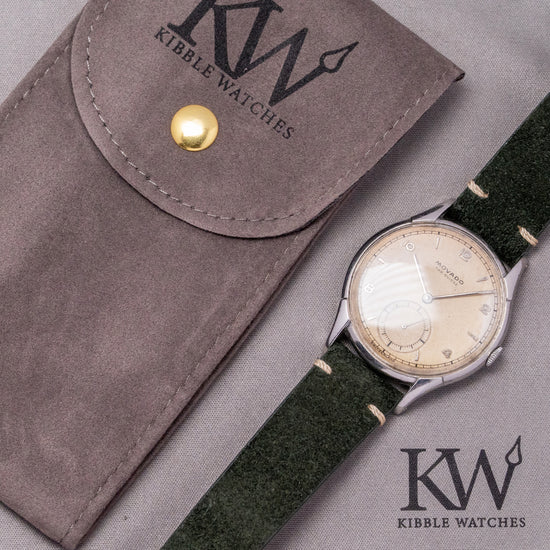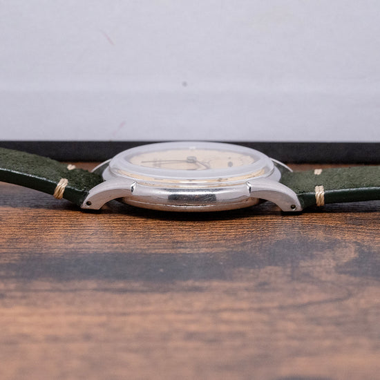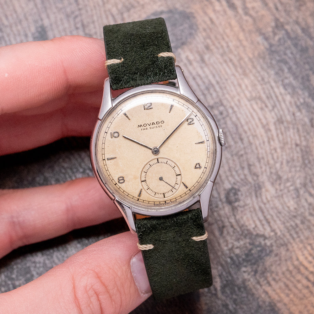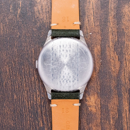Here, we have a lovely example of the 1950s Movado Fab Suisse Oversized "Calatrava" with a 35mm stainless steel case that gently curves over your wrist thanks to the finely tapered lugs, which form part of the slim bezel for a sculpted profile. A lug-to-lug length of 43mm and a case thickness of just 8mm ensure a comfortable fit. On the right side is a signed coin-edged push/pull crown. A smooth, thin bezel holds a domed crystal, showcasing the attractive cream “Calatrava” dial. An outer minute rail track surrounds the applied steel numbers 12, 2, 4, 8, and 10, and dagger-shaped indices mark the hours; slim stick hands sit above a large, slightly recessed sub-seconds dial at 6 o’clock. “Movado Fab Suisse” sits at noon, completing this sophisticated dress watch. On the reverse, a solid case back, inside is a manually wound Movado Cal. 125, 15 jewels, beating at a leisurely 18,000 beats per hour. The watch comes paired with a well-suited 18mm after-market suede vintage-style strap and pin buckle.