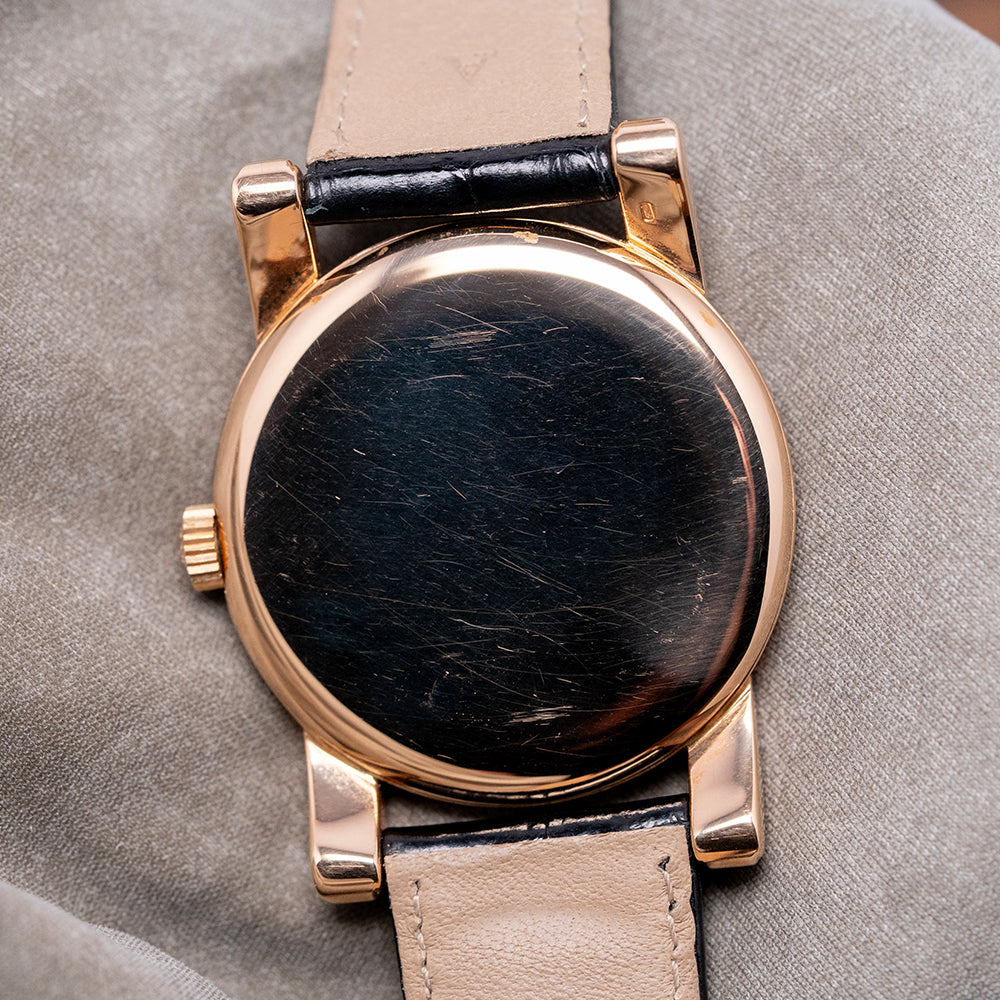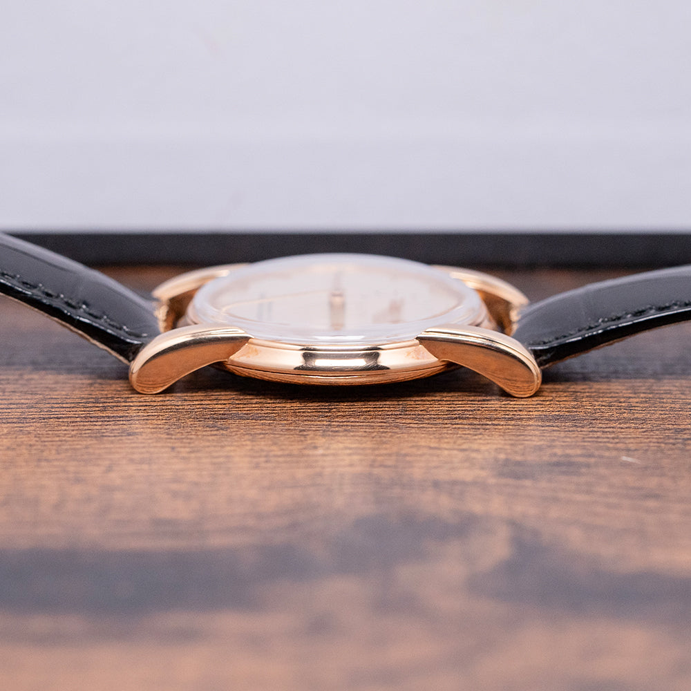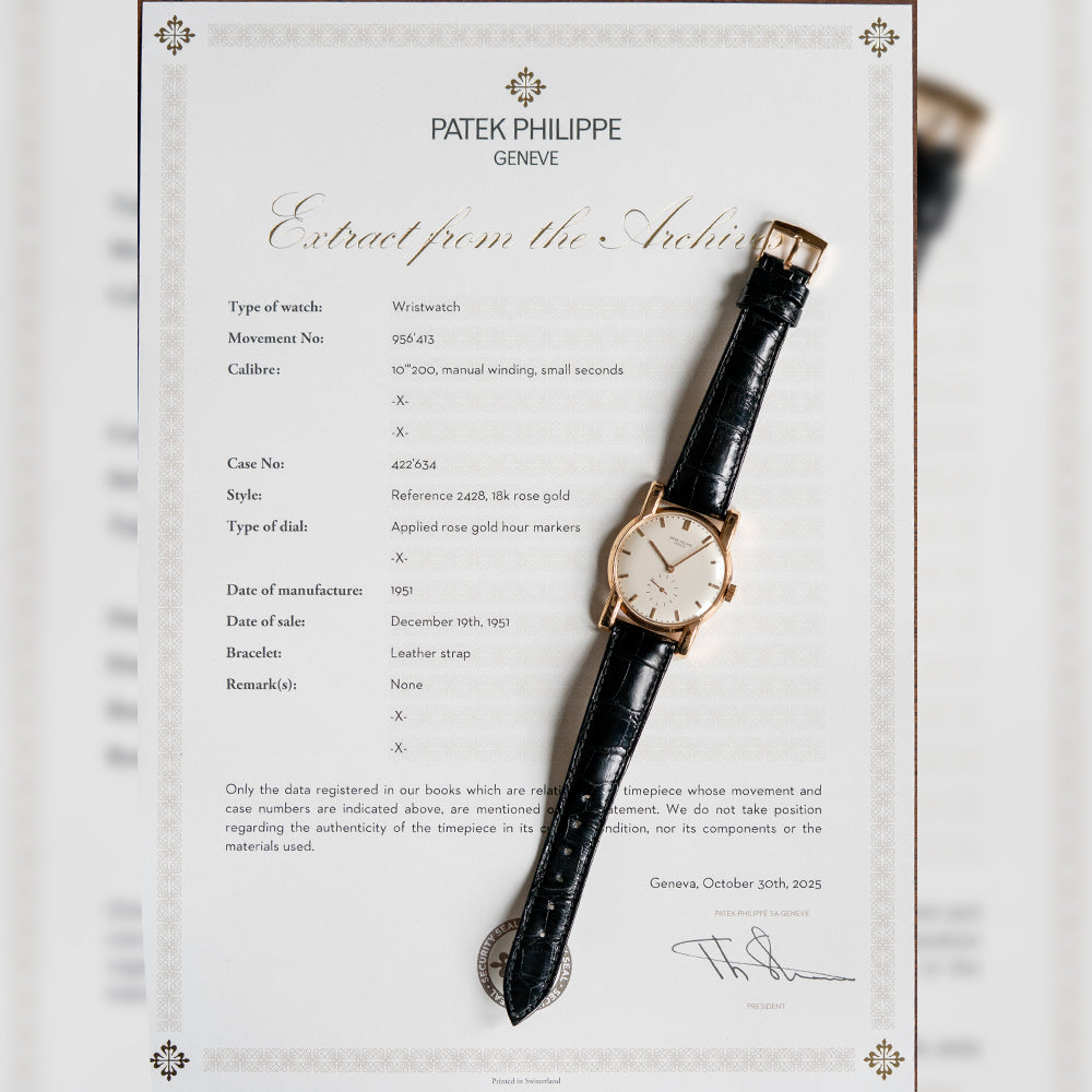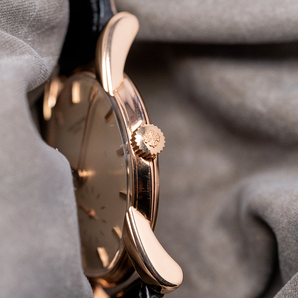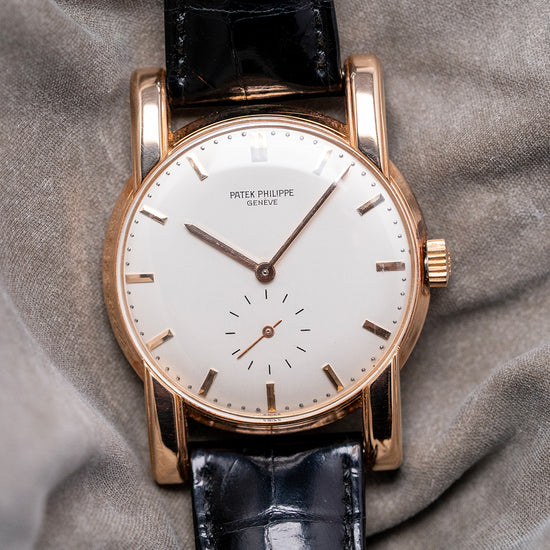 Here we have a rare, beautiful 1950s Patek Philippe Calatrava featuring a 34mm 18ct Rose Gold, as confirmed by the Patek Extract, stepped case that curves over your wrist with rounded, straight, hallmarked thick lugs. Its curvaceous slim flanks lead to a comfortable lug-to-lug length of 42.2mm and a case thickness of just 7.5mm. On the right side, there is a coin-edged signed crown. A thin bezel holds a domed crystal above the charismatic white Calatrava dial. An outer minute track of gold pips has faceted 18ct rose gold baton indexes that magically catch the light as you rotate your wrist. Delicate 18ct rose Gold baton hands sit majestically above a sub dial at 6 o’clock, and at noon, we have the Patek Philippe motif completing this sophisticated, perfectly balanced dress watch. On the reverse, a solid 18ct rose gold snap-off case back, inside a manually wound Patek Cal. 10’’’200, 18 jewels, beating at 19,800 beats per hour, the 10''' (10-ligne) is a traditional measurement indicating the size of the movement. This incredibly well-finished movement was introduced in 1947. It remained in production until 1965, reinforcing its refined craftsmanship. It is paired with an 18mm Patek Philippe leather strap and Patek Philippe 18ct rose gold pin buckle. The watch comes with its Patek Philippe Extract from the Archives.