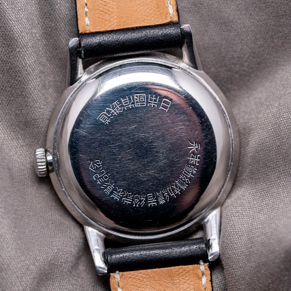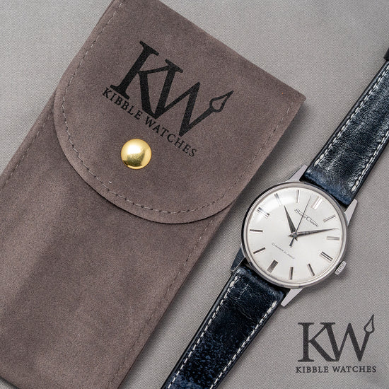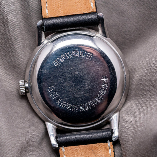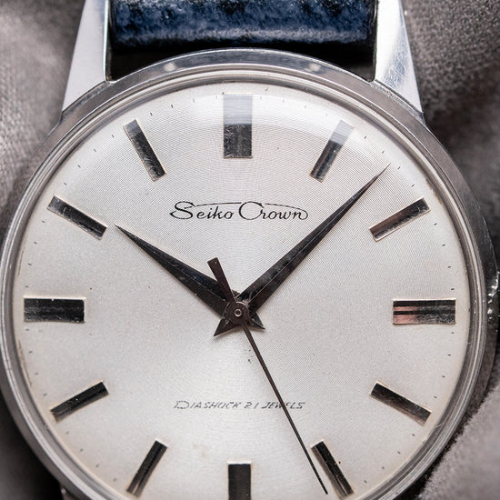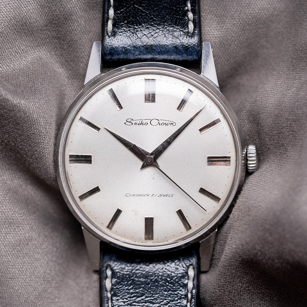 Here we have an early, rarely seen 1950s Seiko 'Crown' Seikosha Cal. 560 34.5mm Steel J14096, launched in 1959. It was positioned between the Seiko Marvel and Grand Seiko; the technical improvements to the movement paved the way for future Grand Seikos, which eventually replaced the Crown. Featuring a 34.5mm round stainless steel case that sits comfortably on your wrist with straight, slightly tapered, flat-ended drilled lugs. Its curved flanks lead to a lug-to-lug length of 42mm and a case thickness of 10mm. On the right side, a domed coin-edged crown. Its smooth bezel holds a domed crystal above a white dial. Applied polished double and single batons mark the hours. Elegant Dauphine hands are complemented by a tapered second hand. Completing this distinctive dress watch at noon, we have the ‘Seiko Crown motif and at 6 o’clock, ‘Diashock 21 Jewels’. On the reverse, a snap on case back engraved in Japanese "Commemorative Award For The Port's Effective Performance - Japanese State Owned Railway". Inside an early manually wound Seikosha Cal. 560, 21 jewels, beating at a leisurely 18,000 beats per hour. Seiko designed this movement to be marginally larger for improved accuracy and easier maintenance. It comes paired with a well-suited 18mm strap and pin buckle.