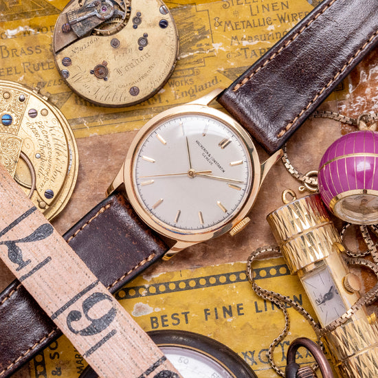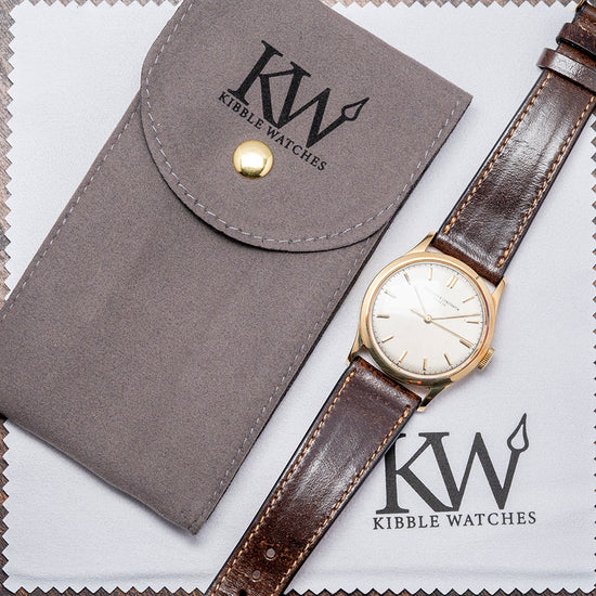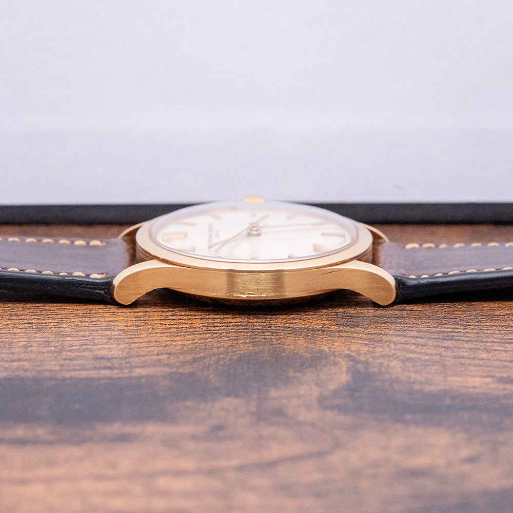 Here we have a beautiful 1950s Vacheron Constantin "Calatrava" Cal. 454/5B with a curvaceous 34mm 18ct Yellow Gold case, slender tapered lugs, a gentle curve of the flanks leading to a lug-to-lug length of 40.5mm and a case thickness of just 9mm ensure a comfortable fit and a classic profile. On the right side is a yellow Gold crown. A thin, smooth bezel holds a domed crystal above a cream “Calatrava” dial; an outer minute track precisely executed surrounds applied facet baton indexes mark the hours; slender stick hands are complemented by a tapered second hand and at noon, we have the Vacheron & Constantin motif completing this beautifully crafted dress watch. On the reverse is an 18ct yellow gold solid case back with “LD” engraved and stamped on the inside with its relevant hallmarks, inside a manually wound Vacheron Cal. P454/5B, 17 jewels, beating at a leisurely 18,000 beats per hour. The watch comes paired with a well-suited 20mm leather strap.