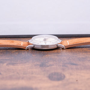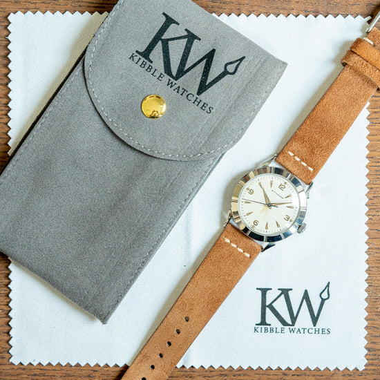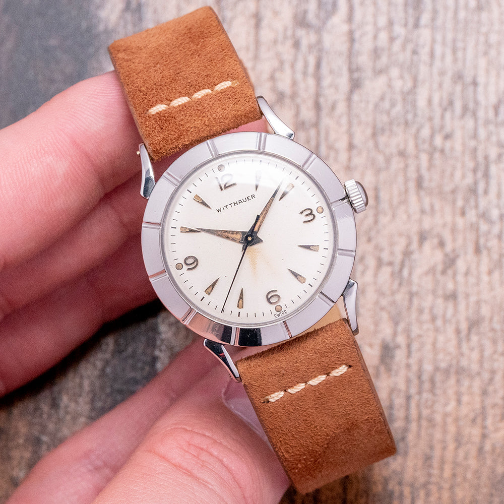 Here we have a 1950s Wittnauer Dress Watch Fancy Case 2605 with a stunning 32mm stainless steel case that curves over your wrist with attractive dog-leg drilled lugs, and a lug-to-lug length of 38mm and a case thickness of 10mm ensures a comfortable fit. On the right side is a crown with a coin edge. An attractive polished bezel has deep engraved grooves at the hour and holds a domed acrylic crystal above a white dial. An outer minute track has Radium-coated pips surrounding applied Arabic 12, 3, 6, 9 and dagger indexes coated in Radium, marking the hours. Elegant Dauphine hands filled with Radium are complemented by a tapered sweeping second hand; at 12 o’clock, we have the Wittnauer motif completing this attractive dress watch. On the reverse, a screw-down case back with engine turned circular pattern, inside a manually wound Wittnauer Cal. 11ESB, 17 jewels, beating at a leisurely 18,000 beats per hour. The watch comes paired with an 18mm brown suede strap with a pin buckle, which suits the watch perfectly.
