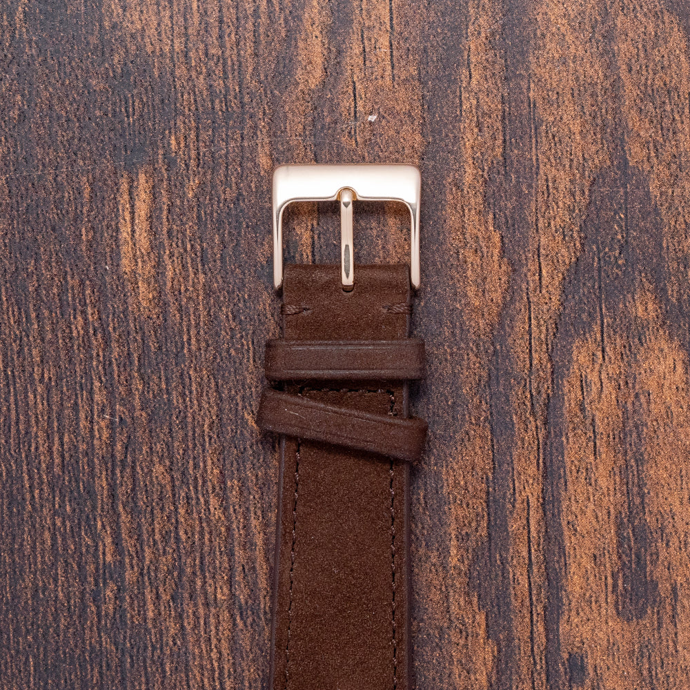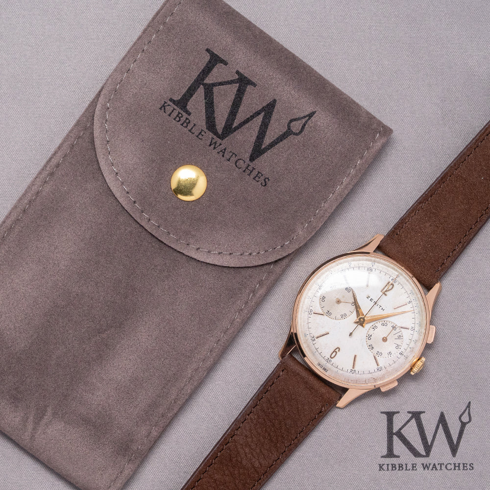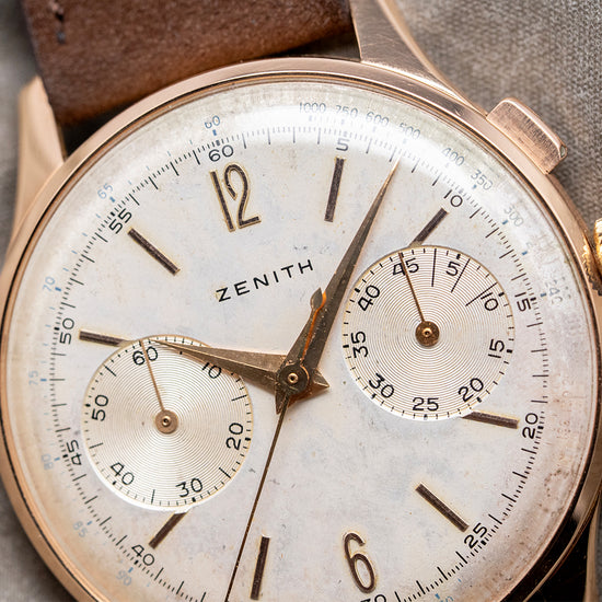We have here a stunning example of a 1950s Zenith 'Stellina' 156 D. Its oversized for the time 37mm 18ct Pink Gold round case features finely tapered lugs. You can be sure of a comfortable fit on the wrist at 44.5mm lug-to-lug length and a thickness of 10.5mm. Rectangular pushers and a large crown sit on the right side. The case has a refinement that shouts out quality. The domed crystal sits proudly above the white dial. An outer Tachymetre is printed in black; the inner minute track is precisely executed, surrounding “12” and “6” Arabic numerals with elegant applied chamfered edge pink gold baton indexes to mark the hours, at 3 o’clock a 45-minute register and at 9 o’clock the continuous seconds register, each slightly recessed with a concentric circular pattern. This combination provides excellent symmetry to the watch. Delicate pink gold dauphine hands and a teardrop counterweighted chronograph seconds hand finish the dial with an understated sophistication that Zenith is famous for. On the reverse, there is a plain snap-on case back, inside a manually wound Zenith Cal. 156D, 17 jewels, 18,000 beats per hour. It is paired with a well-suited 19mm brown leather strap.