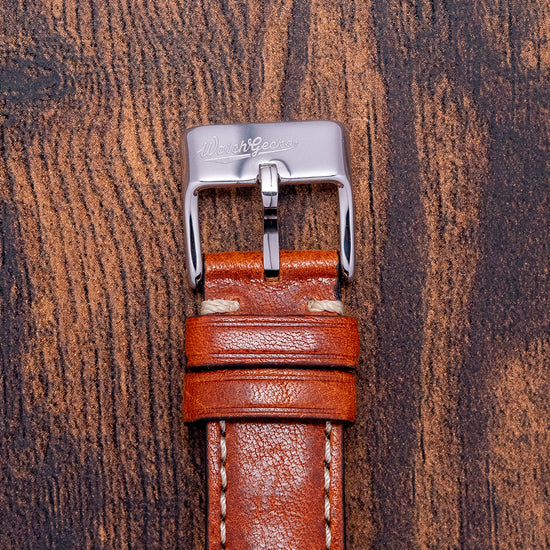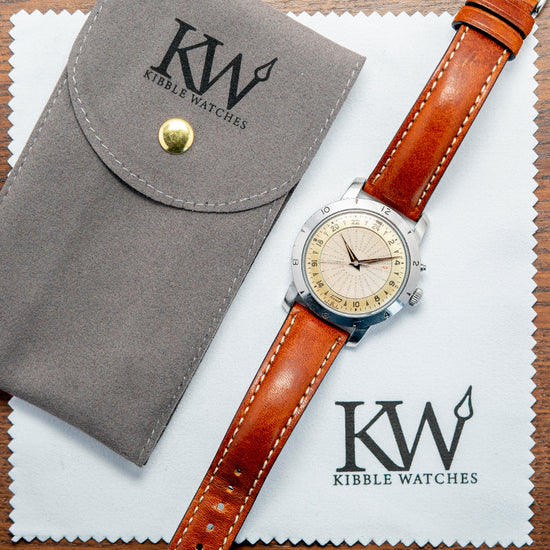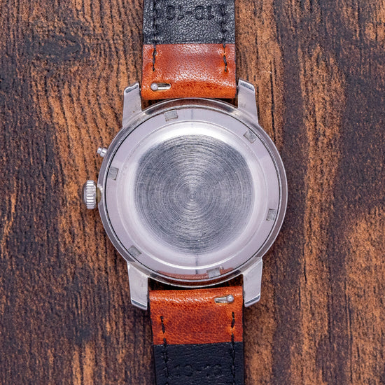 Here we have an early and rare 1953 Tissot Navigator Worldtimer Bumper Automatic 4002-1 with a round 36mm stainless steel case that comfortably sits on your wrist thanks to the thick curved lugs. Its slim profile leads to a lug-to-lug length of 43mm and a case thickness of 11mm. We have a pusher and a domed coin edge push/pull crown down the right side. To set the watch, you pull the crown out one position; as you rotate the crown in either direction, the hands move as well as the inner world cities; once you have selected your city, you then push in the pusher to set the hands independently to the correct time. A fixed bezel has an engraved 12-hour scale you can use to tell the time in a second-time zone conveniently. The domed crystal sits above this dynamic two-tone Worldtimer dial. An outer fixed ring has a 24-hour scale surrounding an inner rotating world city time zone disc, elegant Dauphine hands are complemented by a tapered second hand, and on the bottom edge, we have the Tissot motif completing this striking vintage traveller companion. On the reverse, a screw-down solid engine turned case back, inside a bumper automatic Tissot Cal. 28.5 N-21t, 17 jewels high-grade movement. It comes paired with a well-suited 18mm leather strap and pin buckle.